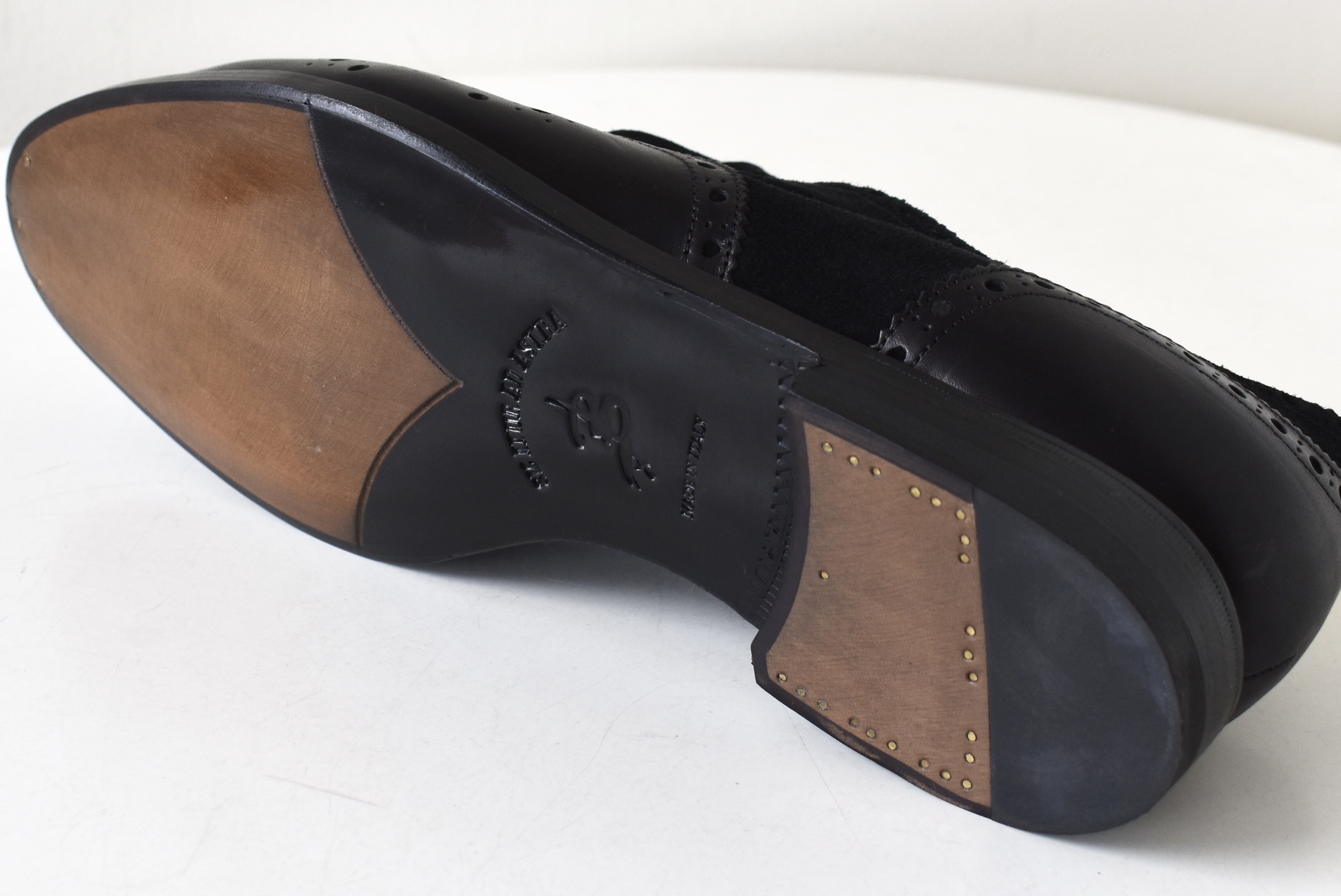 こちらは、イタリアの【Barbanera/バルバネーラ】。ハンサムな黒のウイングチップシューズは、スムースとスエード、素材がコンビになっております。洋服以上にクラシックなデザインが愛される革靴において、絶妙な塩梅で、個性を感じさせてくれます。