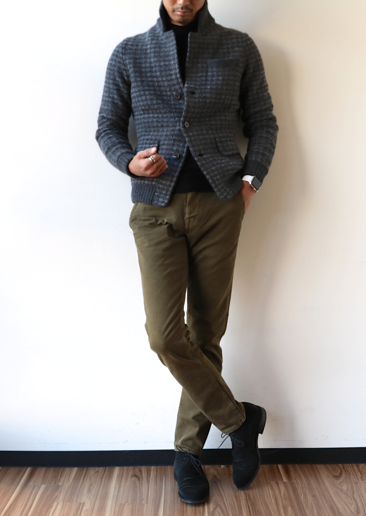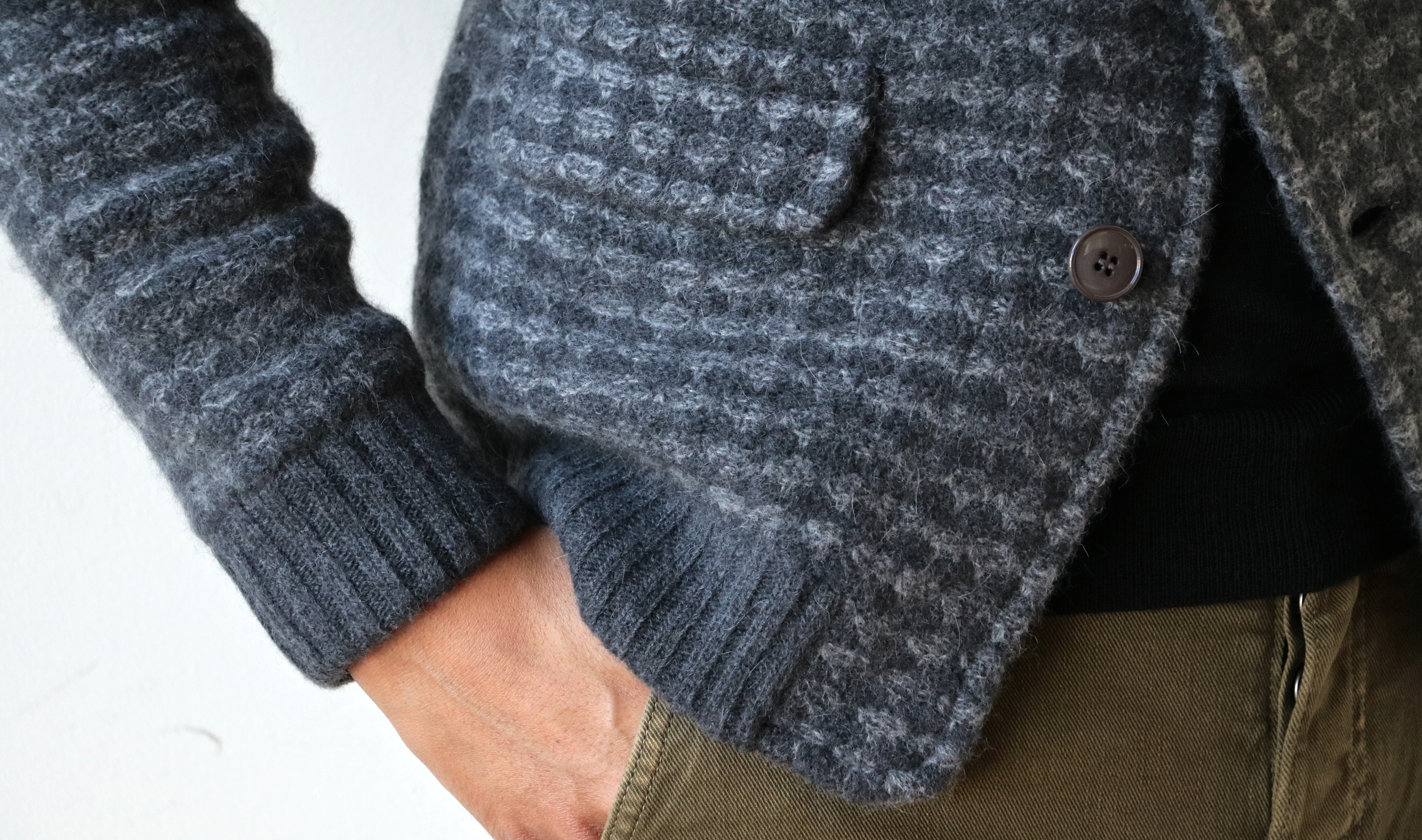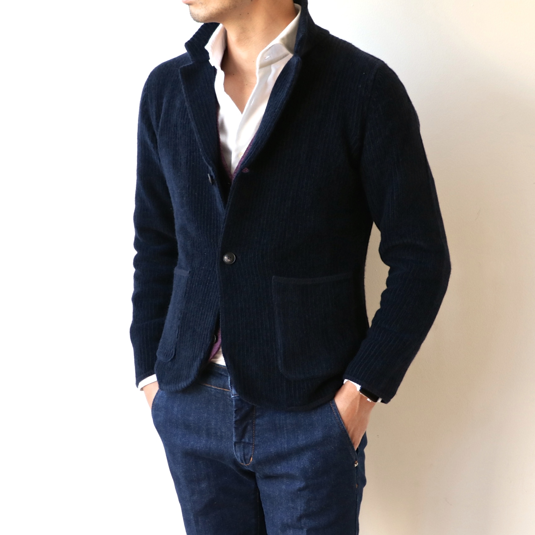 最大のポイントは、この編み地に有り。コーデュロイ風の編みで、凹凸感が生まれ、色の出方も良い意味で不均一。さり気なくセクシーなニットジャケット...個人的にはそう思っています。