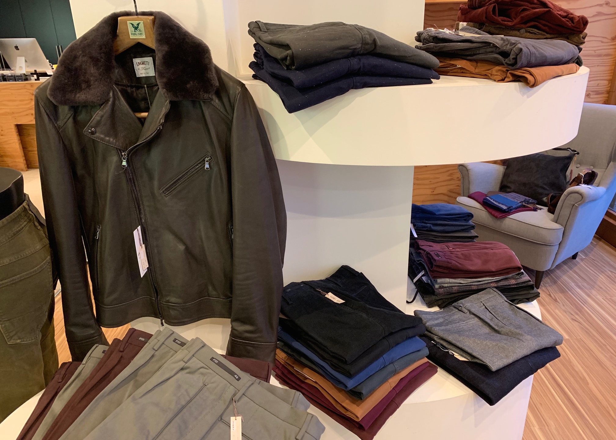 マガジーノで特に人気があったのが【EMMETI/エンメティ】。本来なら蔵出しには出しません。...が、歳末の目玉商品として、特別にお出ししましょう。中綿入りのダブルライダース、襟のボアは釦式で取り外しが可能。ダークブラウンのレザーは、ブラックよりもまろやかで、大人の色気が漂うのではないでしょうか。