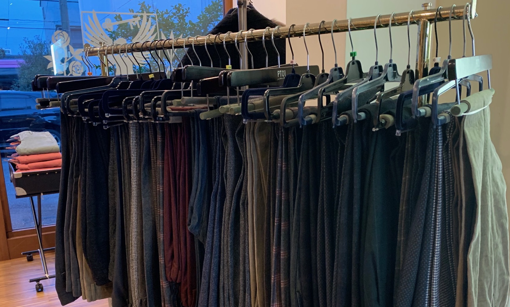 今回の目玉商品と言えば、パンツ。たくさんあるので、サイズ別に陳列しています。
