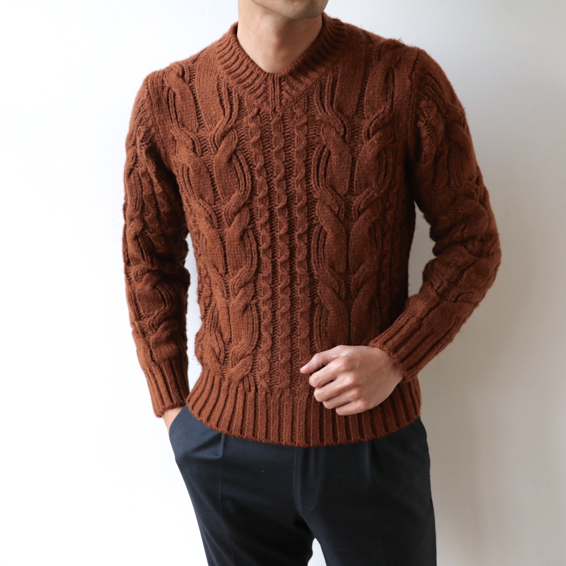早々にコレ良いな!!...と声が漏れたのは、大柄のケーブル編みセーター。浅Vの襟元が良いですし、冬の室内着はこんな雰囲気のあるセーターをシンプルに着ていたいものです。煉瓦色のテラコッタも良いではありませんか。