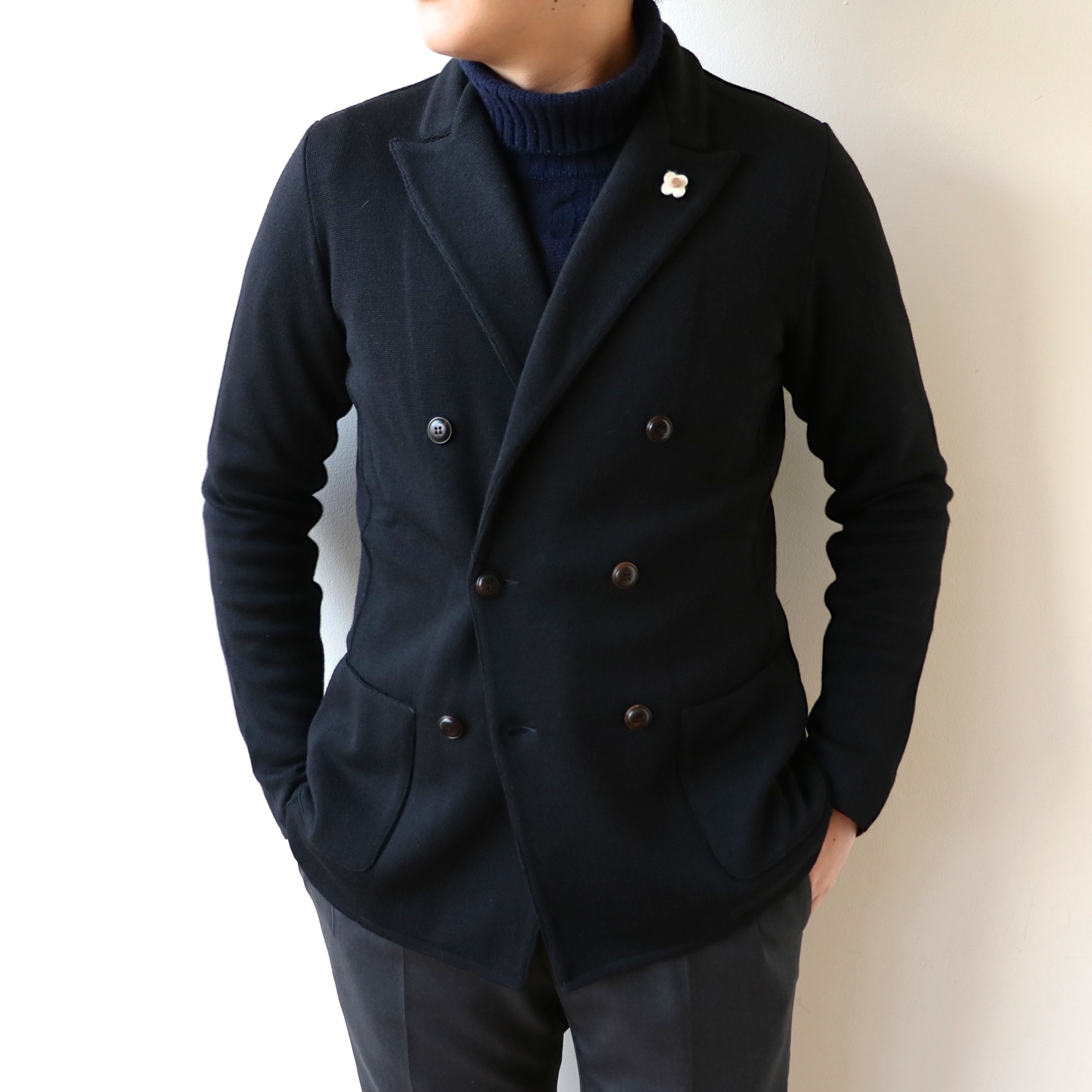 最後は、ラルディーニのニットジャケット。ドレッシーなダブルブレストも、ニットになると雰囲気がソフトになります。Mサイズが1点残っておりますが、48〜50サイズの方にお勧めです。