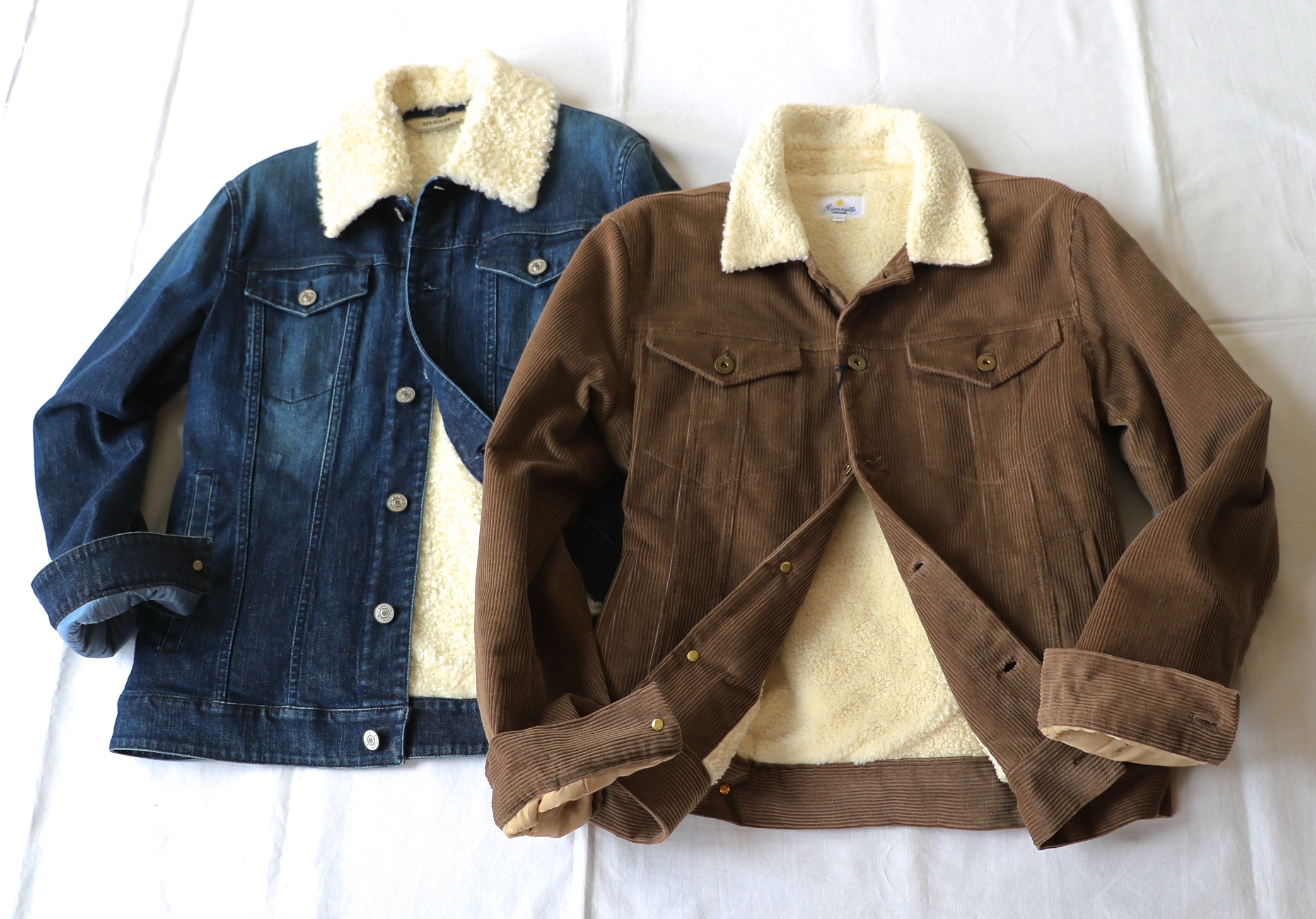 対して、ベージュのコーデュロイ(右)のGジャン型ブルゾンは、シャツファクトリーの【Giannetto/ジャンネット】のもの。両者とも、身頃の裏地はボア仕様、袖には薄い中綿が仕込まれていますので、防寒面に憂いはなさそうです。
