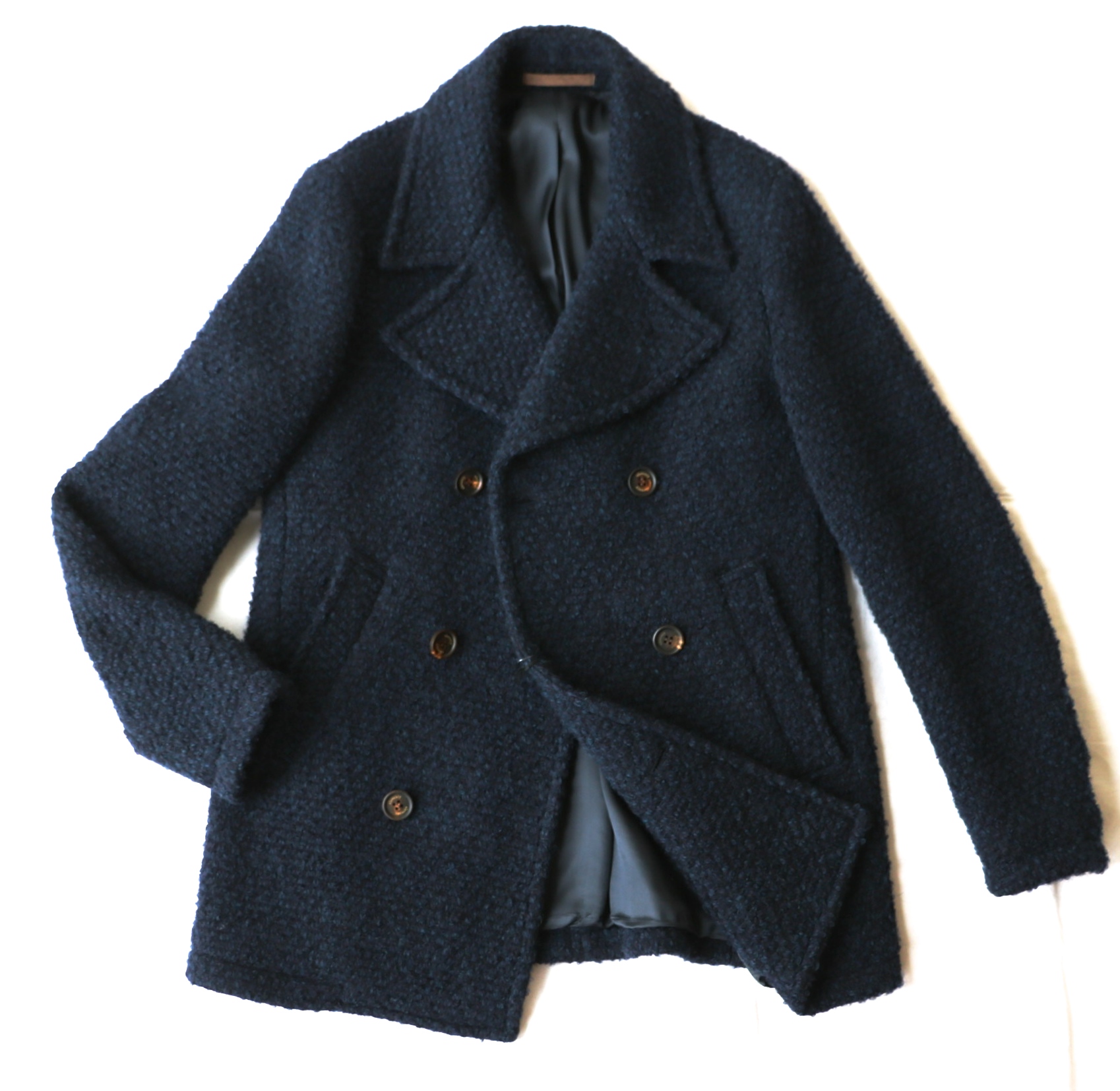 いつの年も堅調な人気を獲得するのが、Pコート。男性らしいダブルブレストの存在感に、スポーティな短い着丈。車も着たまま運転できそうです。ざっくりとした織りの生地に、冬らしい起毛感。うっすら青みが顔を覗かせるネイビーのPコートは、程よく個性があって、素敵な雰囲気を演出できるのでは...【eleventy/イレブンティ】の1着です。