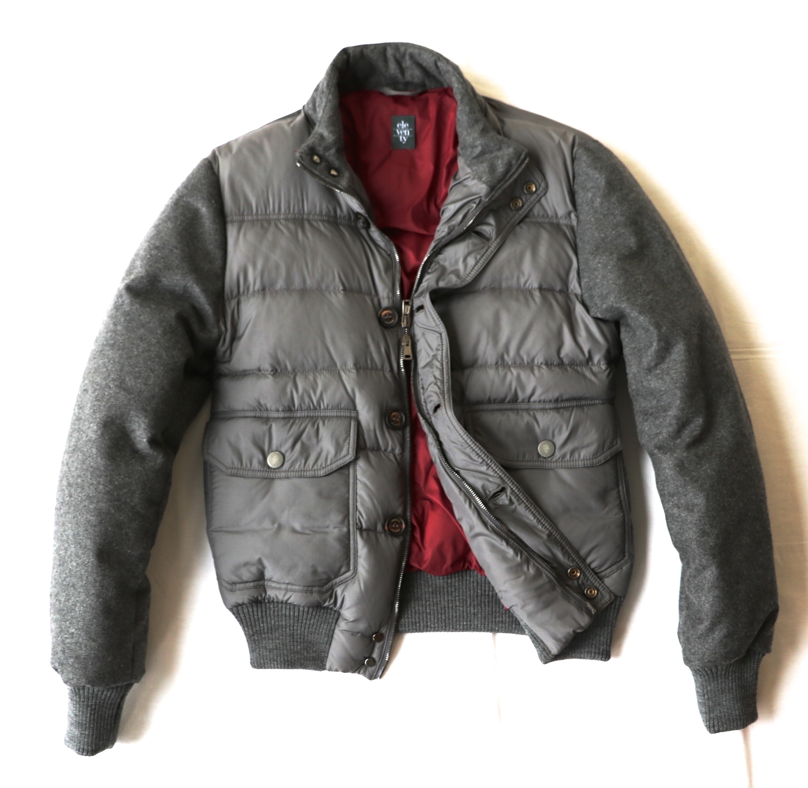 同様に程よく個性があるのが、ナイロンとウール生地を組み合わせたショートブルゾン。デザインの効いた見た目に惹かれますね。胴周り・袖部分ともにダウンが詰め込まれており、適度なボリューム感と防寒力を生み出します。こちらも【eleventy/イレブンティ】でした。