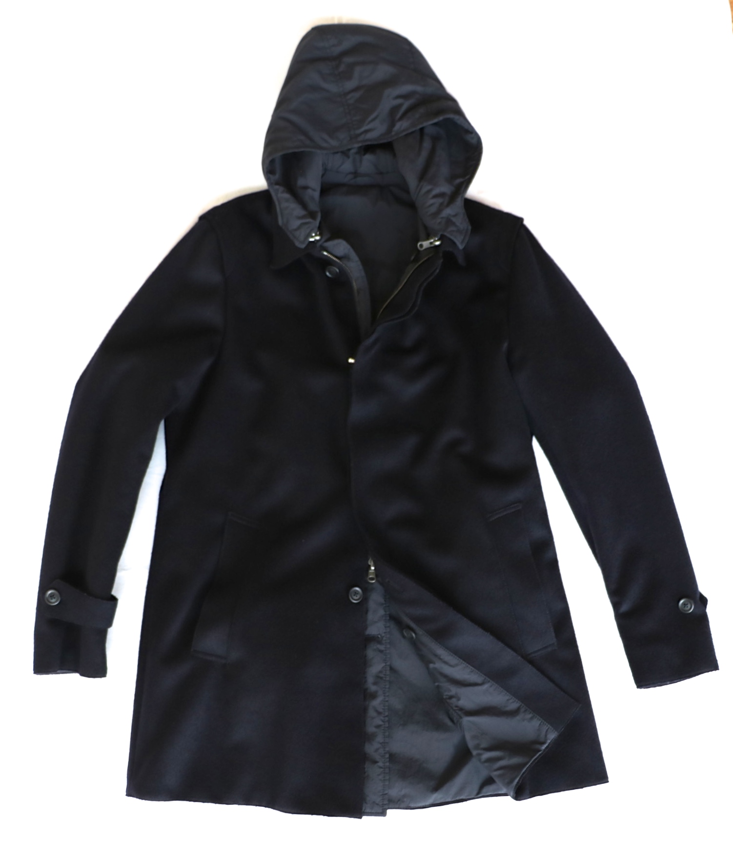 【LARDINI/ラルディーニ】からは、変わり種のコートがお一つ。一見ベーシックなウールコートに見えますが、