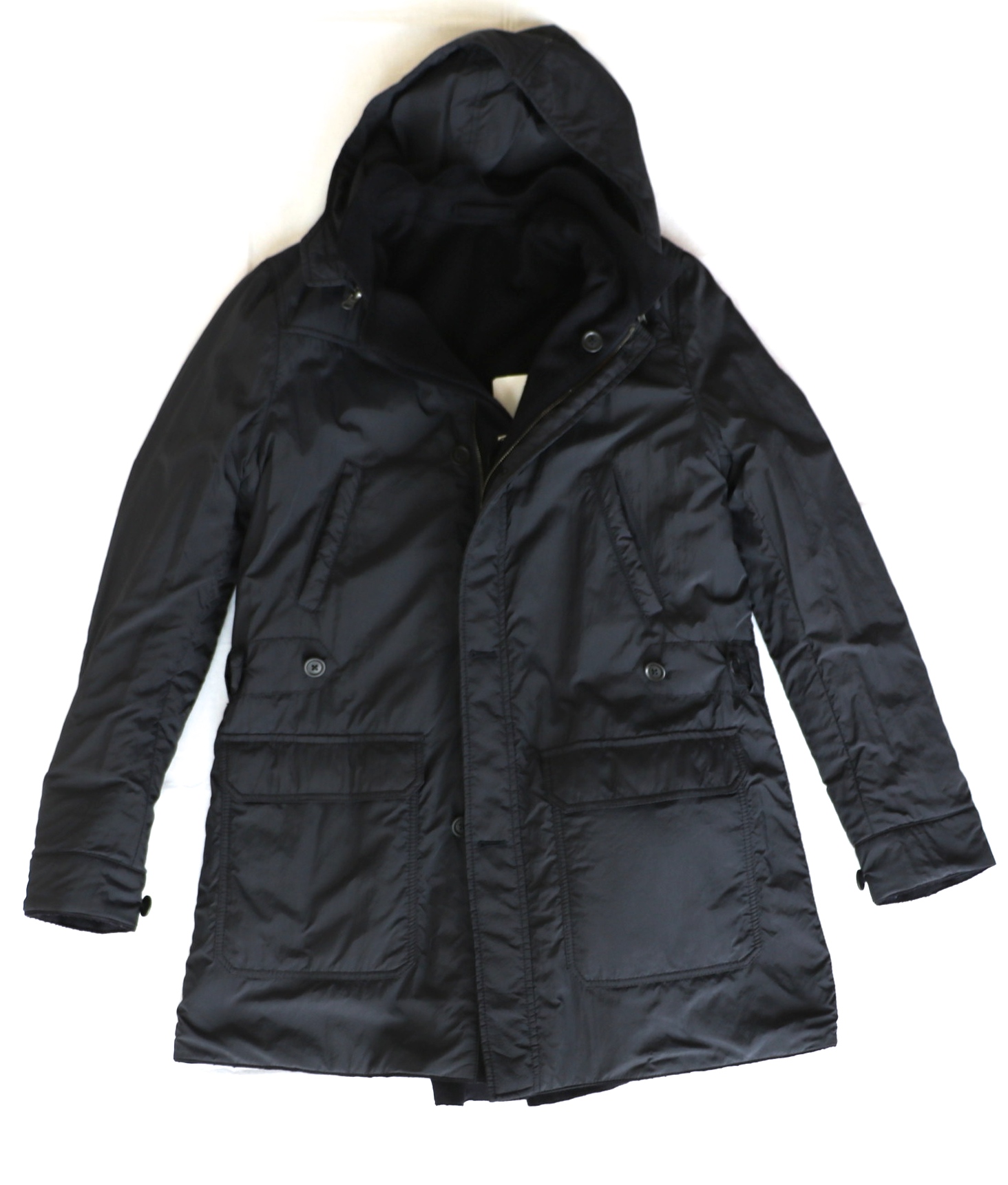 リバーシブルです。裏返すと、ナイロン素材のコートに様変わり。単純に2つのコートを楽しめることに加え、雪や雨の天候にも対応可能なスグレモノです。ナイロンのフードは取り外しが可能ですので、ビジネス用途にもご活用をいただけるのでは。48サイズが1点、買い手の方を心待ちにしています。