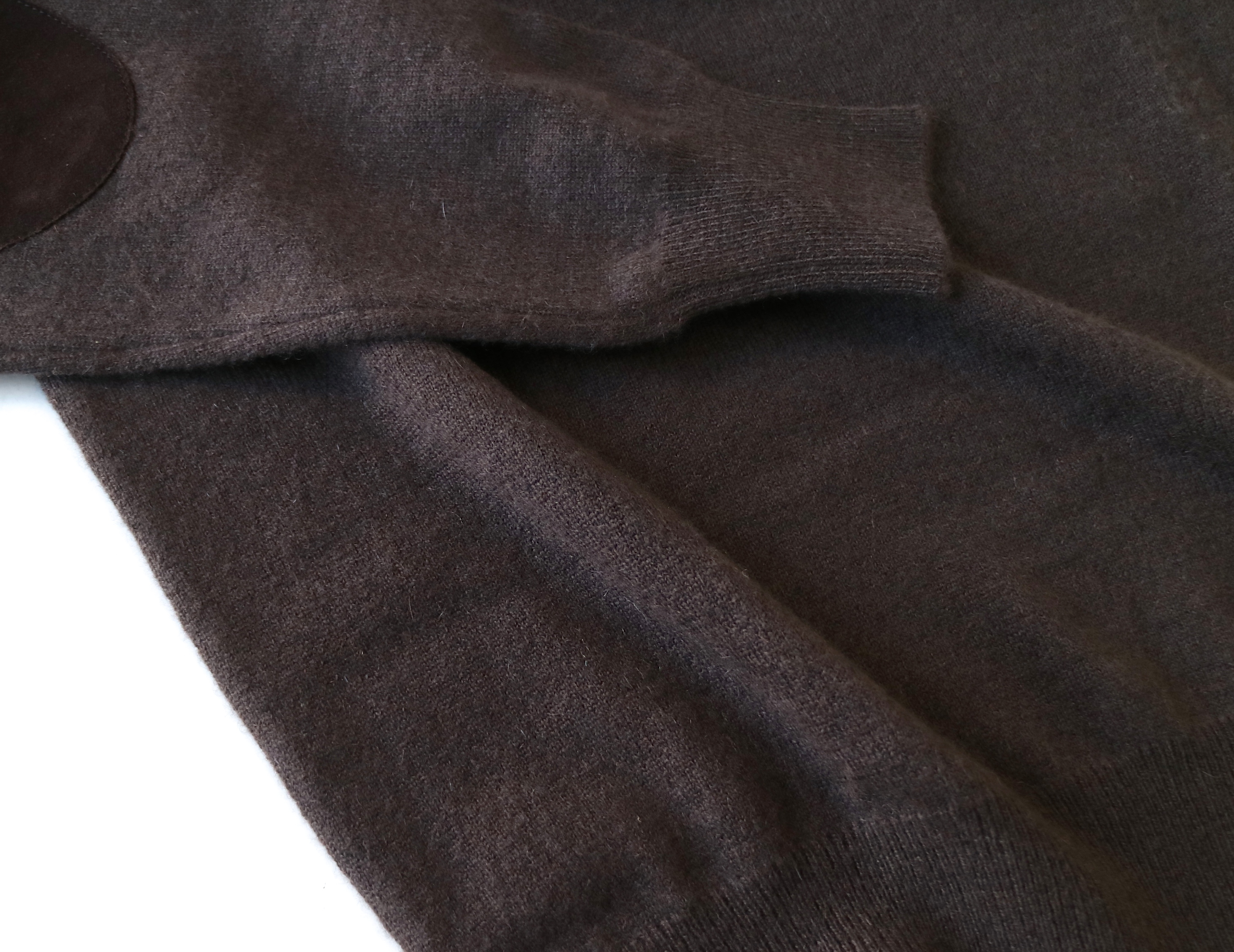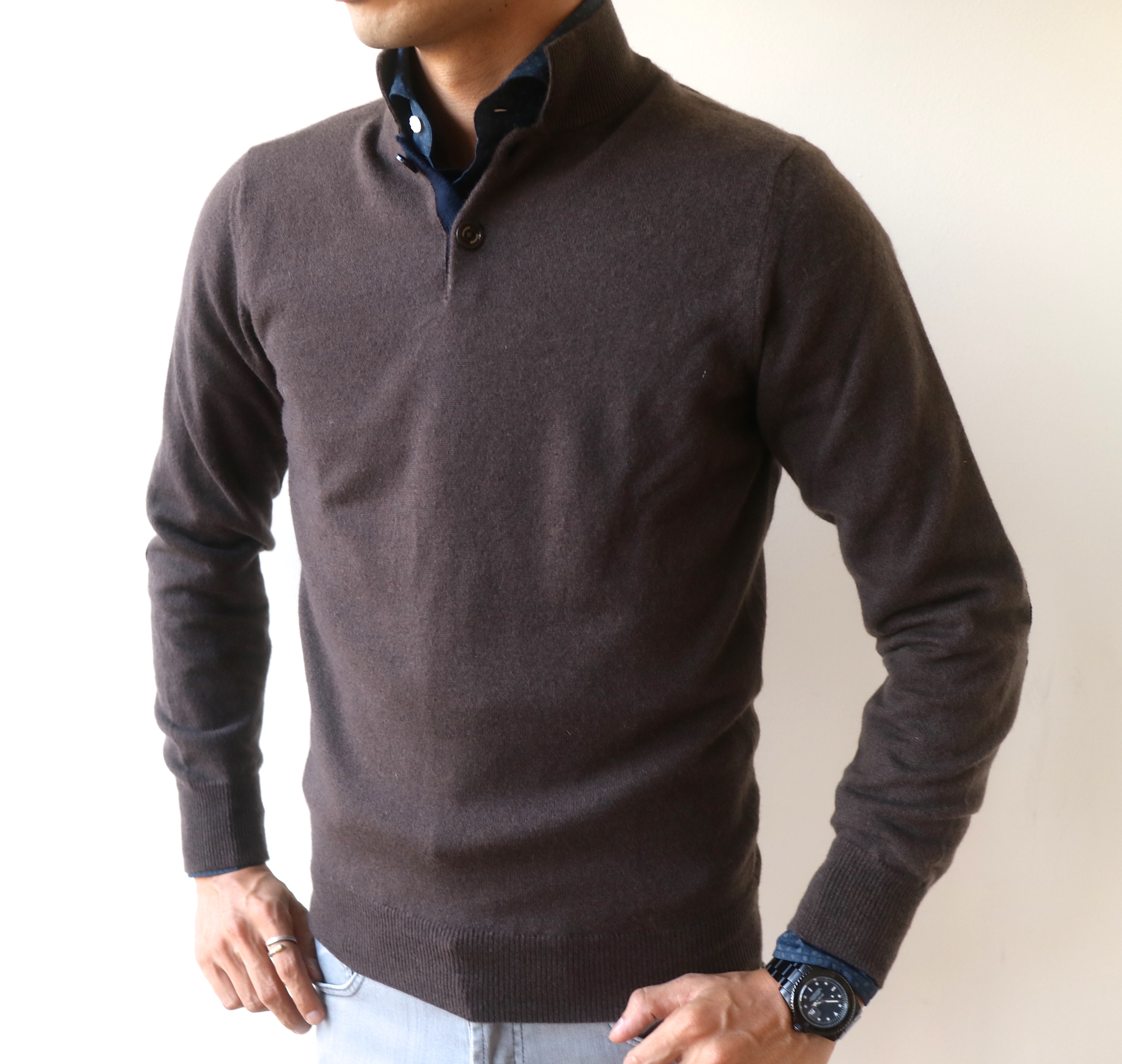 MODEL:カシミア混エルボーパッチ付き立ち襟プルオーバーニット