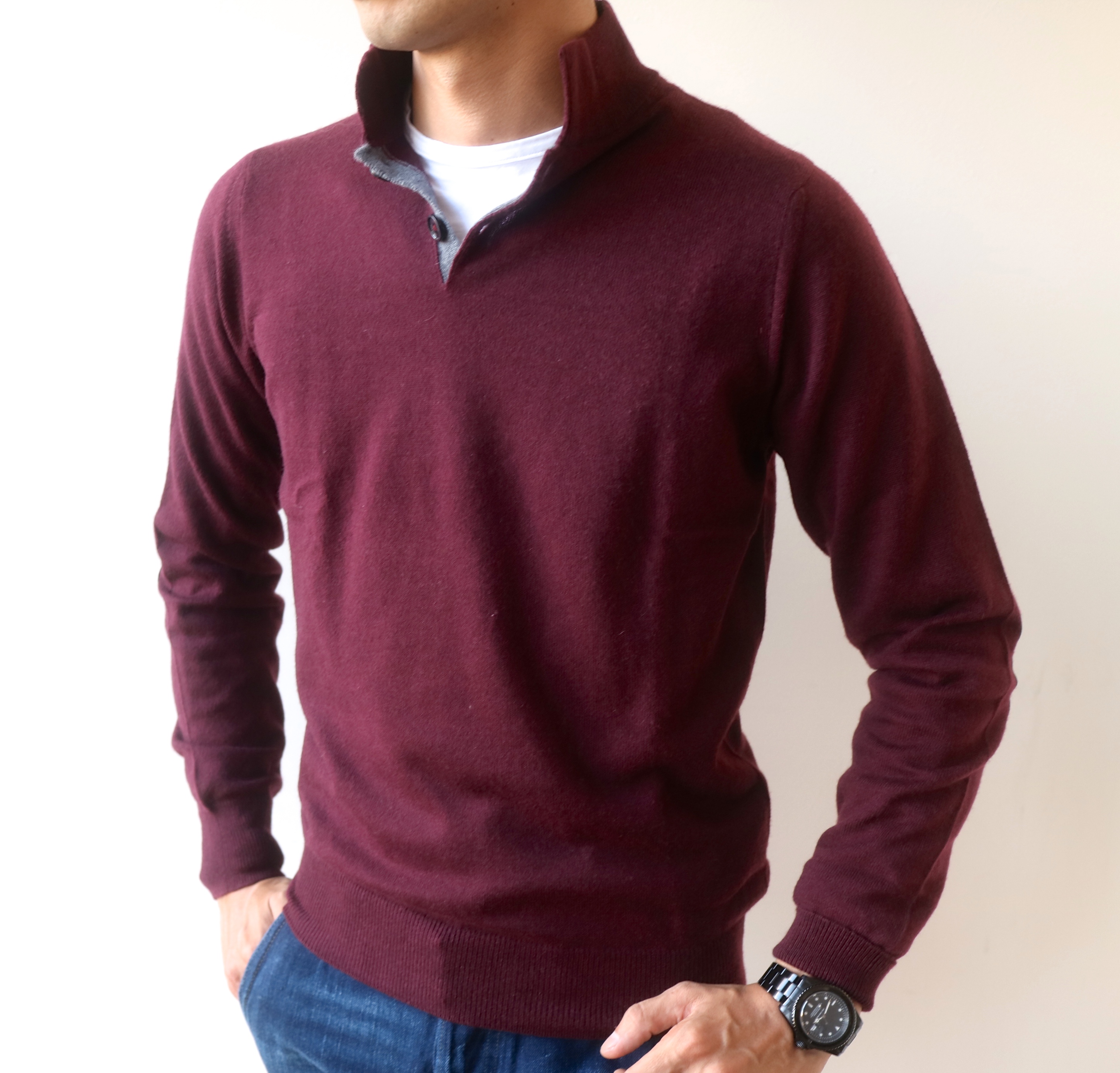 Vゾーンにアクセントを生み出す、立ち襟のニット。小振りな襟ですので、そのまま立ててご着用下さい。自然と表情が付く筈です。中にはシャツでもカットソーでも結構かと思います。