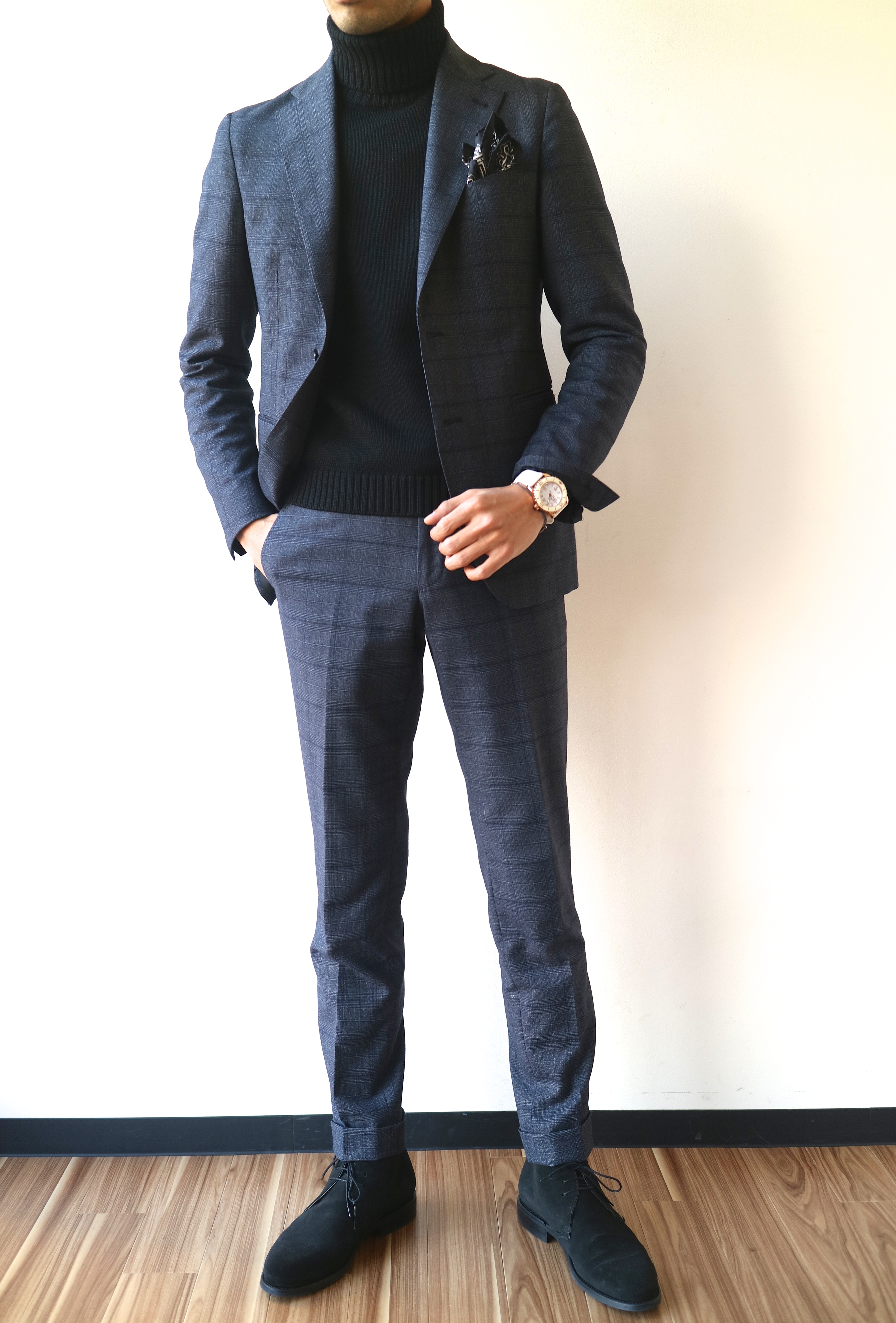 スーツを色々な着こなしに取り入れてみたい・・そう思って昨年購入をしたTAGLIATORE/タリアトーレのスーツ。今日の様な冷え込んだ日は、例えば、ZANONE ミドルゲージのタートルネックをインに着用してみたり。ちょっとしたパーティや粋に見せたいデートの際など、活躍の裾野が広いアイテム、スーツ。ベルトやブレスレットの小物使いで、もう少しカジュアル感を演出するのもアリかと思います。