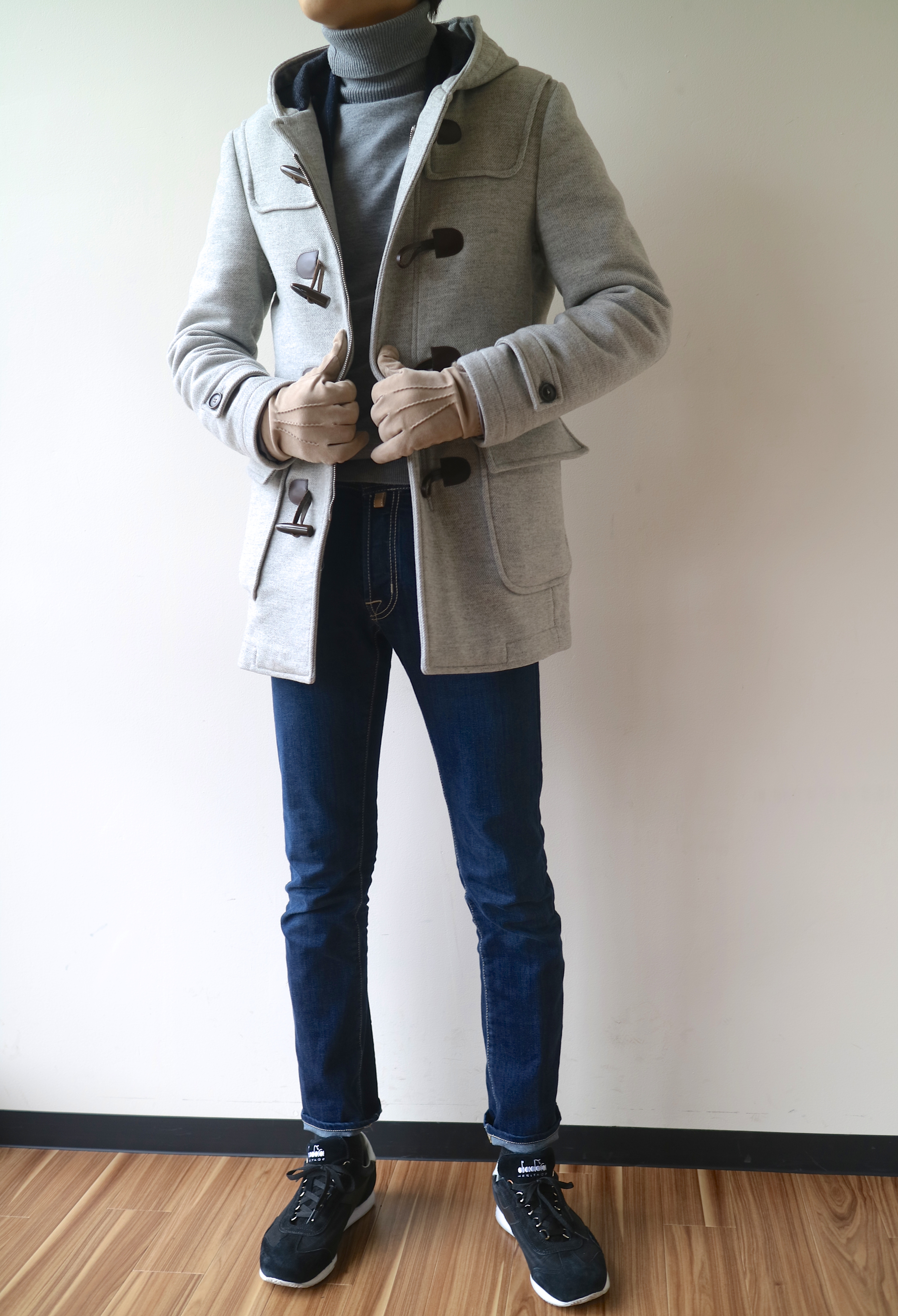 コートの中でもダッフルコートが一番好きです。3、4年前ぐらいに初めてグローリーガイで購入した、思い入れのあるコートでもあります。最近は同系色で合わせる着こなしにハマっていて、最近購入したお気に入りのFARNERARIシープスキンスエードグローブを使い、明るめのトーンでコーディネートしてみました。色の強弱をつけずにワントーンで合わせるのもお洒落だと思います。