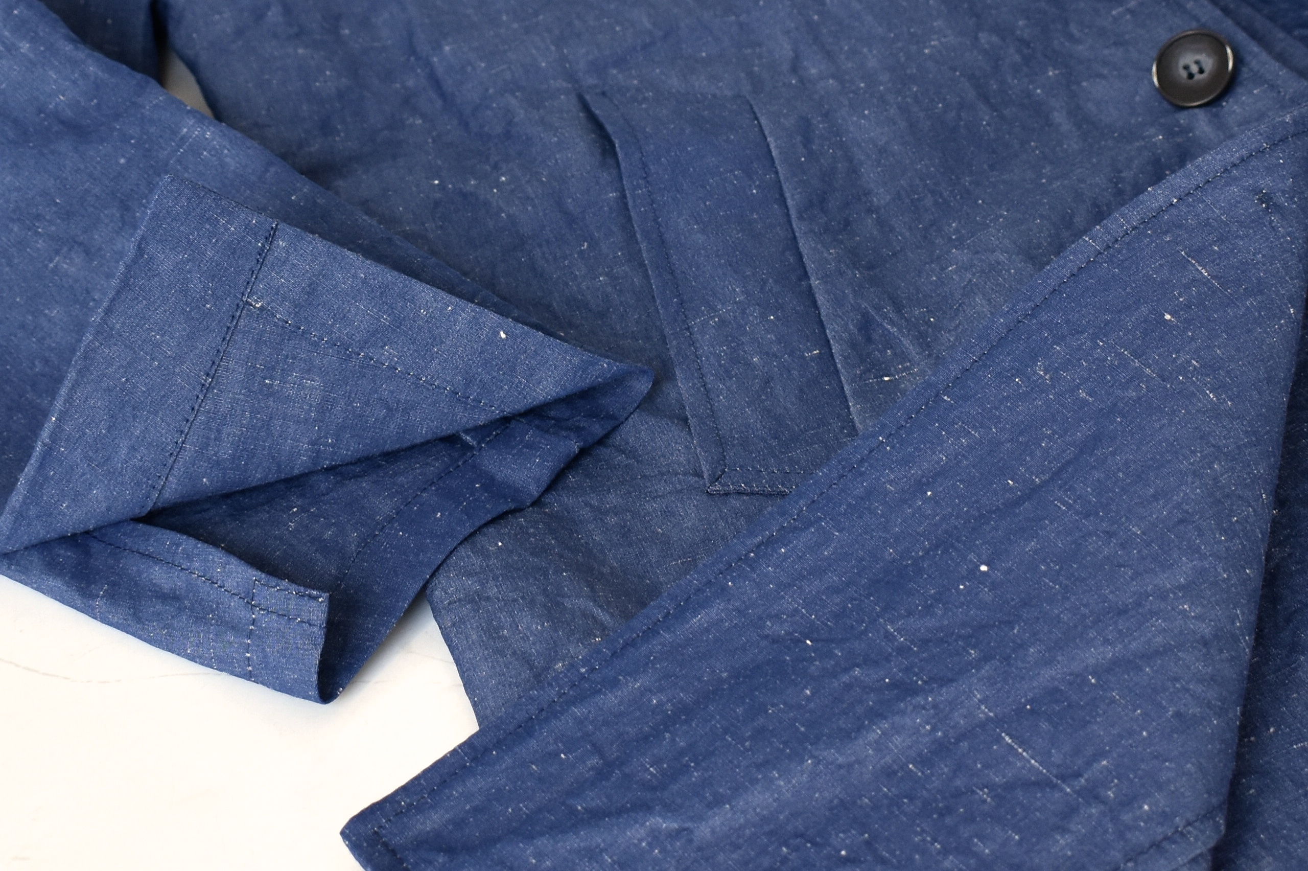 コットン・リネンに、シルクが混紡された生地。薄手ながらハリとコシがあり、さり気ないネップとナチュラルなシワ感によって、洒脱な雰囲気が漂います。シャツジャケットと同じく、袖口は切りっぱなしで釦はつきません。シャツジャケットと同じく、さらりと着流せるライトウエイトなコートです。