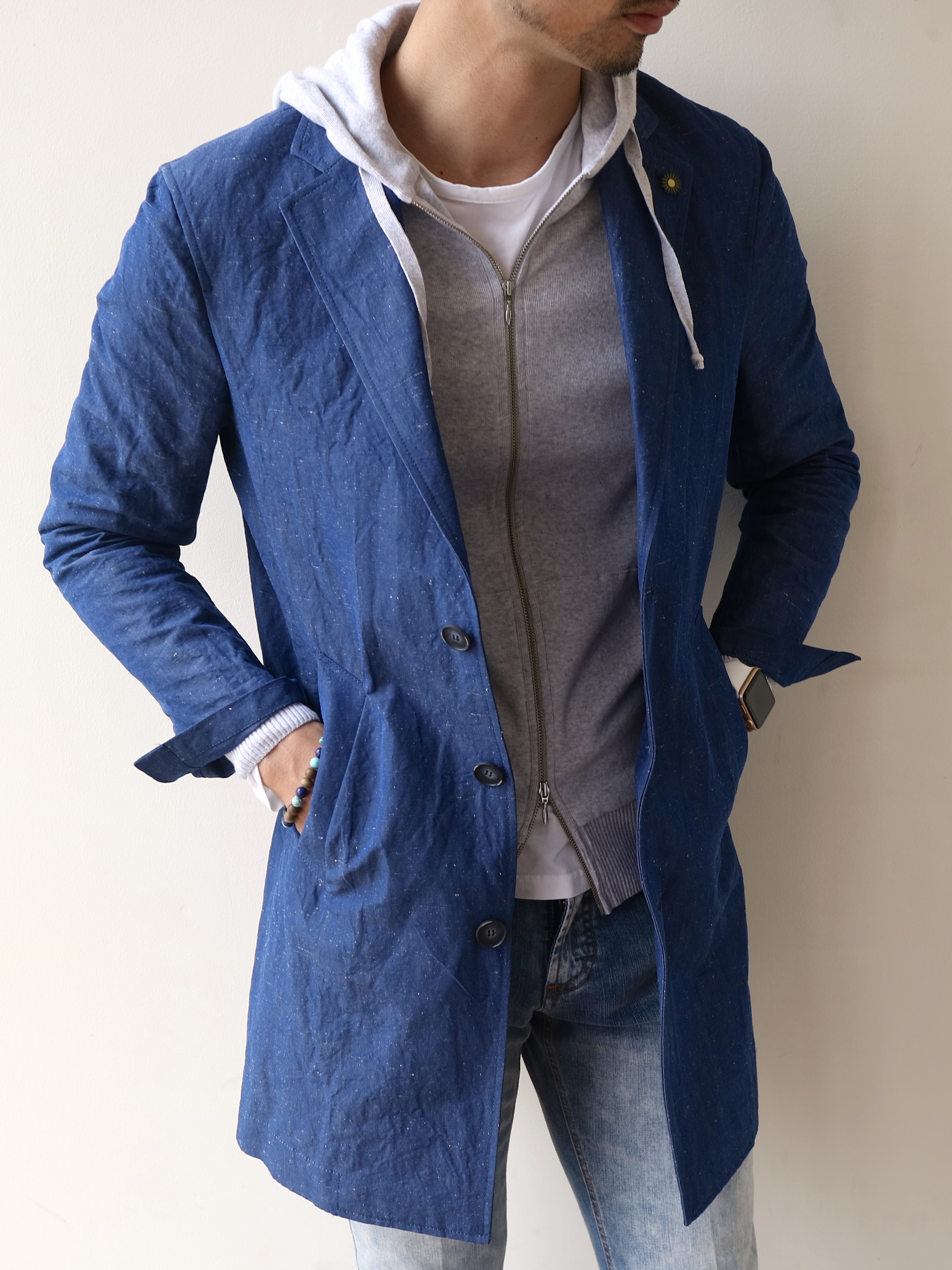 レディースでは丈の長いカーディガンのことを、コートと掛けて、"コーディガン"なんて呼び方をして話題になっておりましたが、それと同じ感覚です。腕捲くりなんかをしつつ、さらりと羽織るイメージでしょうか。提案としてもっと増えてもよさそうな、丈の長い・軽量の羽織りもの。簡単に雰囲気を変えられて、カチッとし過ぎないのも魅力。こんな新提案、如何でしょうか。