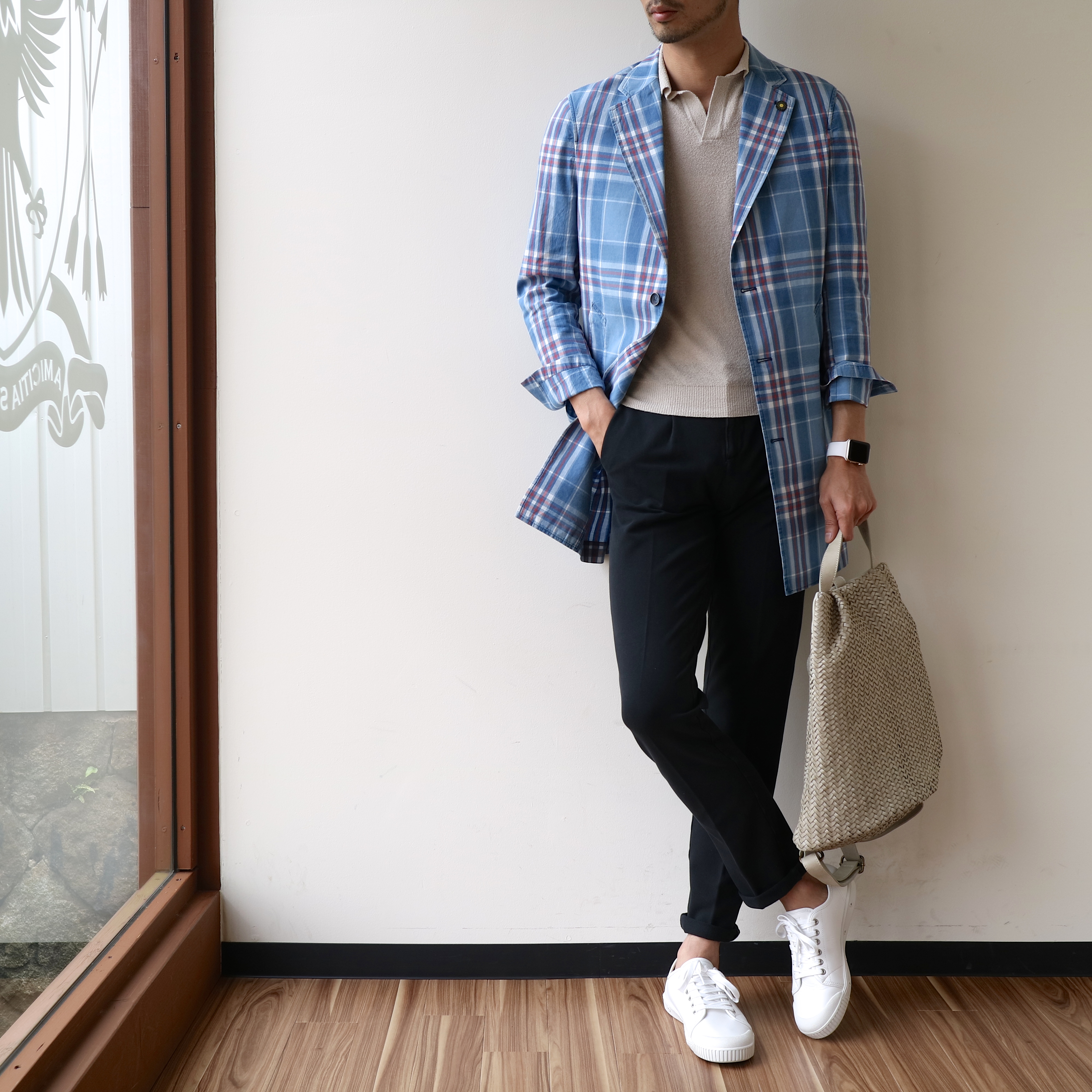 PANICALEのニット、entre amisのダメージデニム(両者とも近日中にご紹介予定)、Spring Courtの黒スニーカー、TIBERIO FERRETTIのトートバックを使っています。