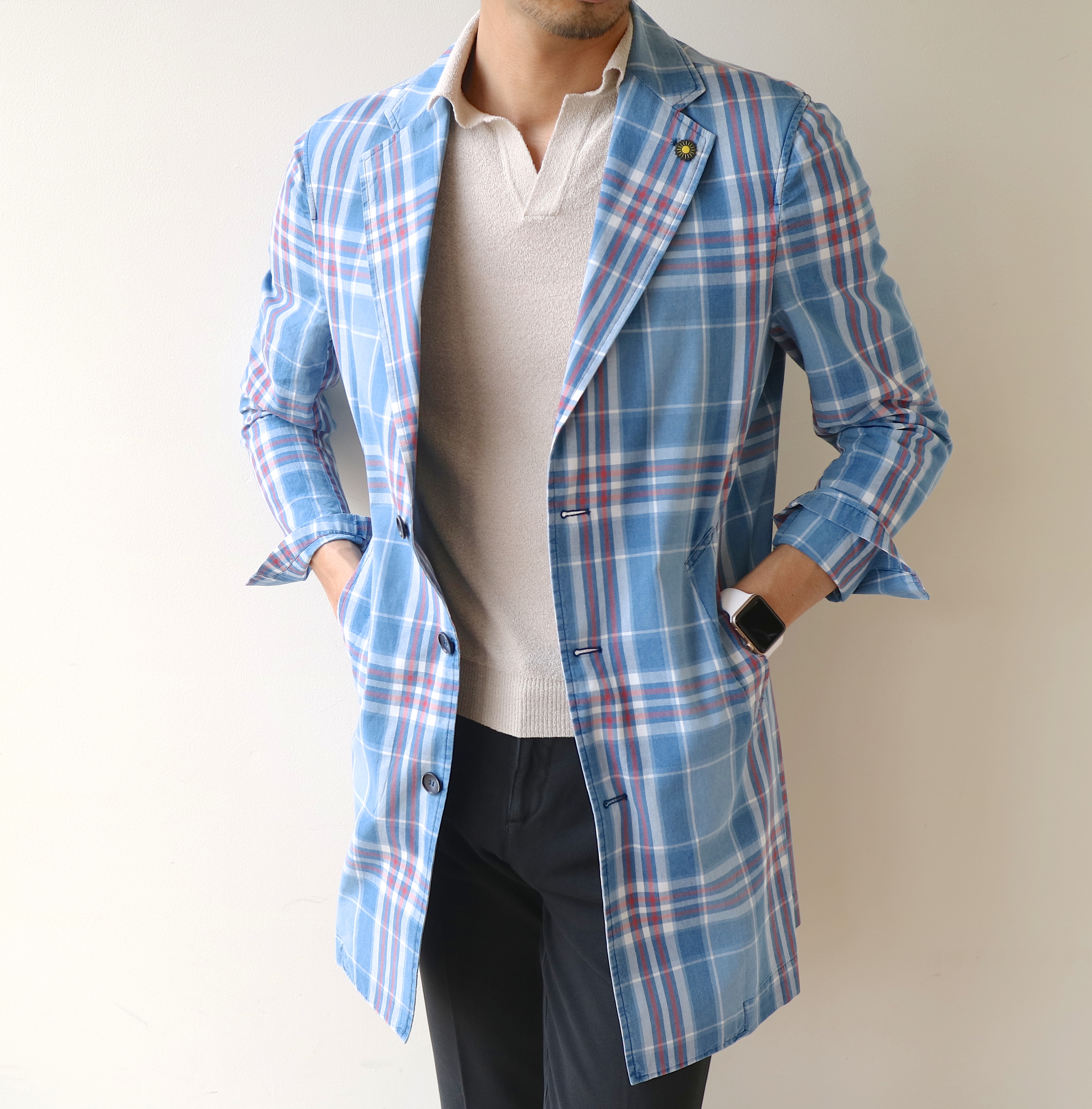 リネンのシャツや、コットンのサマーニット、半袖のカットソーなどと気軽に合わせて下さい。コートを着ることで、漂う男の色気。これは他のアイテムでは代替出来ません。前だけでなく、後ろもしっかり格好を付けられます。