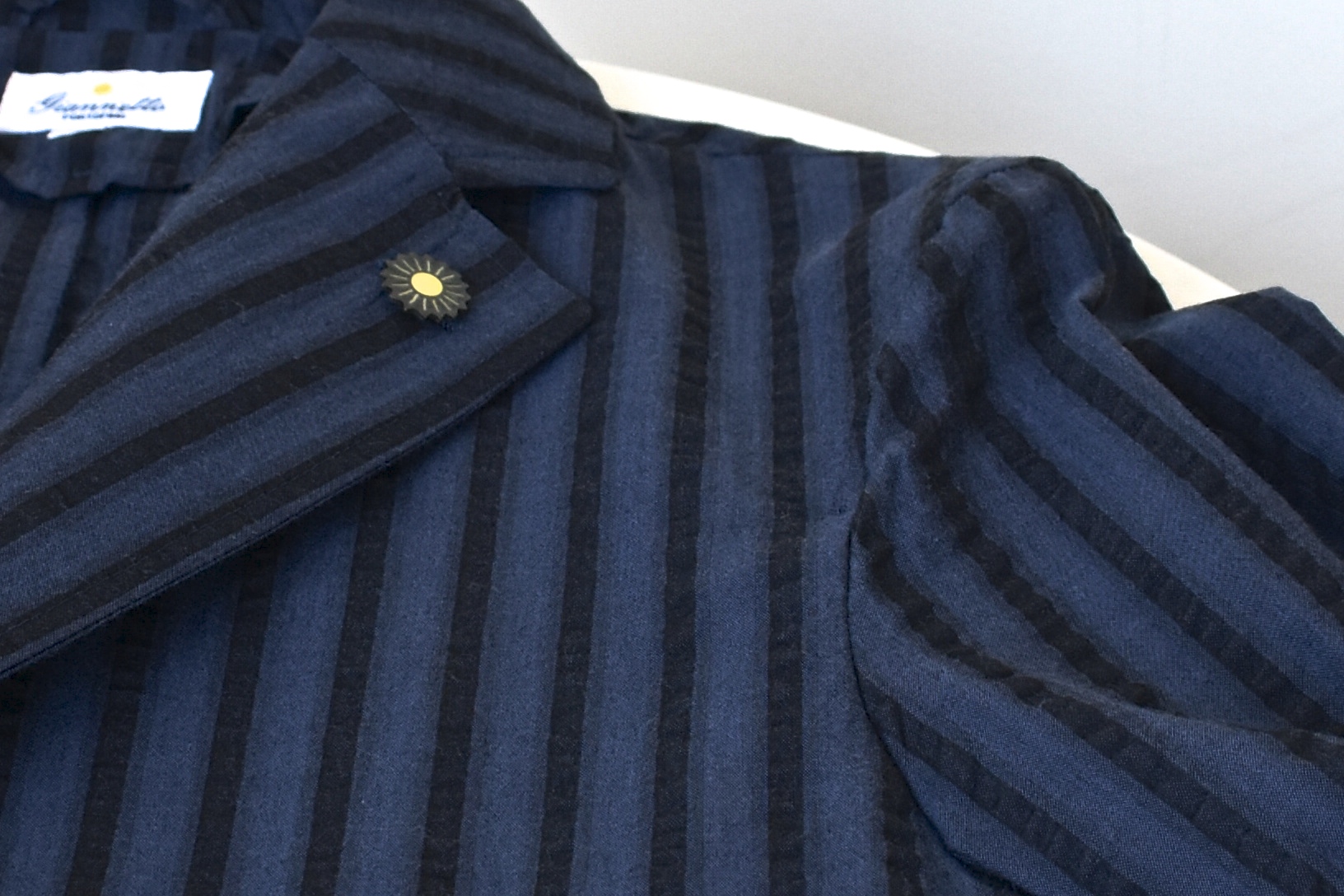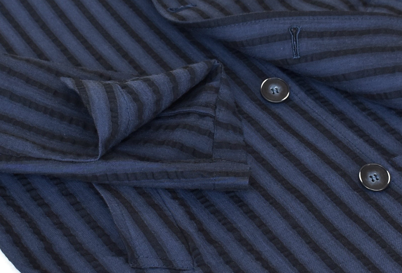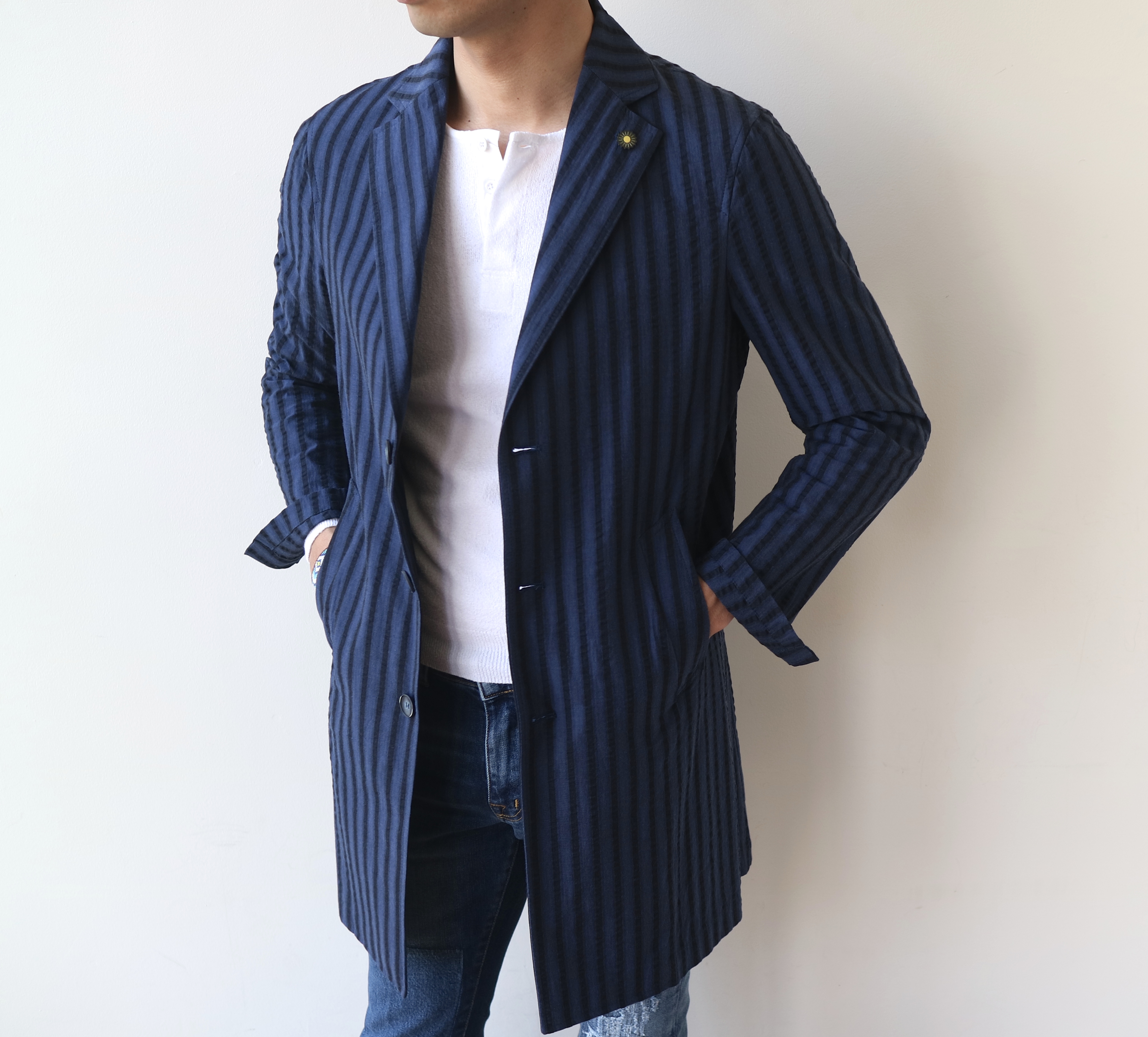 夏場、白Tの上にもパッと羽織れそうな、シアサッカーの生地。硬さがなく、ザラザラして気持ちの良い生地は、イイ感じでシワも入りそう。程々に主張のある幅広のストライプが、これまた気に入りました。