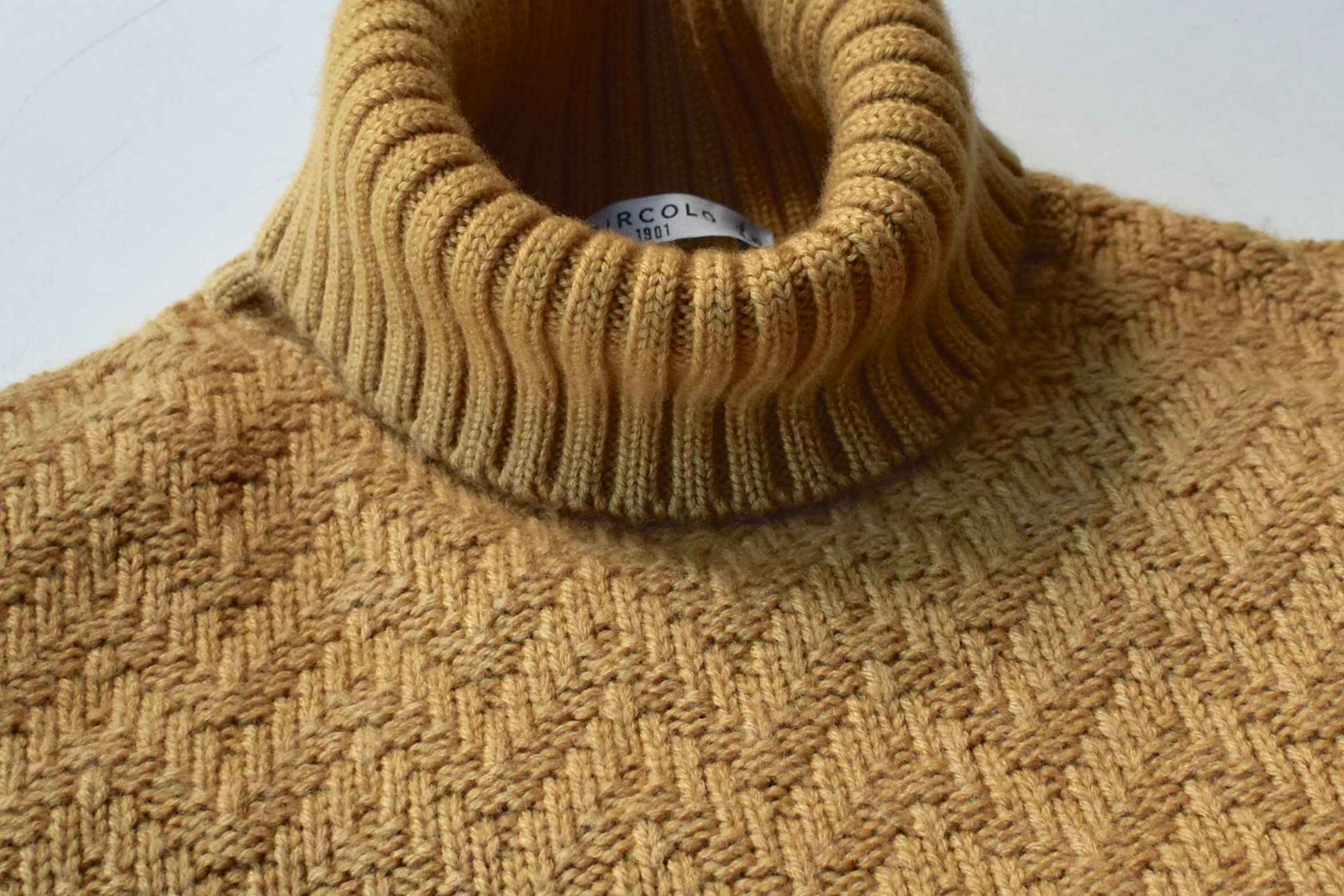 ややくすんだイエローは、マスタードといった方が正確でしょう。ジグザグ編みのさり気ない編み感と、絶妙なマッチ具合です。編みによる伸縮性があり、とても着心地が良いこともお伝えしておかねばなりません。