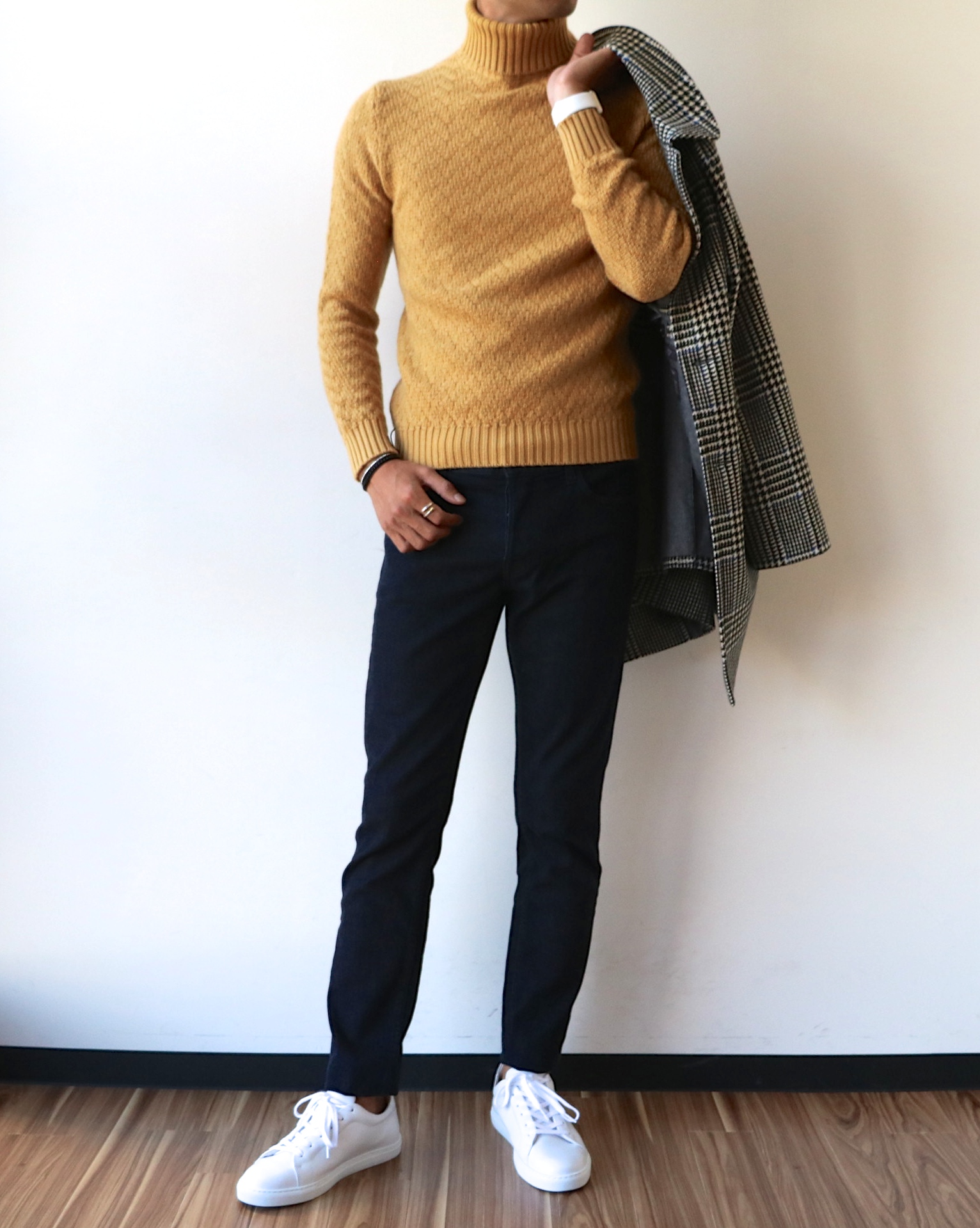 お気に入りのコートは、中々手放すことができません。もう1つご案内しておきたいのは、ニットです。トレンドカラーのイエローは、今季俄然気になるカラー。今までほとんど着たことのない色なのに、展示会で見て、即一目惚れしてしまったニットです。改めて着てみると、やはり納得。ネイビーのパンツとも合うし、黒はもちろんOK。ブラウンやグレイと合わせても良さそう。今回は、Care labelのインディゴデニム、Pantofola d'Oroの白スニーカーと合わせました。