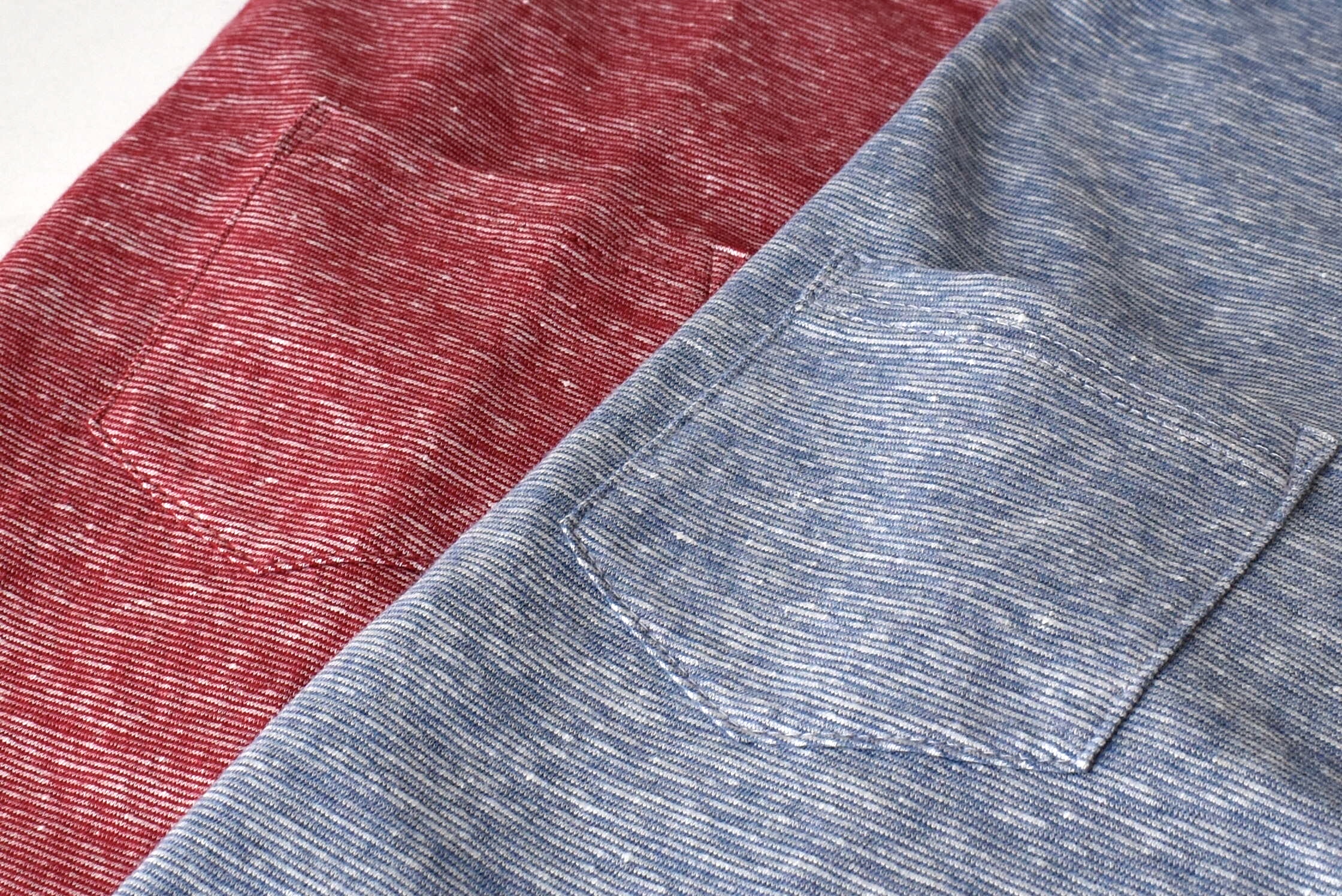 小振りな胸ポケットが付く、ラウンドネックのカットソー。憎いのは、リネン・コットンの素材感。白糸がランダムに顔を覗かせる生地の見栄え、ザラッとしたリネン特有の肌当たり。夏らしさ満点の1枚です。よく見れば、細いボーダー柄となっています。