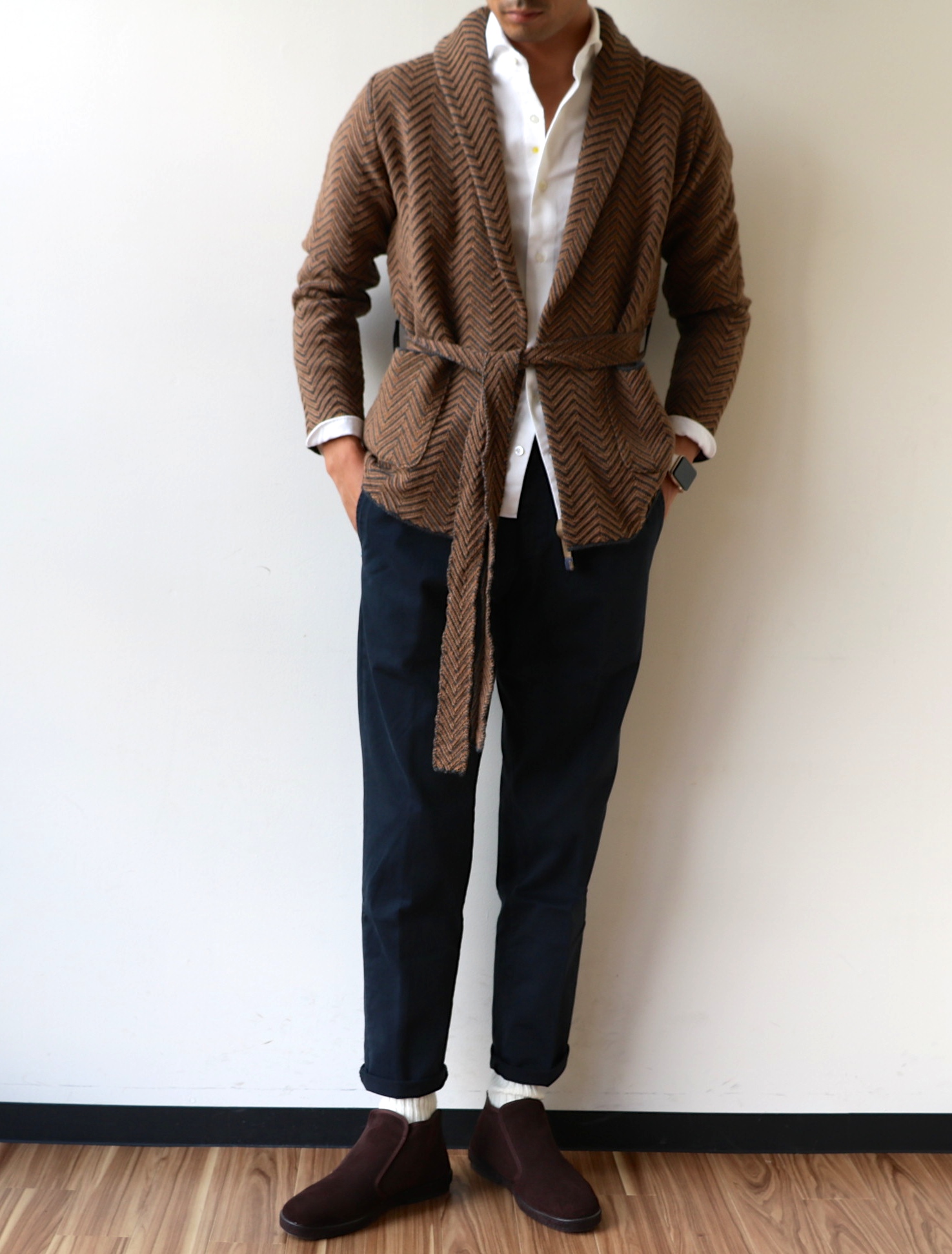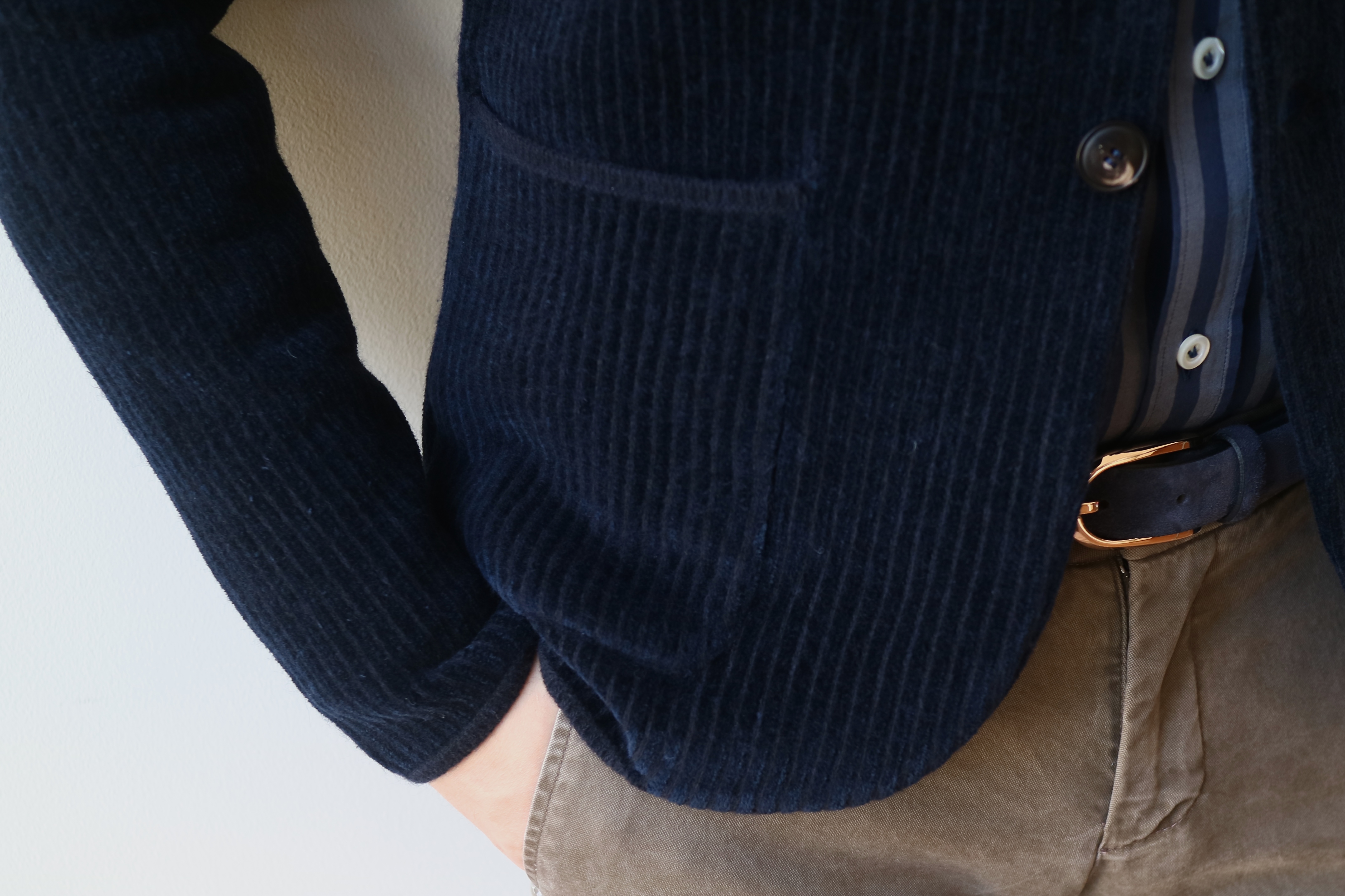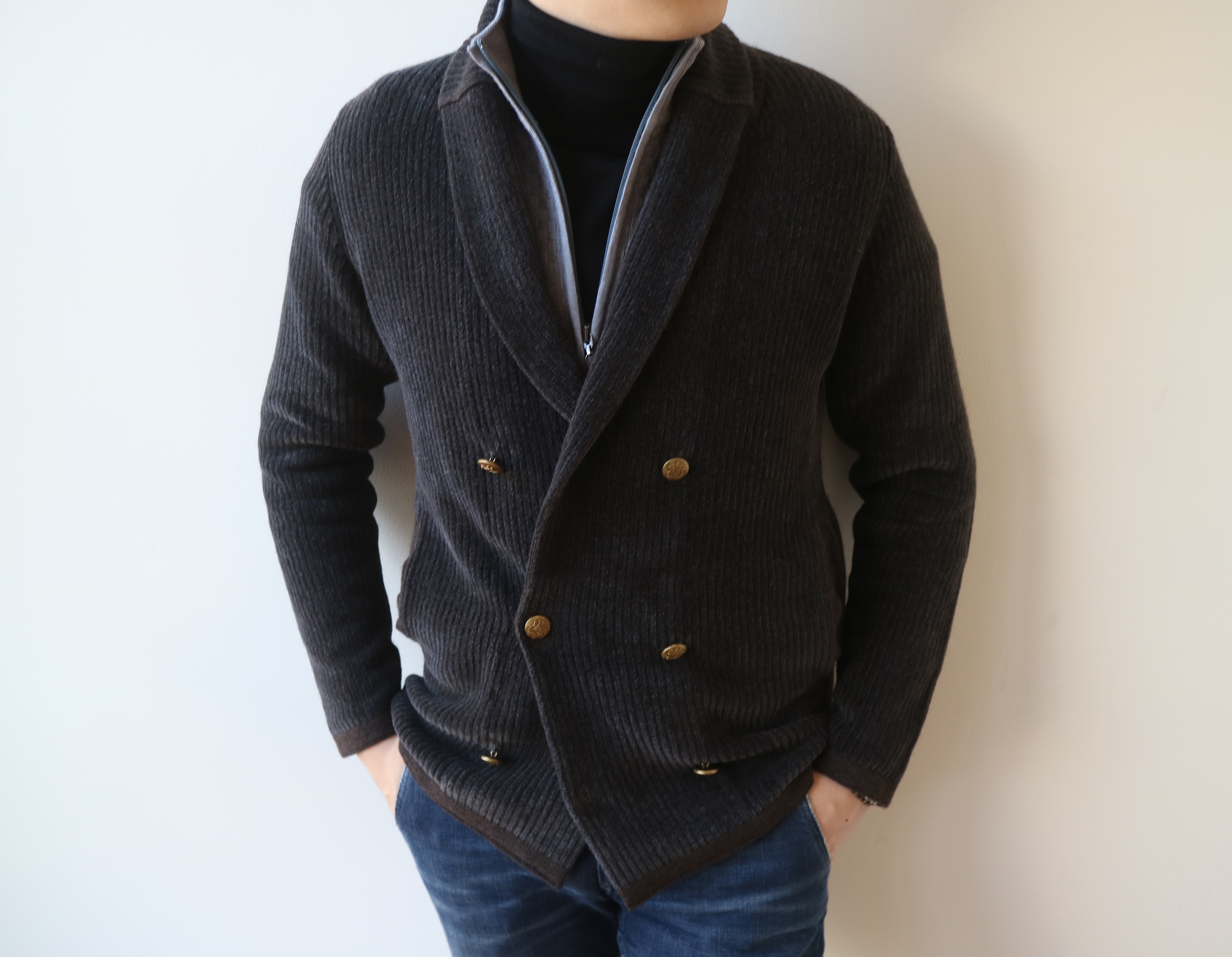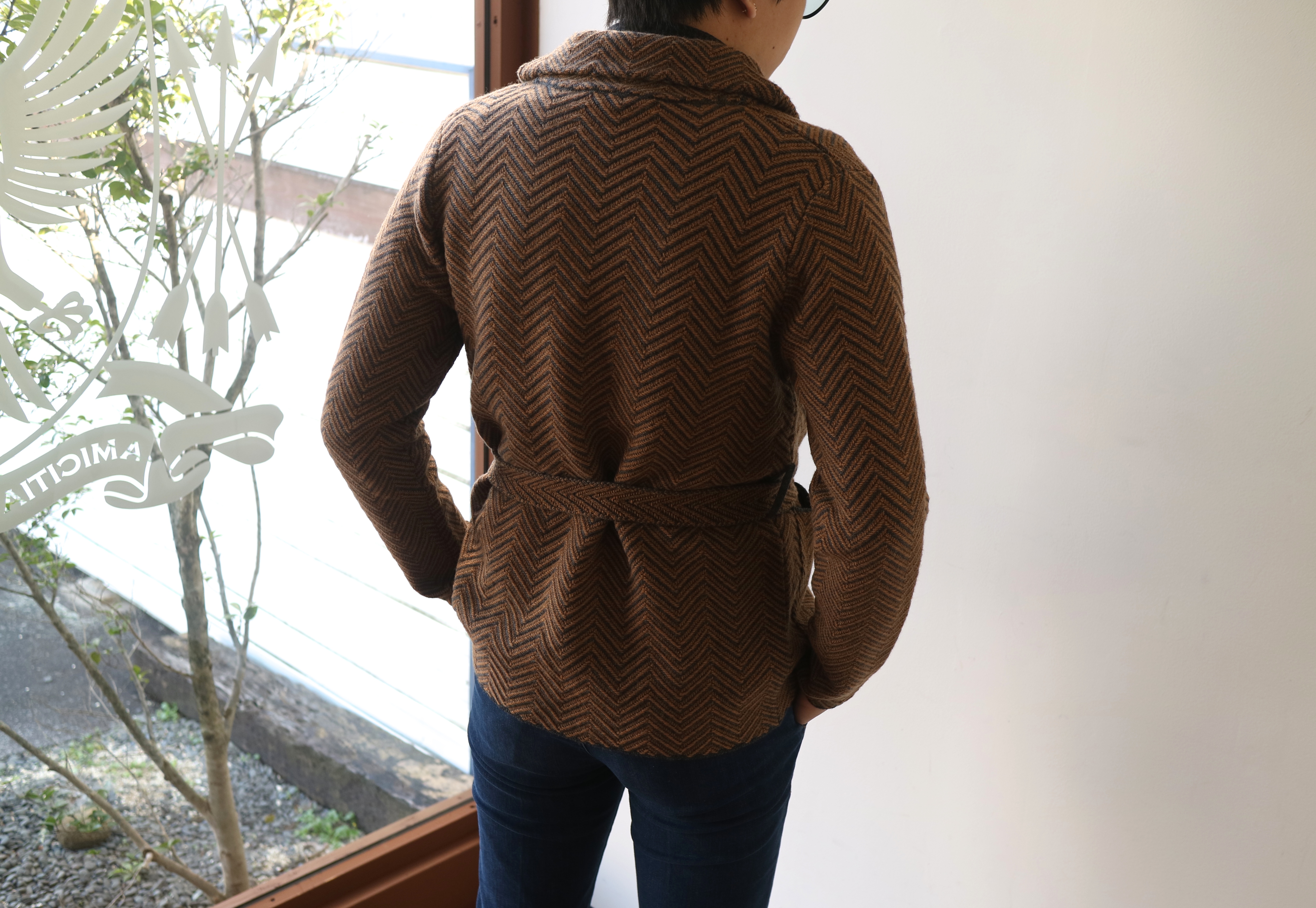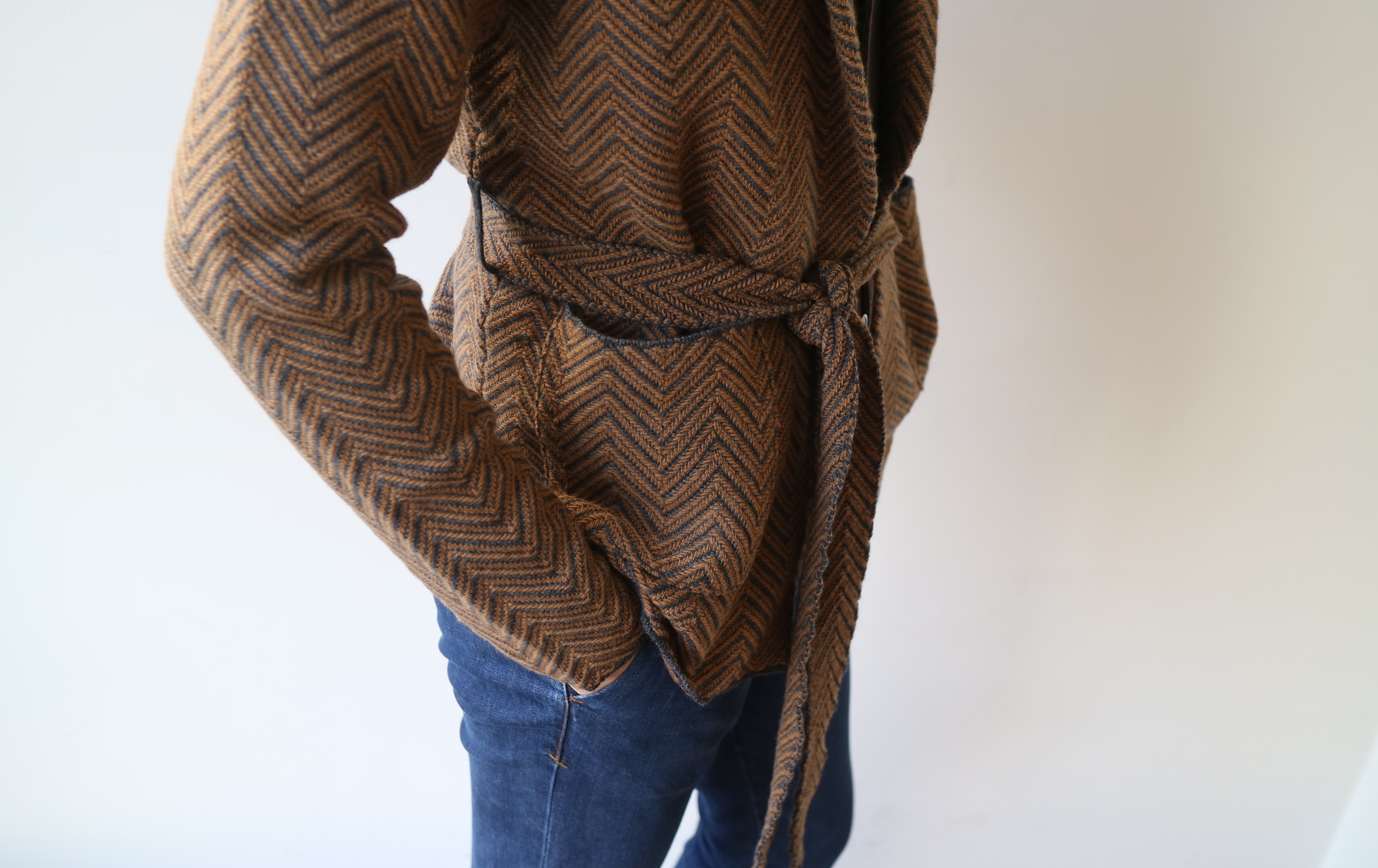 紐を外してしまえば、釦レスのカーディガンに様変わり。さり気なく表情のあるネイビーのヘリンボーン柄は、色気があります。