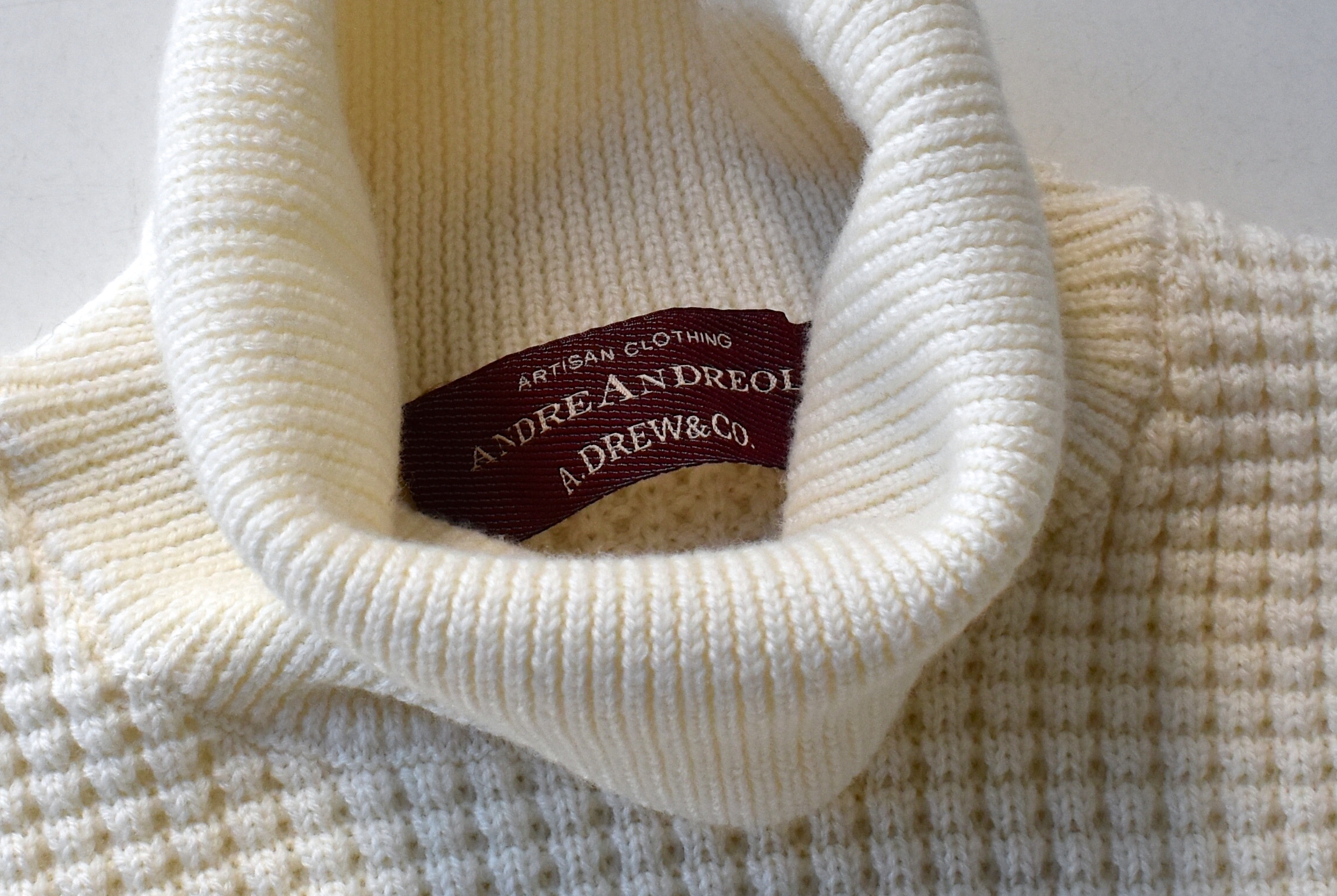 ワッフルの様に、凹凸感のあるバスケット編み。その立体感は抜群ですし、何より伸縮性があって着やすいメリットも。タグには、"ARTISAN CLOTHUNG"の文字。他のニットブランドとはどこか一線を画した世界観が魅力のブランドです。