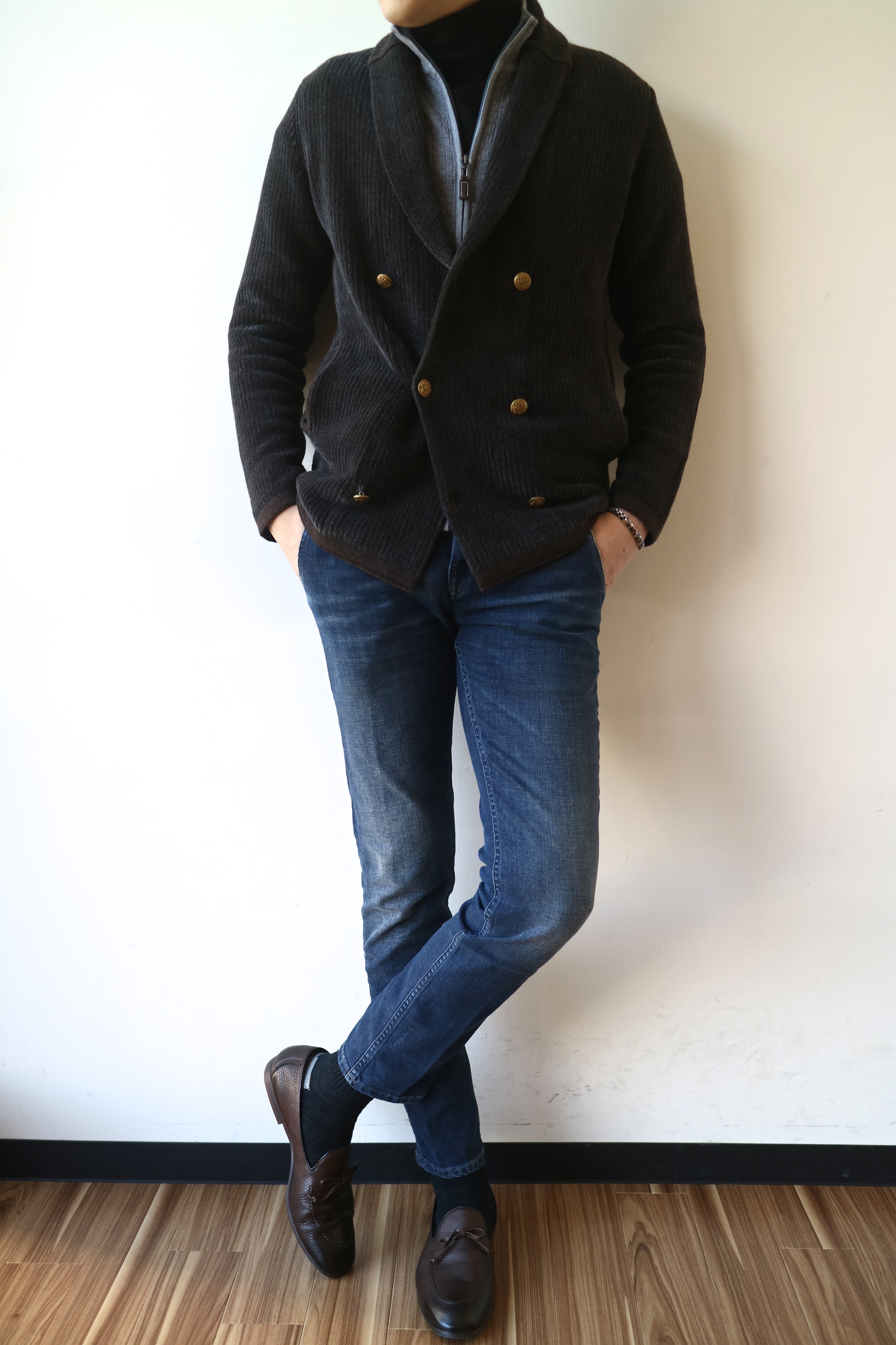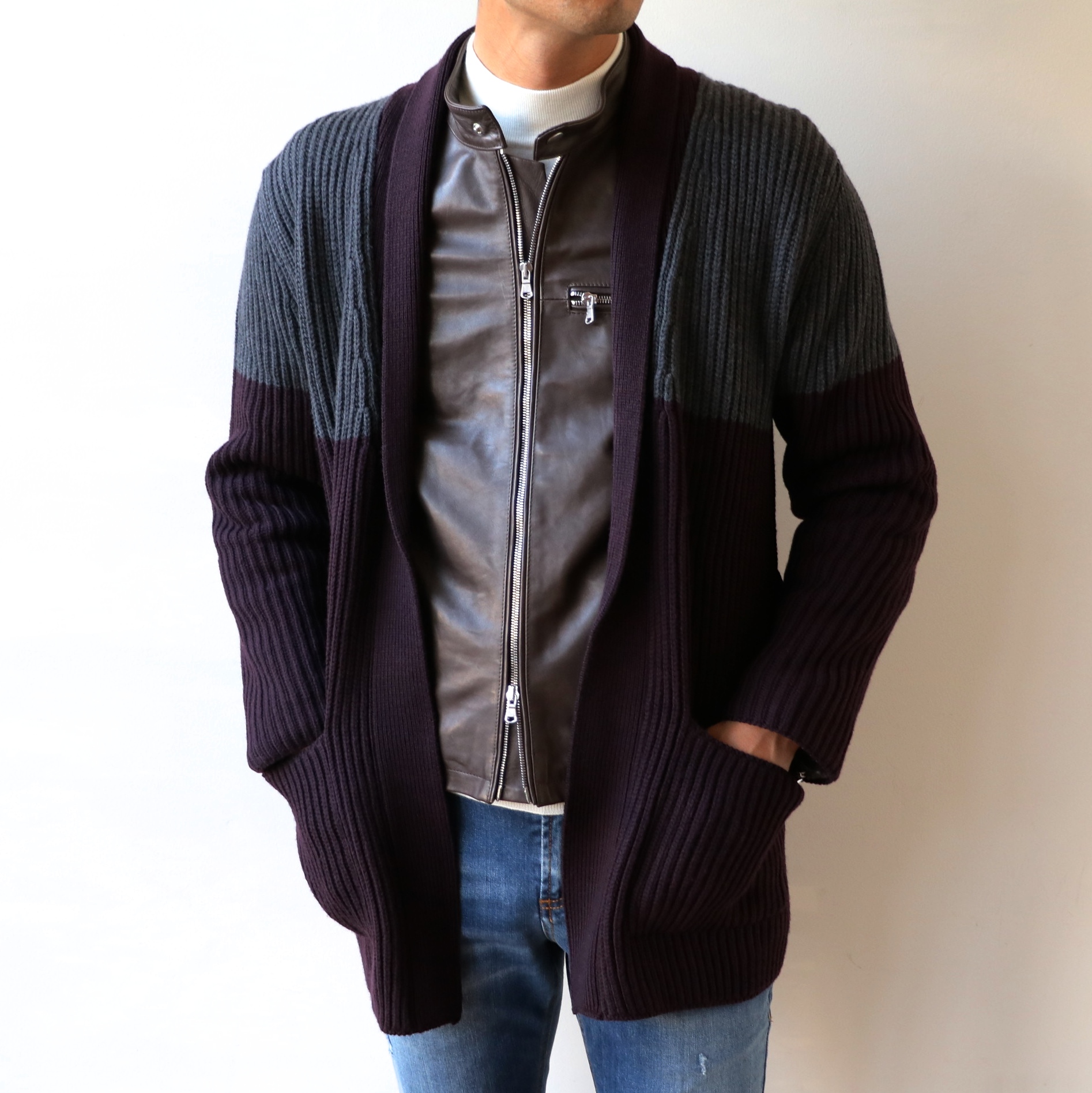 ガウンカーディガン、【eleventy/イレブンティ】でもありました。グレイとボルドーのツートンカラーがイレブンティらしいですね。ドリュー&コーのものとは、また雰囲気も異なります。 レザー:EMMETI ニット:PANICALE デニム:entre amis