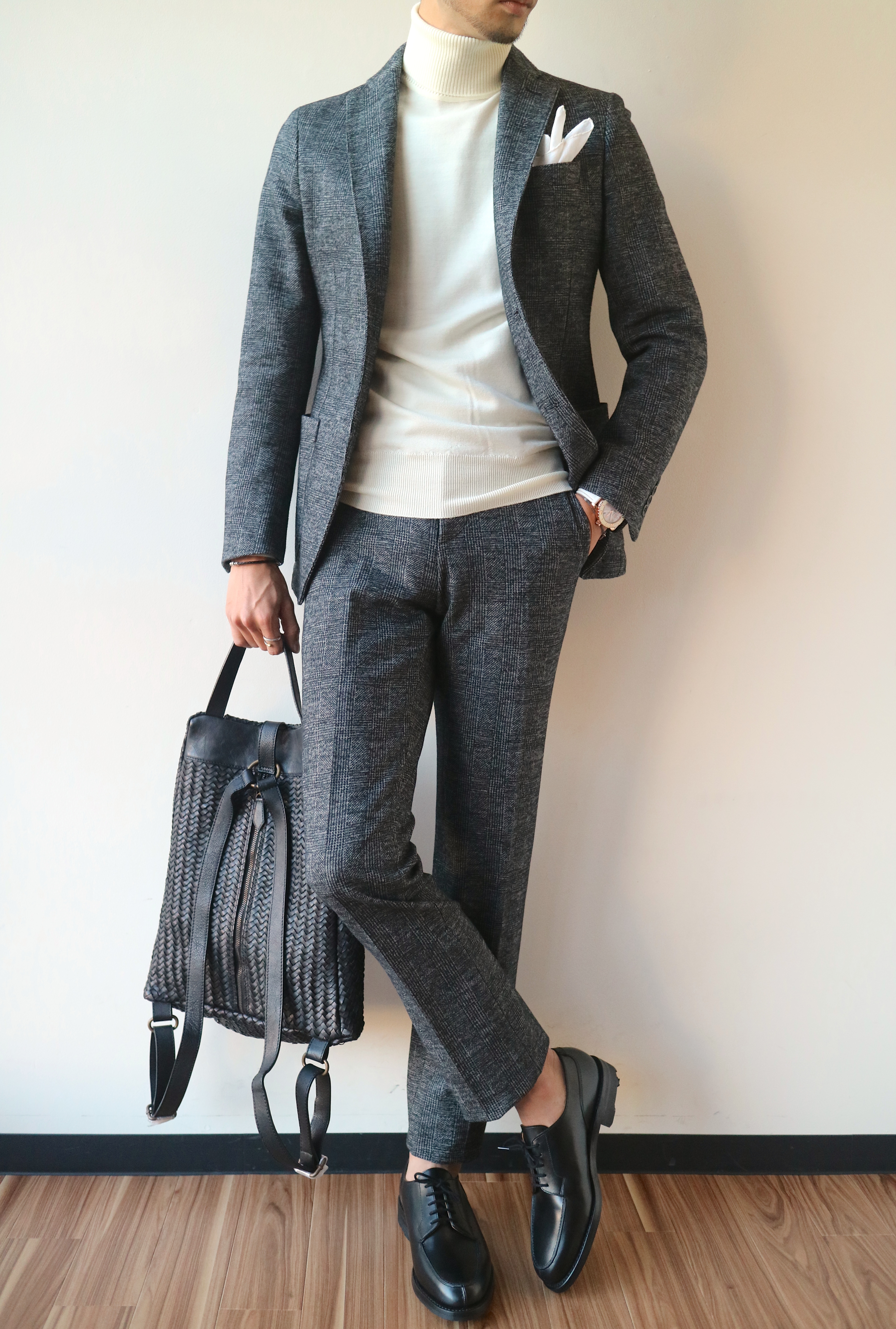 インにはJOHN SMEDLEYのタートルネックでシンプルに、ややカジュアルに着こなしてみました。パーティーなどの集まりで以外と目につくのが、鞄。TIBERIO FERRETTIのイントレチャートのバッグなら、とっても粋に見えるはず。靴はCROCKETT&JONESのMORETON。Uチップシューズは、オンオフ問わず使いやすいですね。