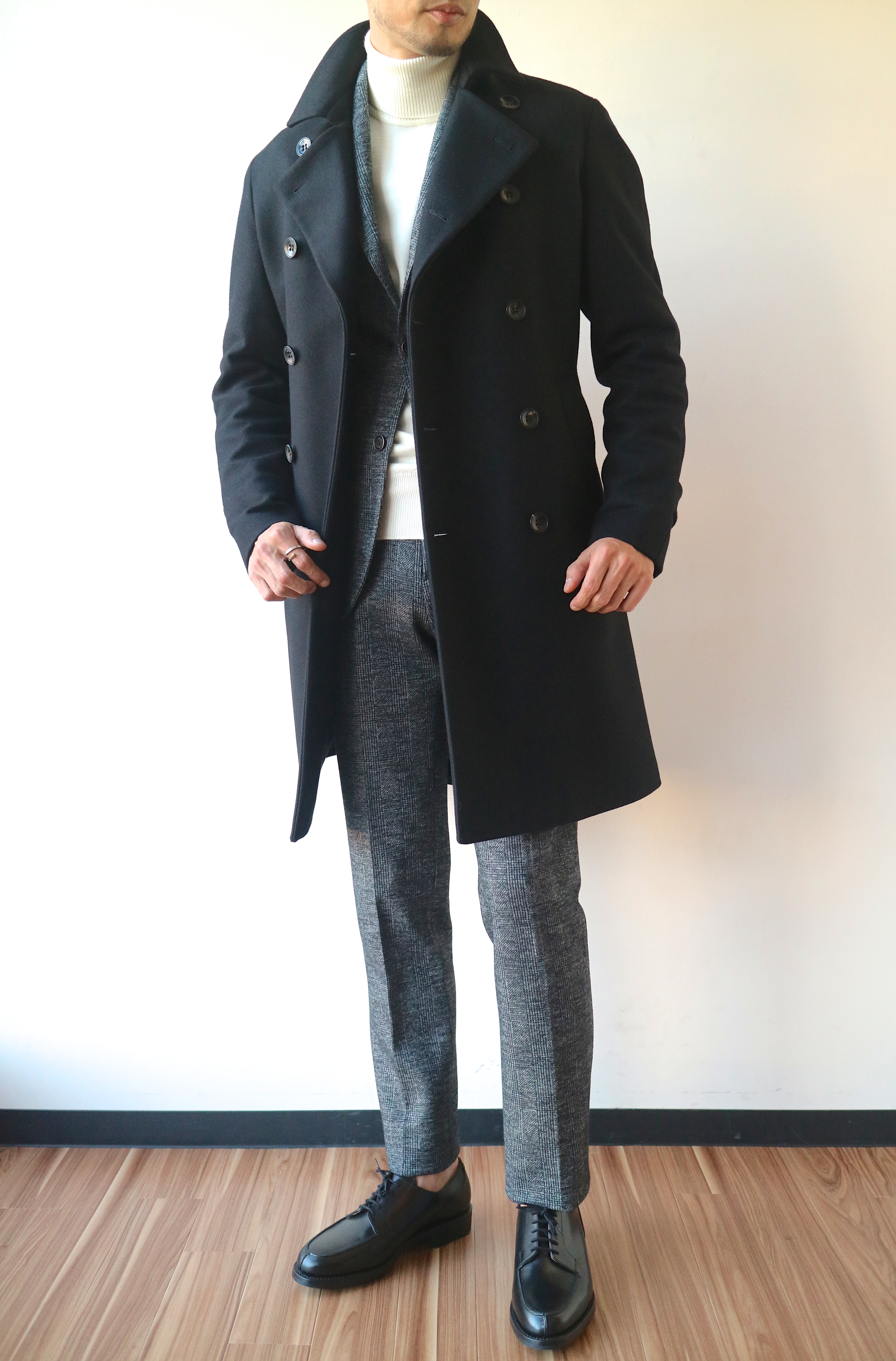 家に帰るまでがパーティー...ではありませんが、この時期、防寒には手を抜けません。Hevoのトレンチコート調のウールコートを羽織れば、小細工はいりません。なんとなしにポケットに手を入れたり・普通に立っているだけで、十分に絵になります。