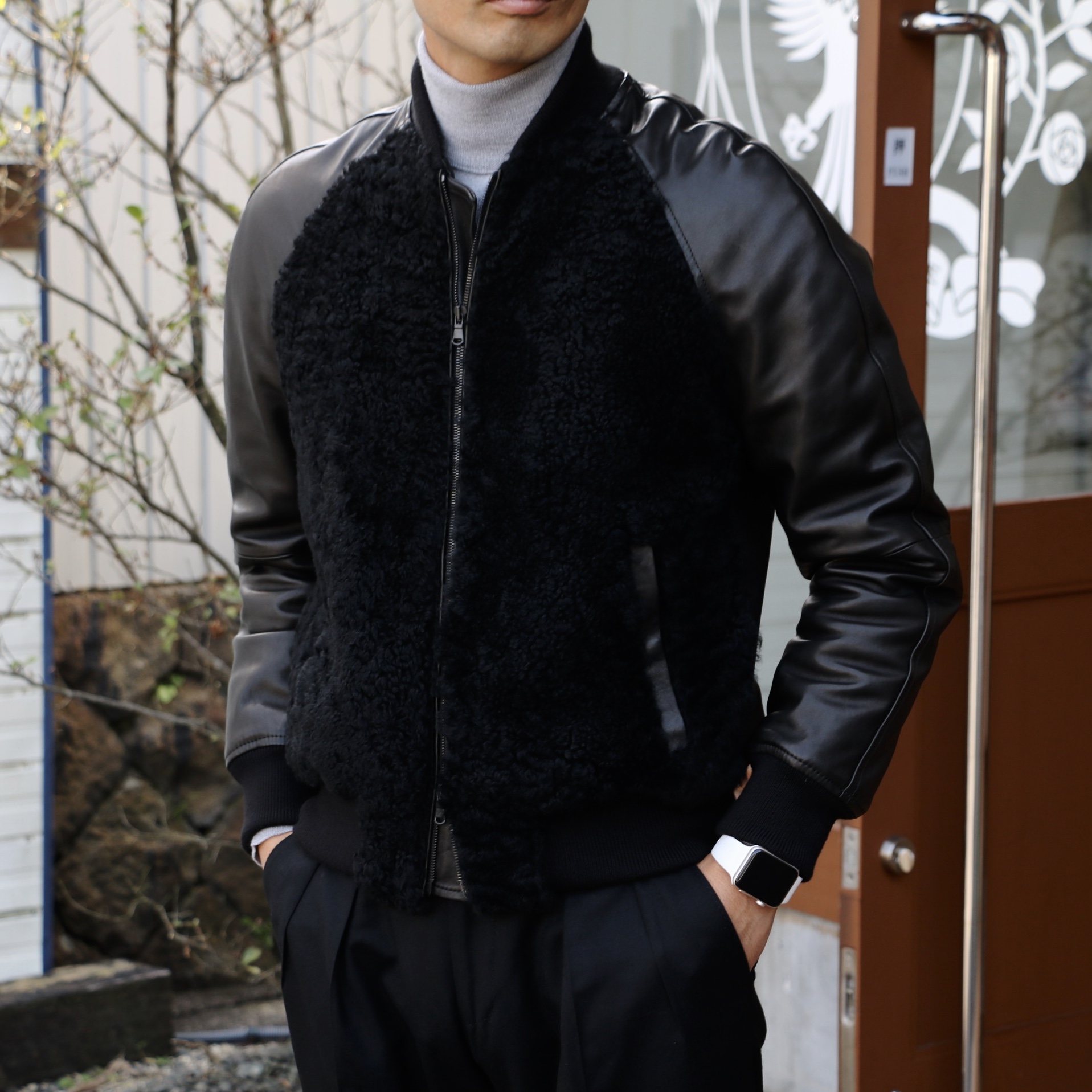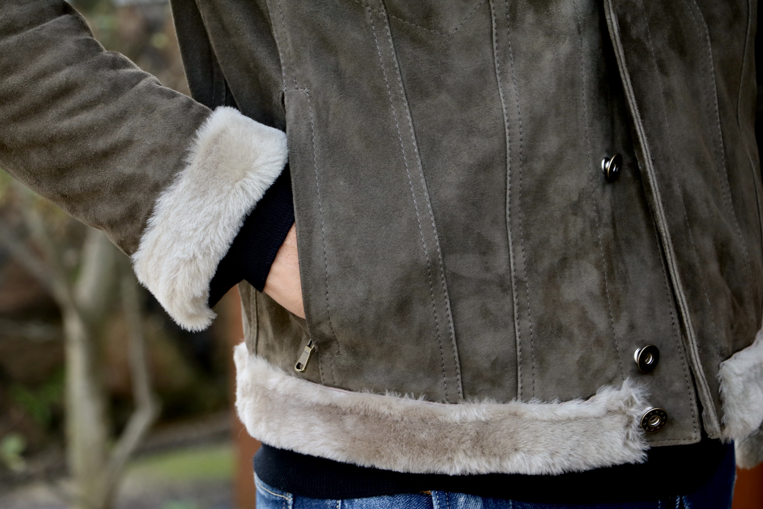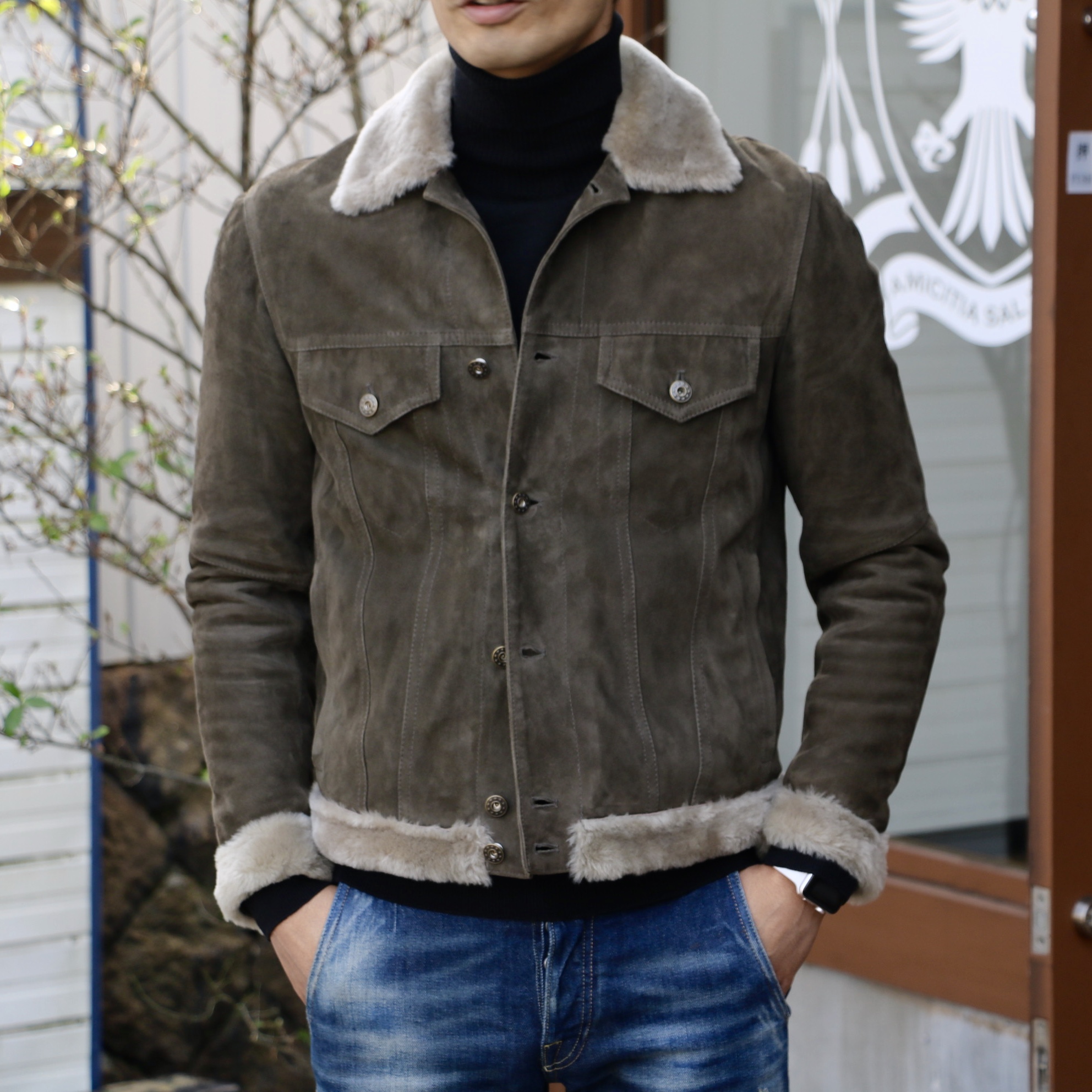 黒のタートルネック、ブルーデニム、白スニーカー。今日の出で立ちにピッタリだったのは、ミリタリーグリーン(オリーブグリーン)のスエードブルゾン。中には着膨れしない程度に中綿が入り、襟や裾にはムートンを配置。アウターとしての性格が強化されたブルゾンです。