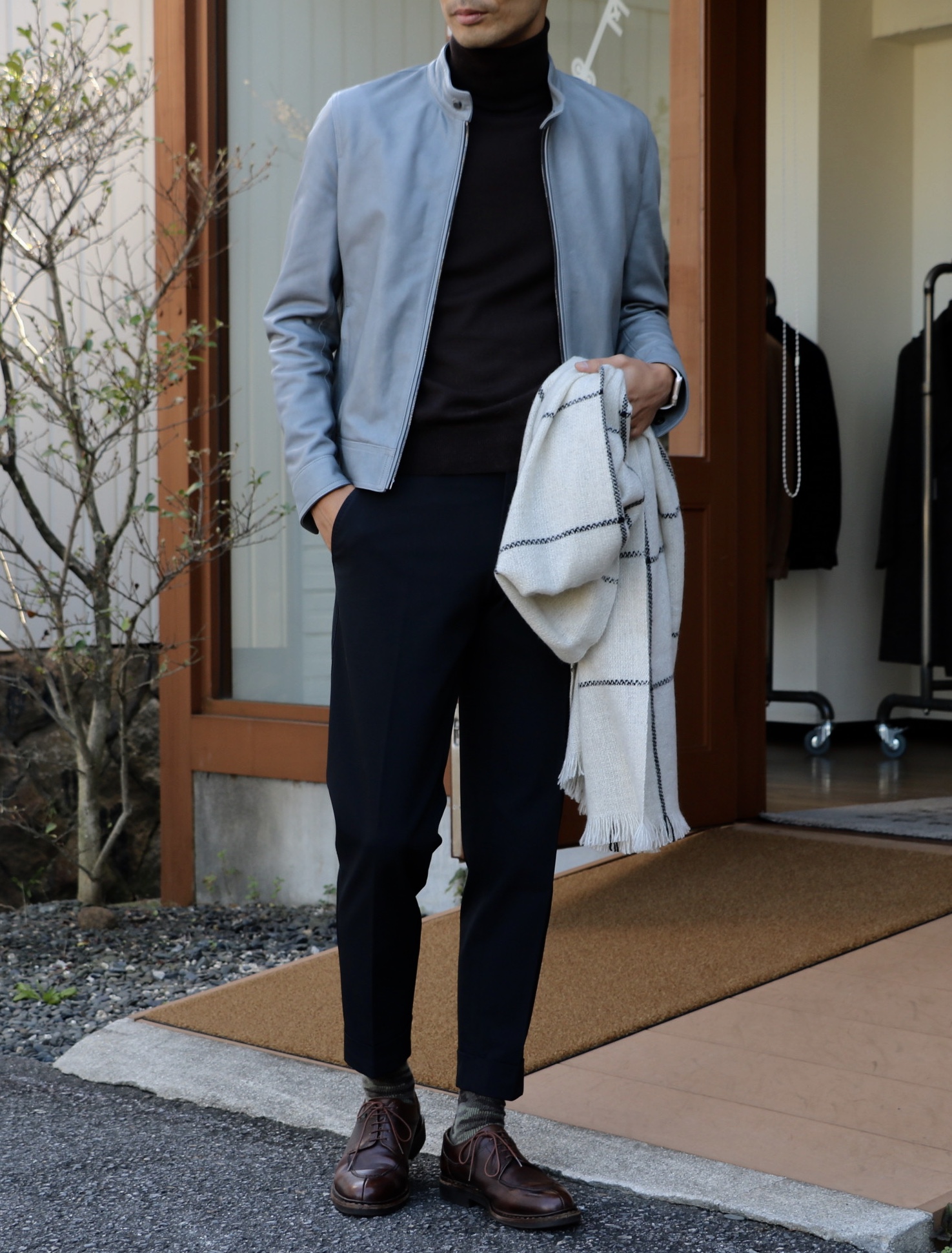 真正面より、斜めからの見栄えが綺麗です。立ち襟効果ですね。周りからの目線は、正面よりも斜めや横からの方が圧倒的に多いので、店頭で羽織った際には、ぜひ斜めからの見栄えの美しさを感じ取ってください。1枚目がダークトーンでしたので、ワンモアバリエーション、パンツ(後ほど)と靴(C&J)を変えました。