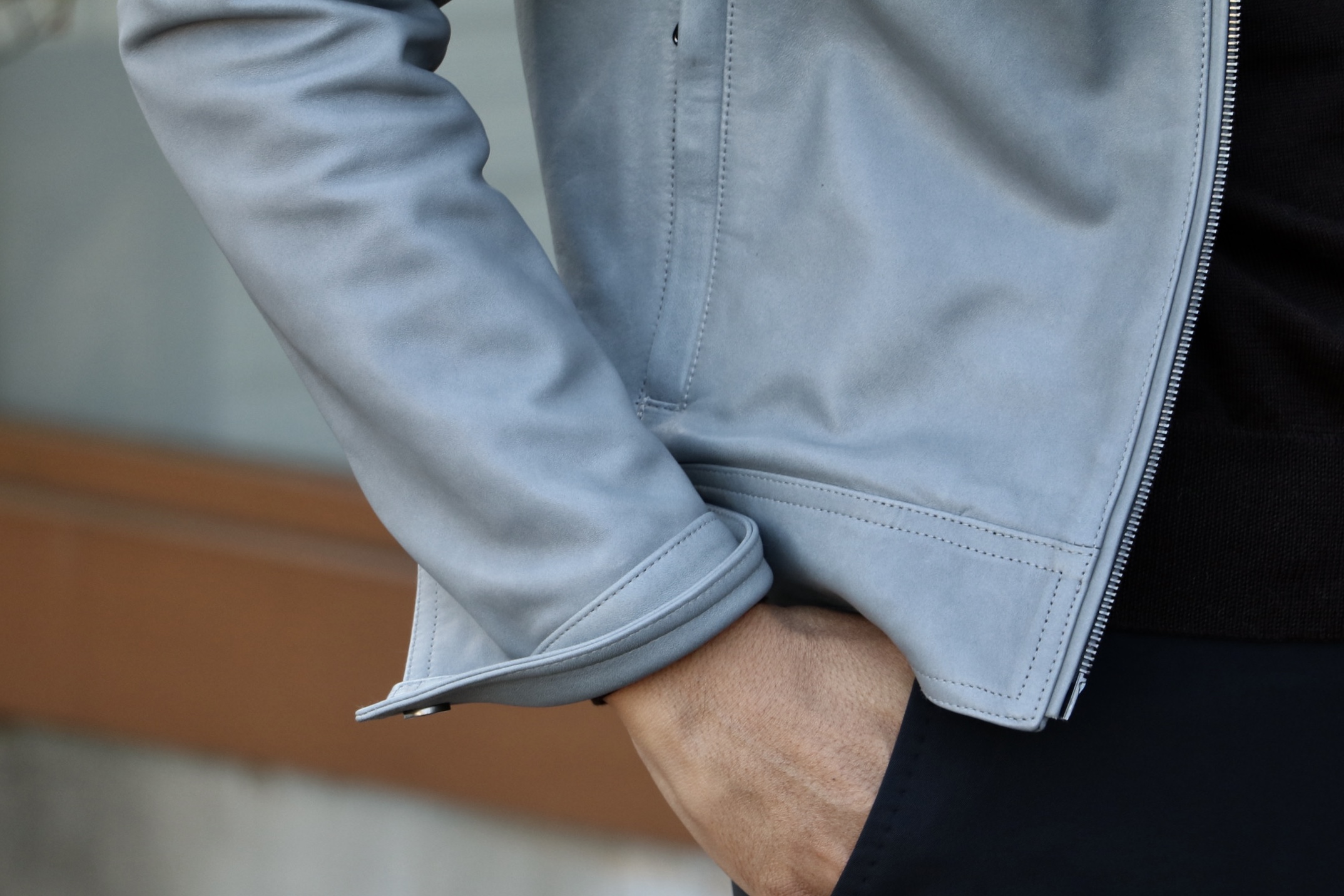 さて。やや厚みのあるゴートスキン(ヤギ革)のスエードは、ムラのある独特の色感。こちらはダークブルーになるのですが、ほんのり紫がかってもいて、魅惑のカラーに。リブの付いたブルゾンデザインで、さり気ないダンディズムを体現するはずです。シングルライダースに比べ、ややアウター的でもあります。