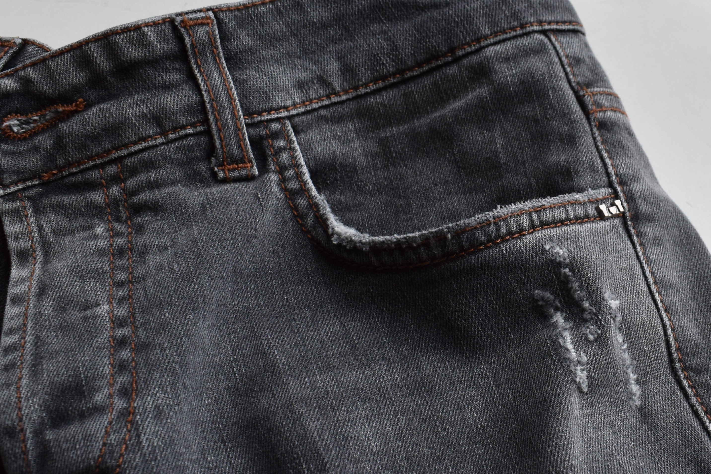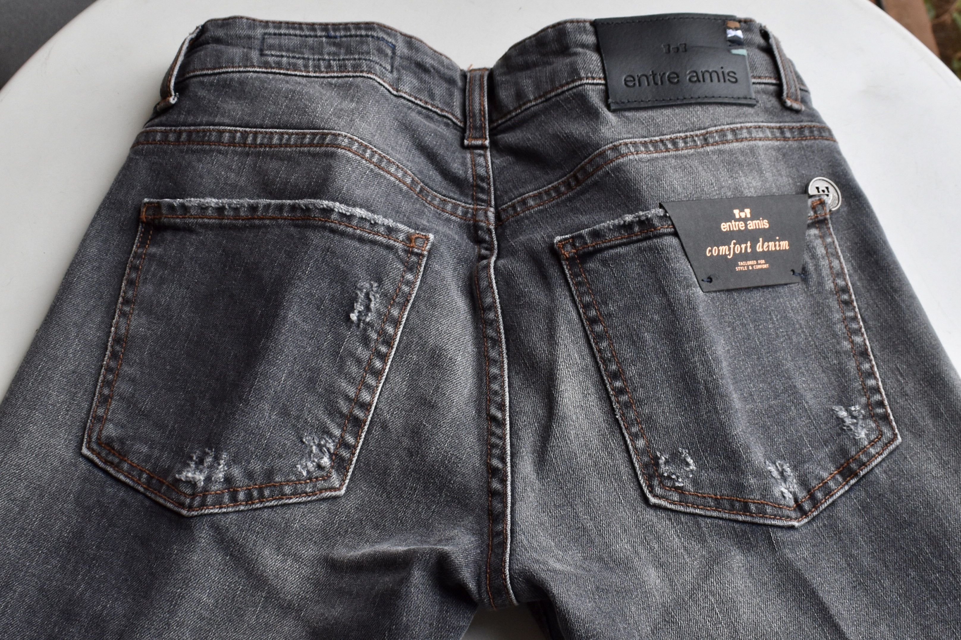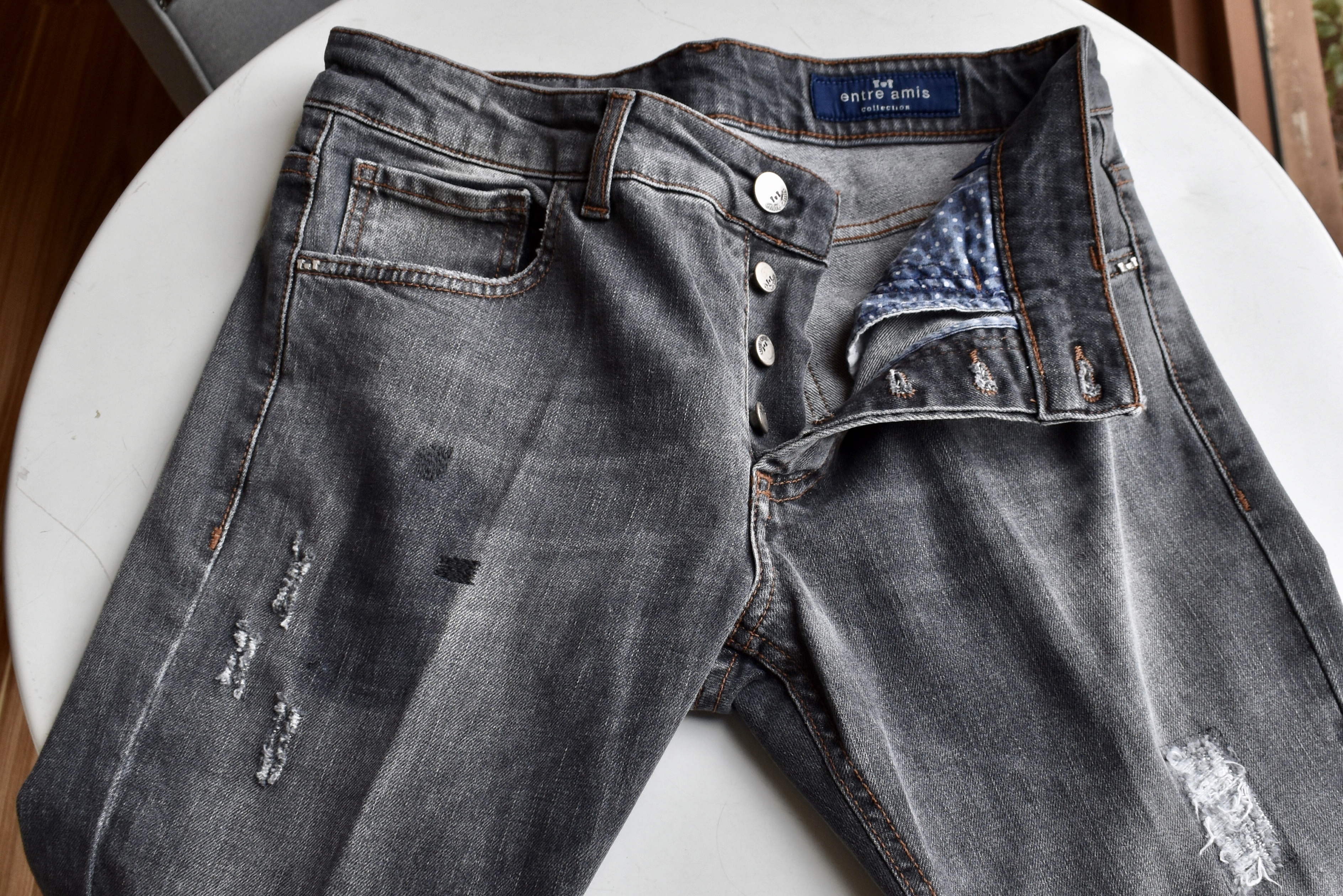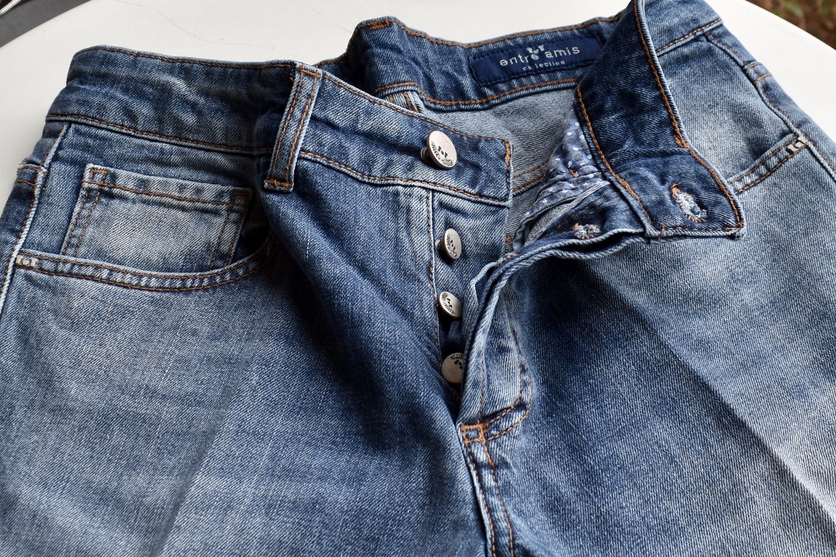 パッチポケットやポケットの縁にも、ダメージ加工。個性あるアントレアミのデニムには、この手の加工がよく映えます。ブラックでダメージ、というのも幾分か珍しいでしょうか。