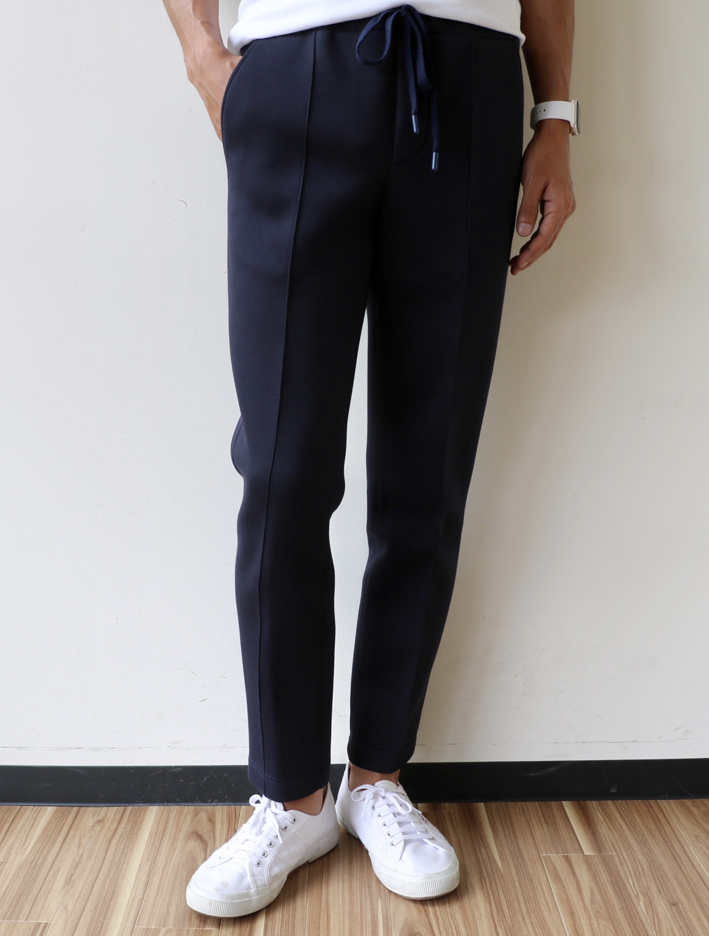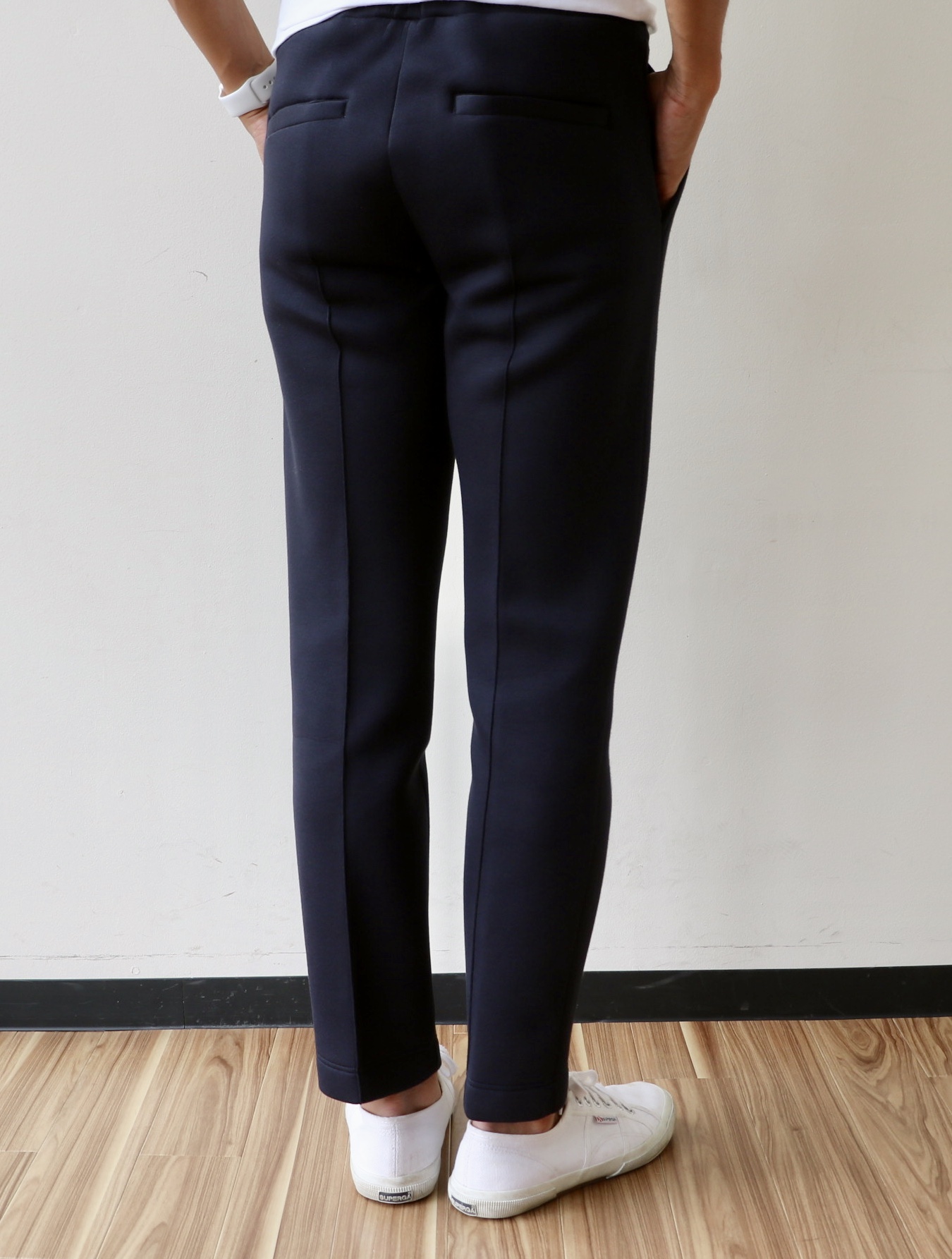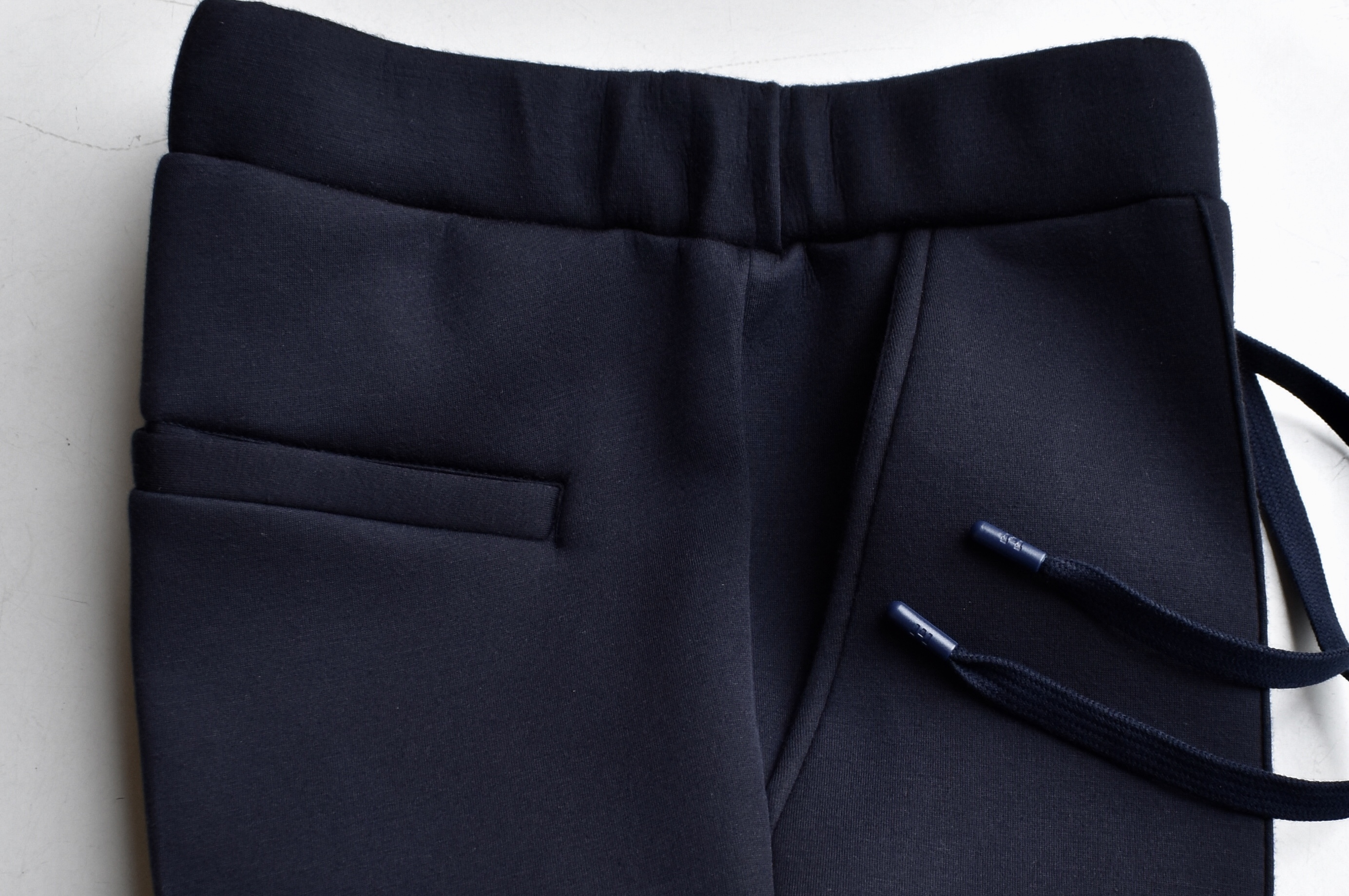 綺麗めなダークネイビーの色合い×ゴム入り・ドローコード付きのウエスト。ほんのりカジュアル感が漂い、良い塩梅です。