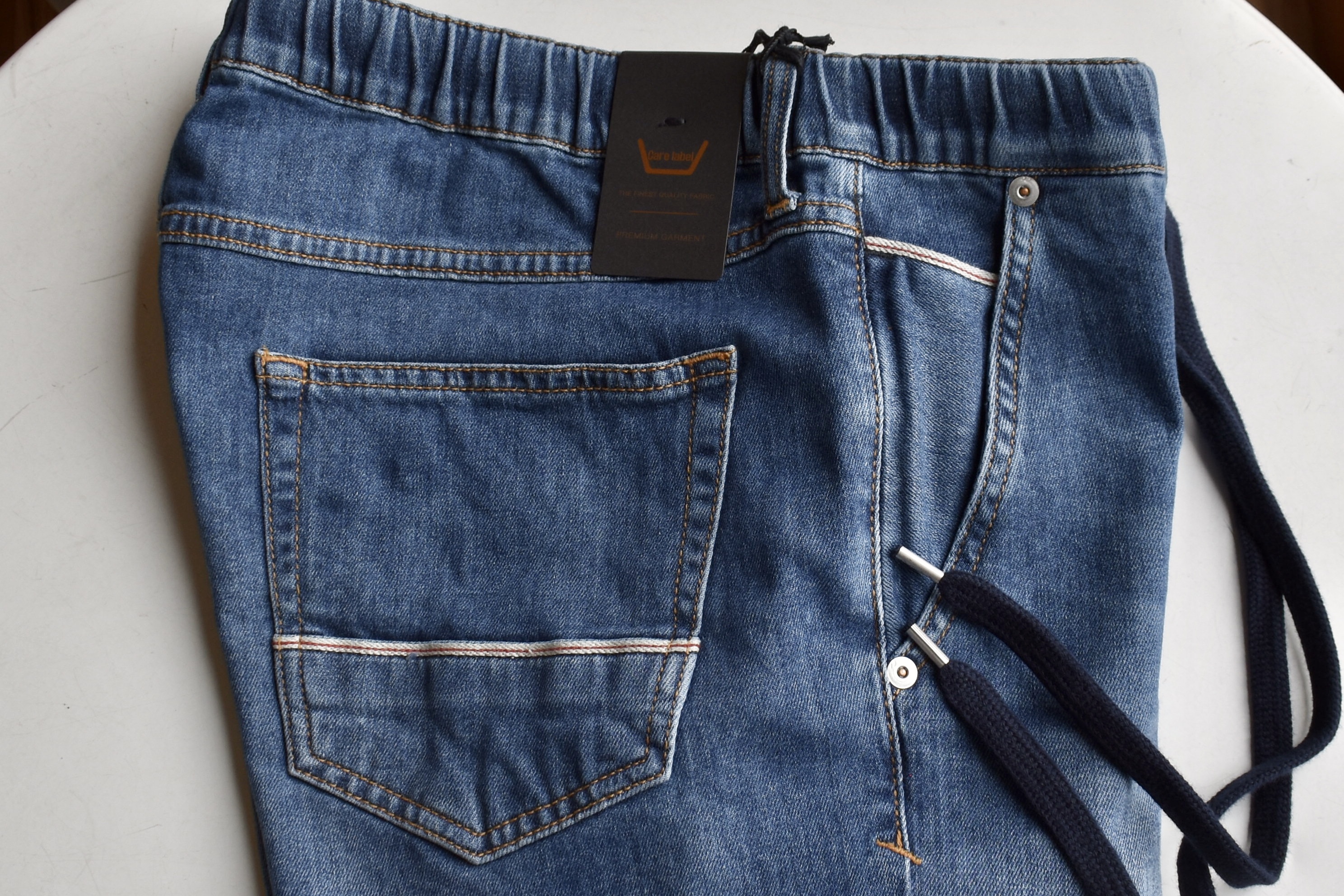 濃からず・薄からずのウォッシュドインディゴブルーは、やや厚みのあるデニムらしい生地。ウエストには、ゴムは入っておらず、ドローコードのみで調整するタイプです。