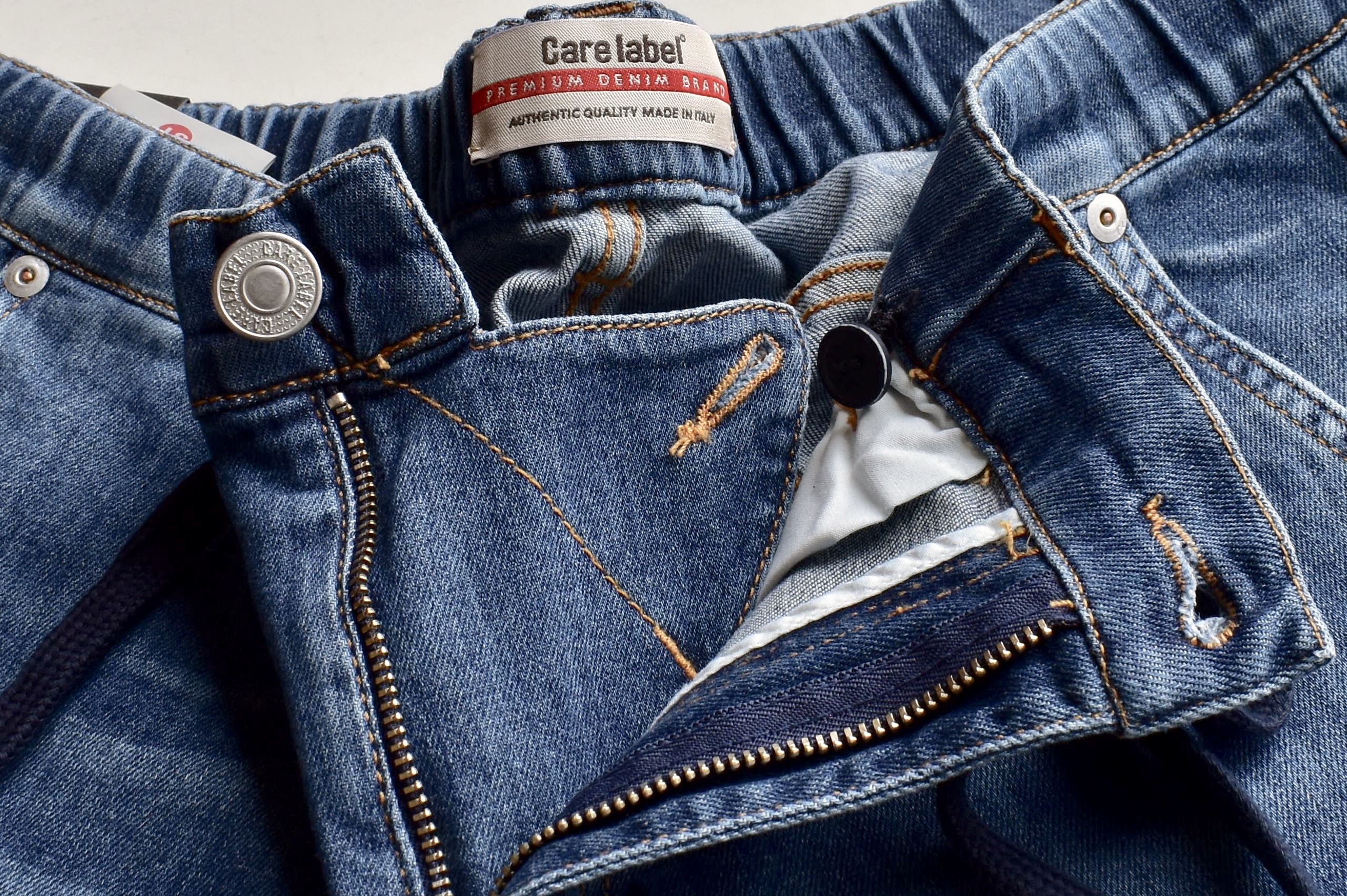 綺麗なデニムブルーです。特にウエスト部分は表情豊か。写真では見えませんが、フロントはジップフライとなっています。