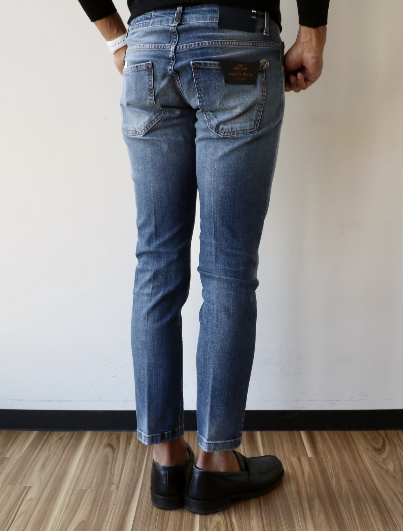 ローライズで、腰骨の下で穿く感覚です。元々ローライズのものが多いアントレアミの中でも、さらに浅め。その分ウエストは大きめに作ってあります。カットソーやニットをタックアウトで合わせてみてください。シャツのタックインには向きません。吸い付くように細いシルエットとともに、他のパンツブランドにはないシルエットを描き出しますので、細いパンツがお好きな方は、要チェックです。
