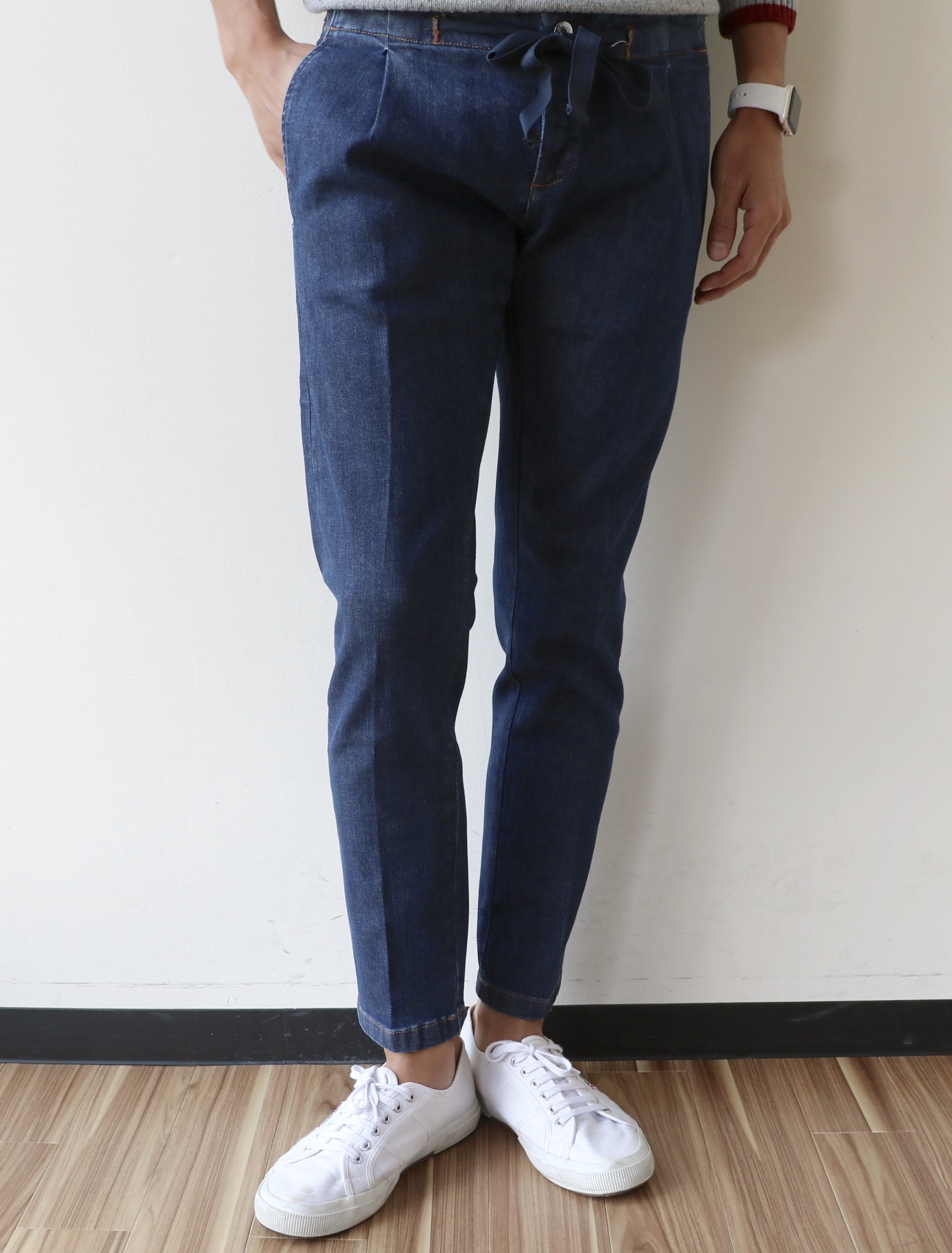 ベルト要らずで、ラフに見える表情からか、昨今支持を集めているドローコードパンツ。デニムであっても良いのではないかということで、ドローコード付きのデニムを選んでみました。ファイヴポケット型ではなく、小振りなワンプリーツ入りのデニムスラックス型であること、また、股上の浅いローライズであることが大きな特徴です。