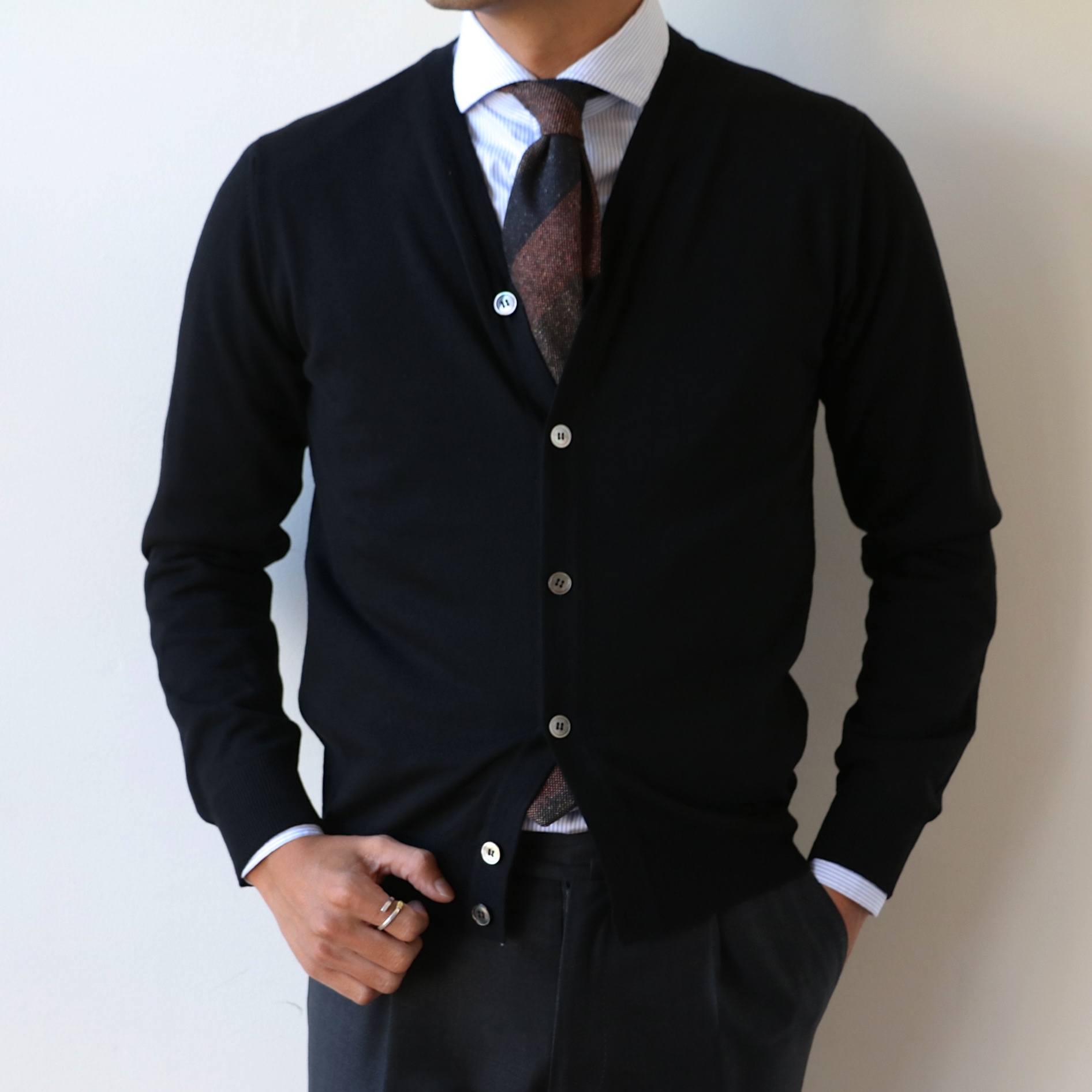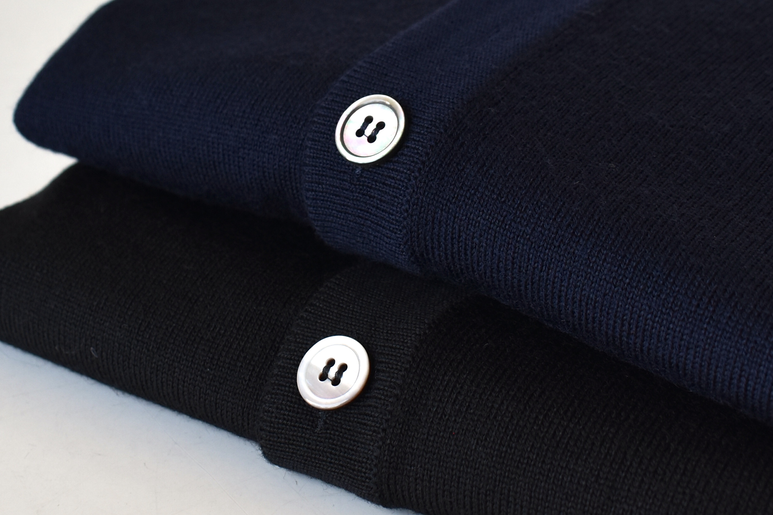 10月14日に張り切ってご案内をした【morgano/モルガーノ】の12ゲージのハイゲージニット。12ゲージのちょっとした厚みが大好きです。こちらも、同じく12ゲージ。オンオフ兼用に使えそうなプレーンなカーディガンは、濃色のネイビーとブラックをご用意しました。