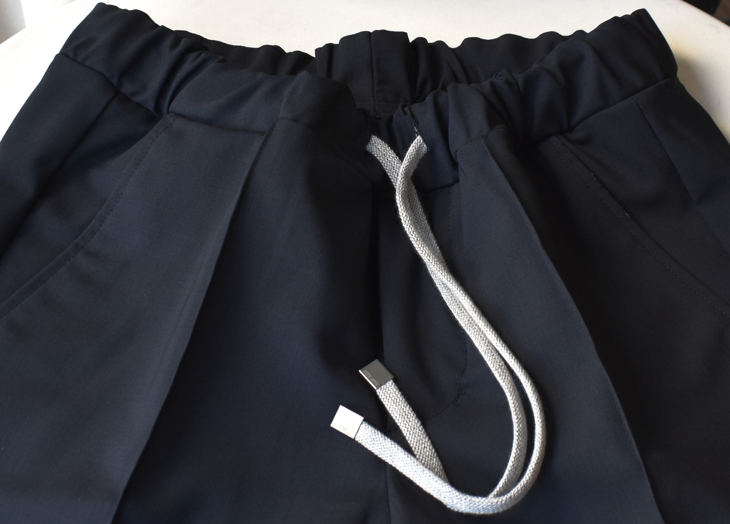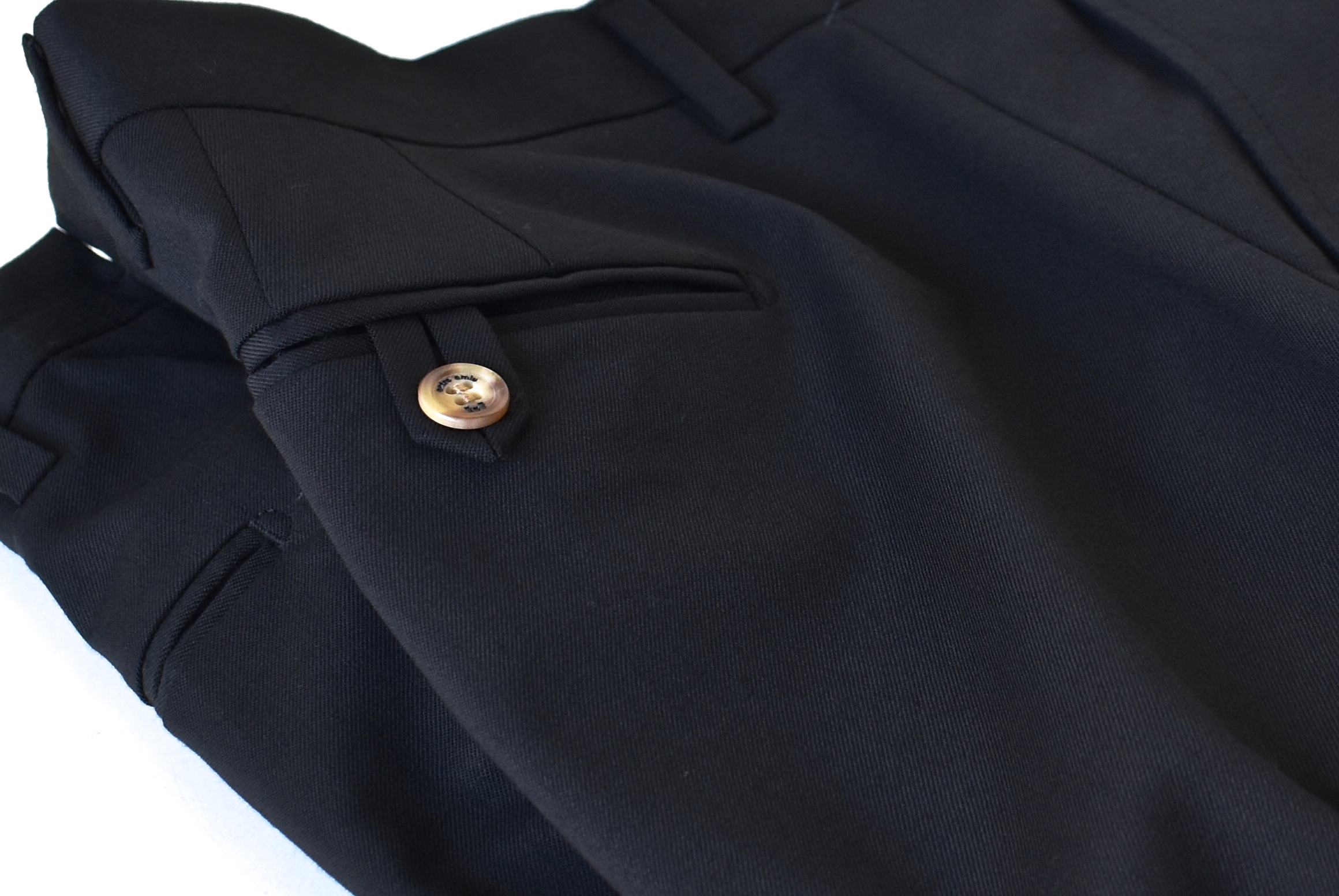 色味ですが、黒だと思っていました? こう見えて、ほんの少し青みを帯びたダークネイビーです。陽に当たったり、黒と並べてみるとよく分かると思います。中央に浮き上がったクリースは、ステッチが入っている為、永久クリース。ドレッシー&モードな表情をアピールします。