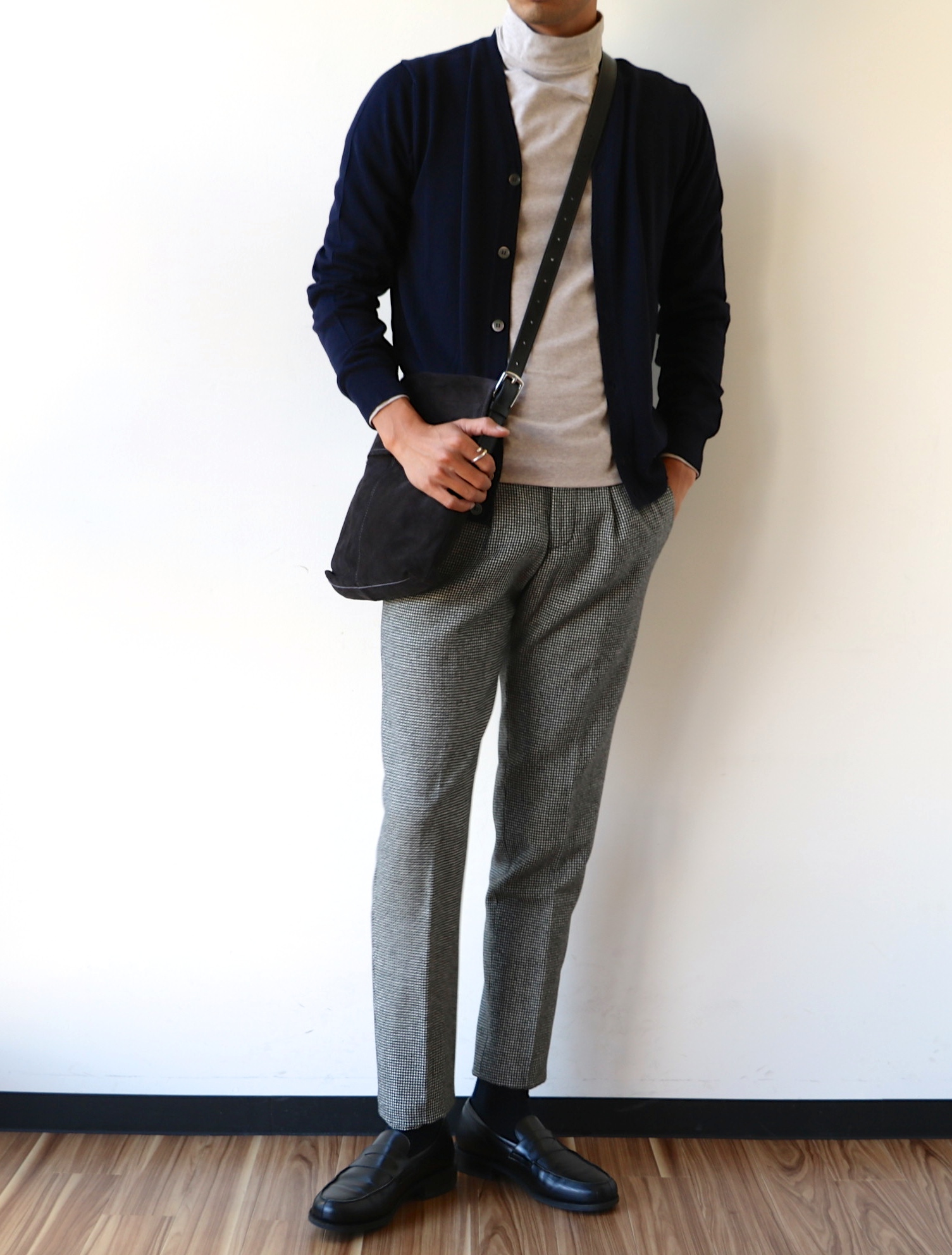 今このタイミングでご紹介しておきたいのは、カーディガン。秋の軽めな羽織りから、真冬の防寒、春の軽装まで、長〜〜〜く付き合える便利なアイテムです。 カットソーはCIRCOLO 1901、パンツのBRIGLIA 1949・バッグのDaniel&Bobはどちらも後日ご紹介予定、靴は私物のParabootです。