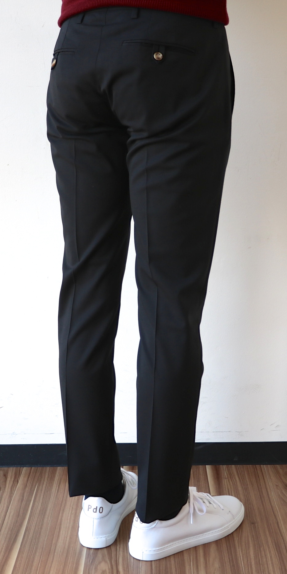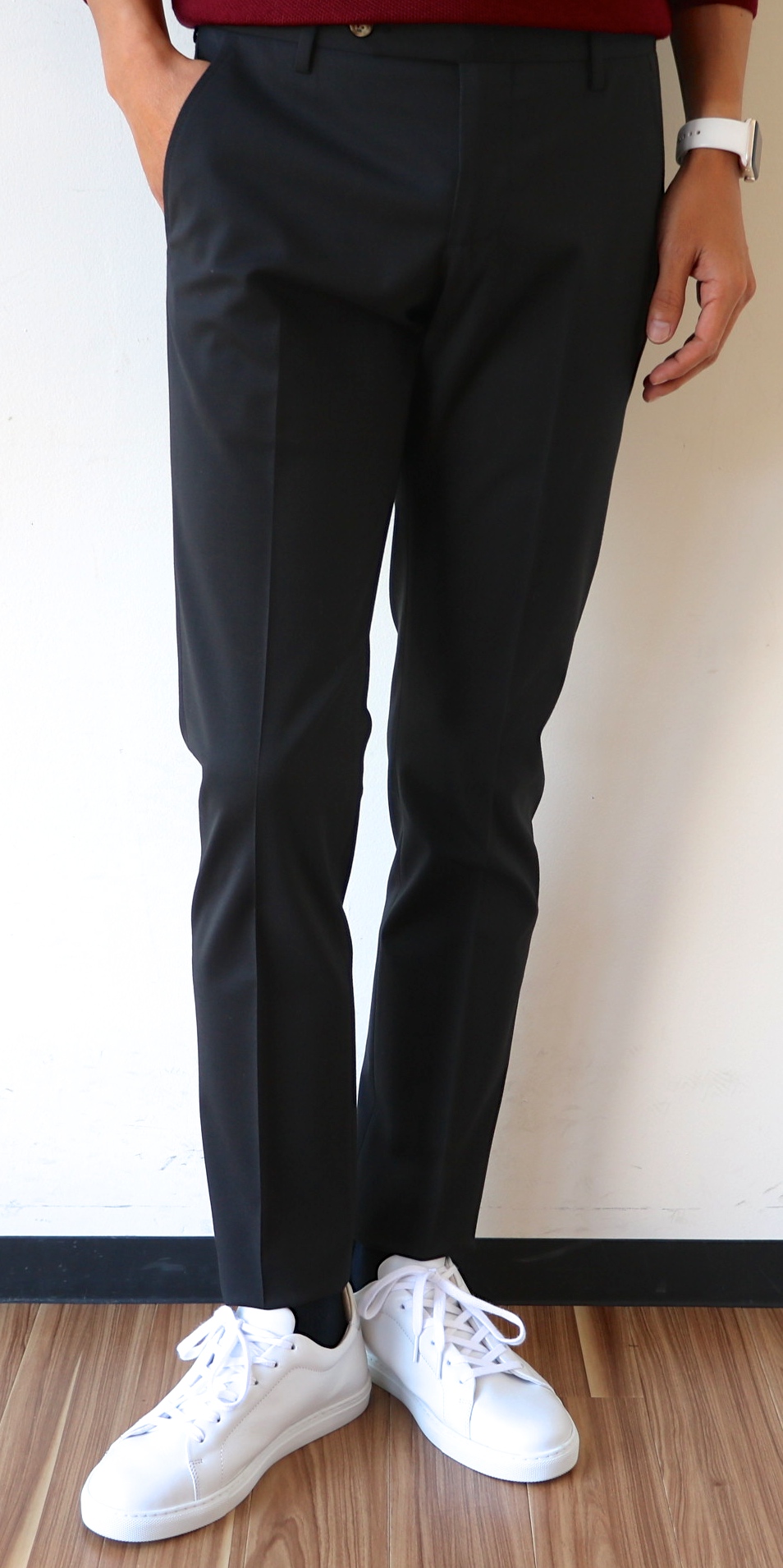毛羽立ちのないドレッシーなウール生地。モード感を漂せつつ、カジュアルに穿きこなしてください。細身の黒パンツを探していた方は、是非とも飛びついていただきたい1本です。