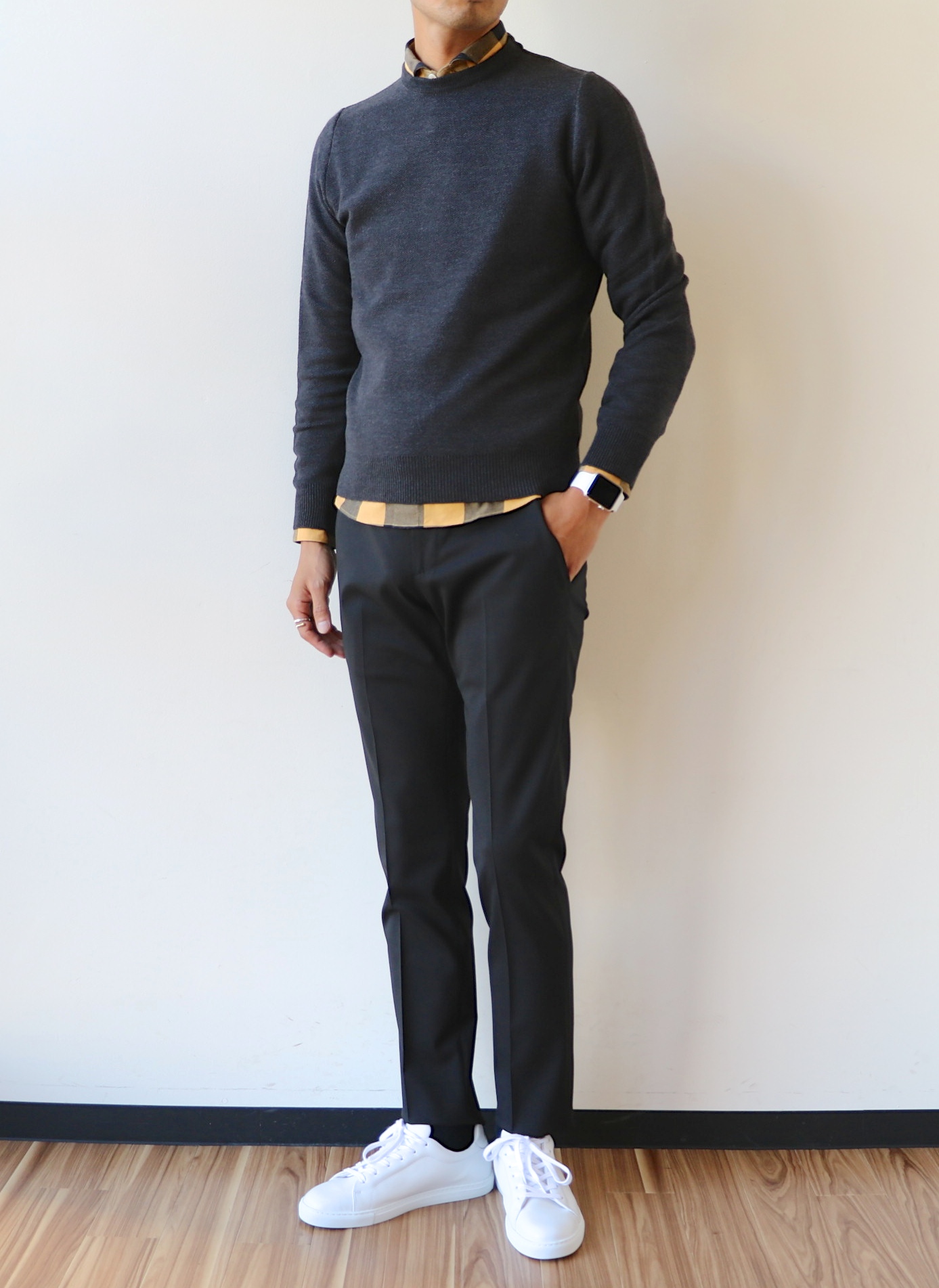一転、ブラックのアイテムとコーディネート。モダンやモードなテイストの着こなしでも、すんなり馴染んでしまいます。これは、活躍しそうです。 ニットポロ:CIRCOLO 1901 パンツ:entre amis(本日ご紹介) スニーカー:Pantofola d'Oro