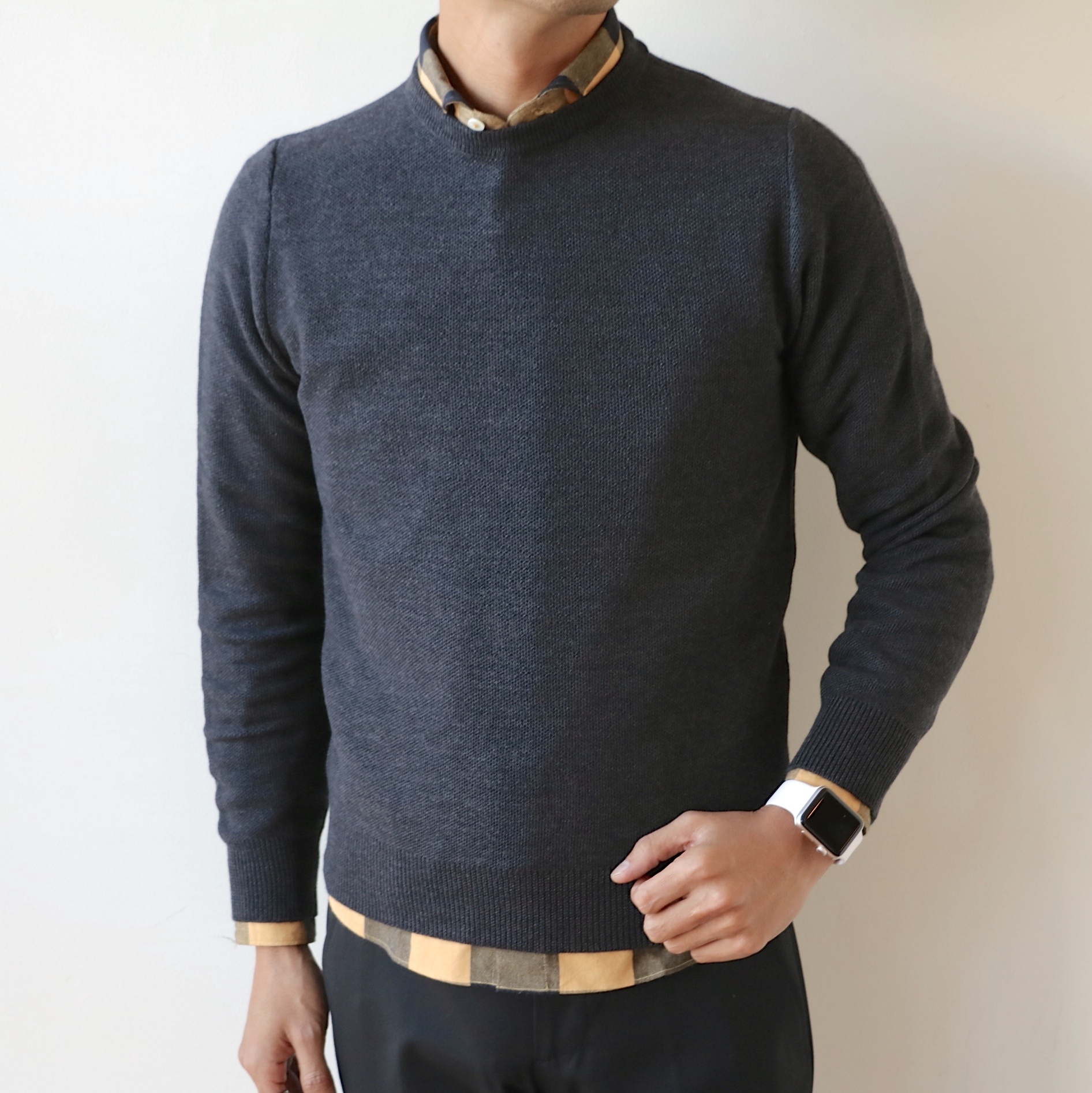 柔らかくてとっても着やすいので、気軽にトレーナー感覚で着ると良いのではでしょうか。重ね着もしやすい(シャツ:Giannetto)ですし、冬の重厚なアウターの中にもお勧めです。