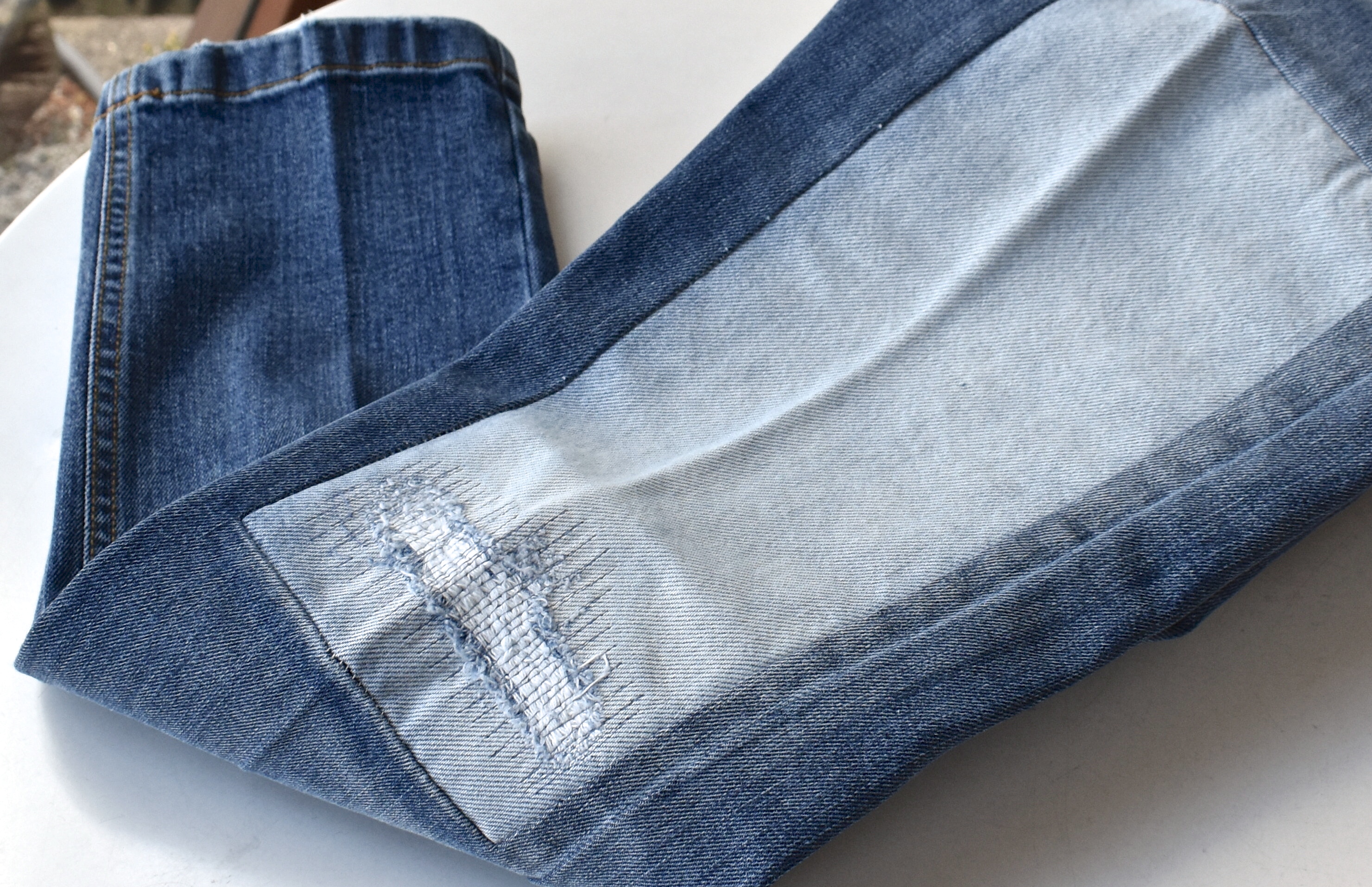 ダメージ(大)にはミシンで加工が加えられ、裏には当て布有り。ダメージ(小)が随所に散らばり、全体の表情を整えます。