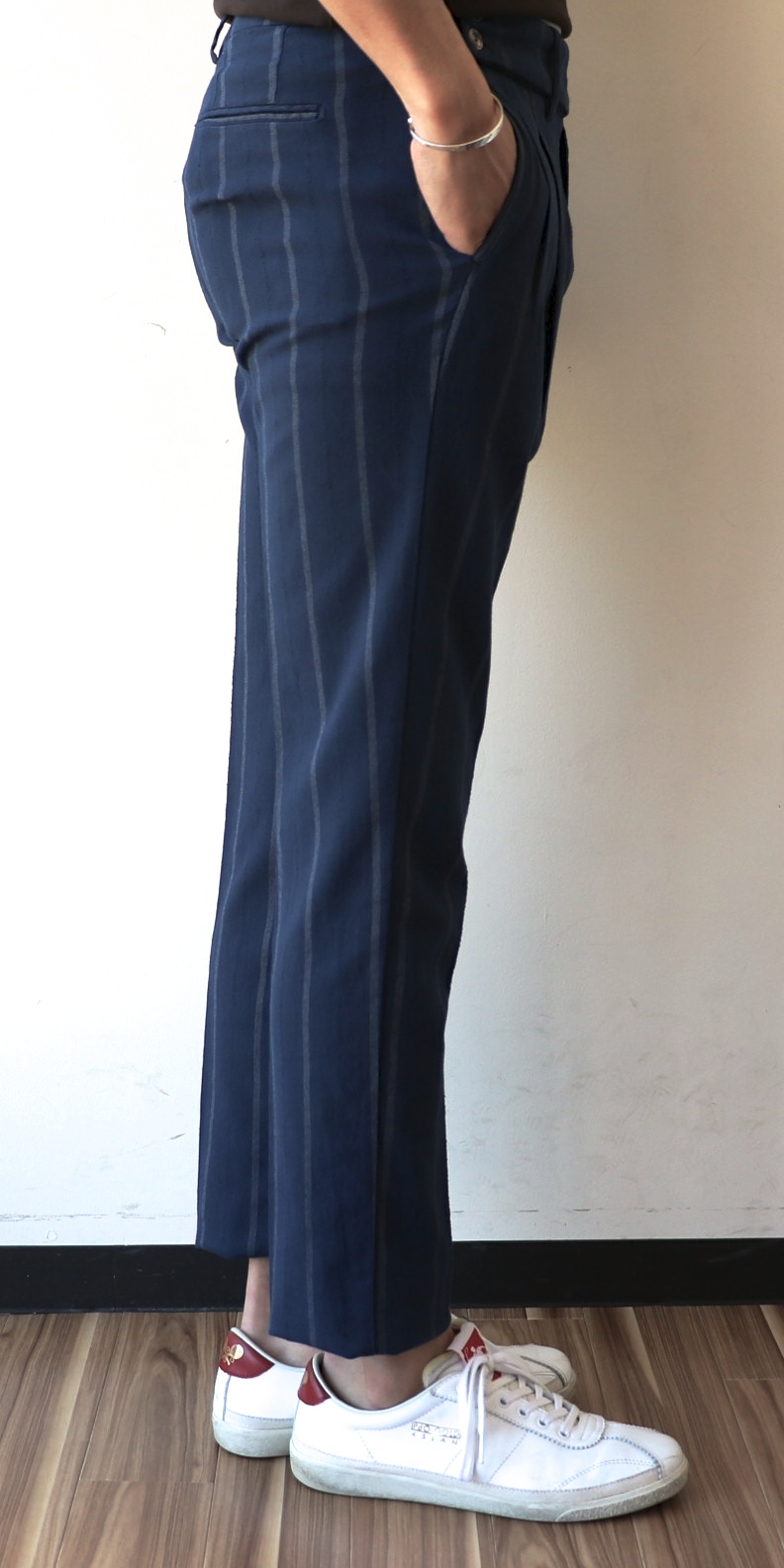 もたつきのない、シュッとしたシルエット。シャーリングパンツがどうも苦手...そんな方にもお勧めです。滑らかなサマーウールの生地は、大変涼しいこともウリであります。身長183cm・体重67kgで、30インチを着用しています。