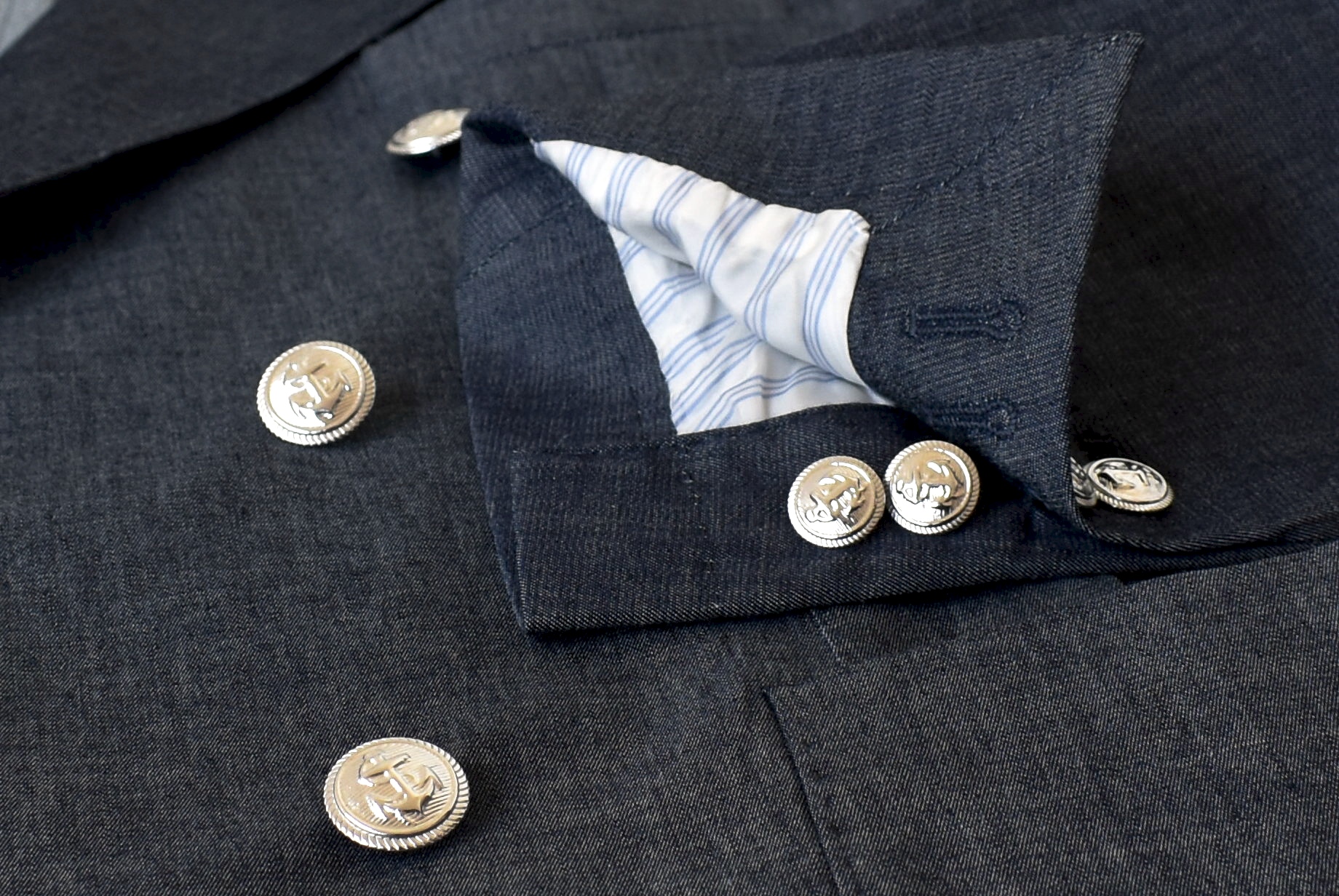 生地は、濃いめのシャンブレーの生地。ストレッチもあり、とても着やすい生地です。憎いのが、アンカー(錨)を刻印したシルバーのメタル釦。これらの組み合わせが、心に刺さりました。