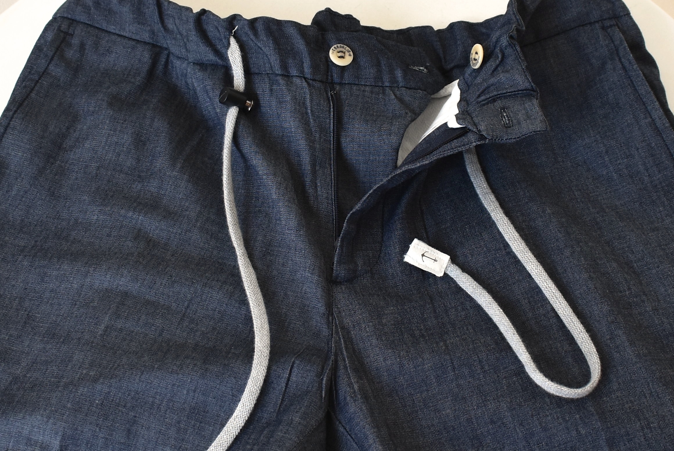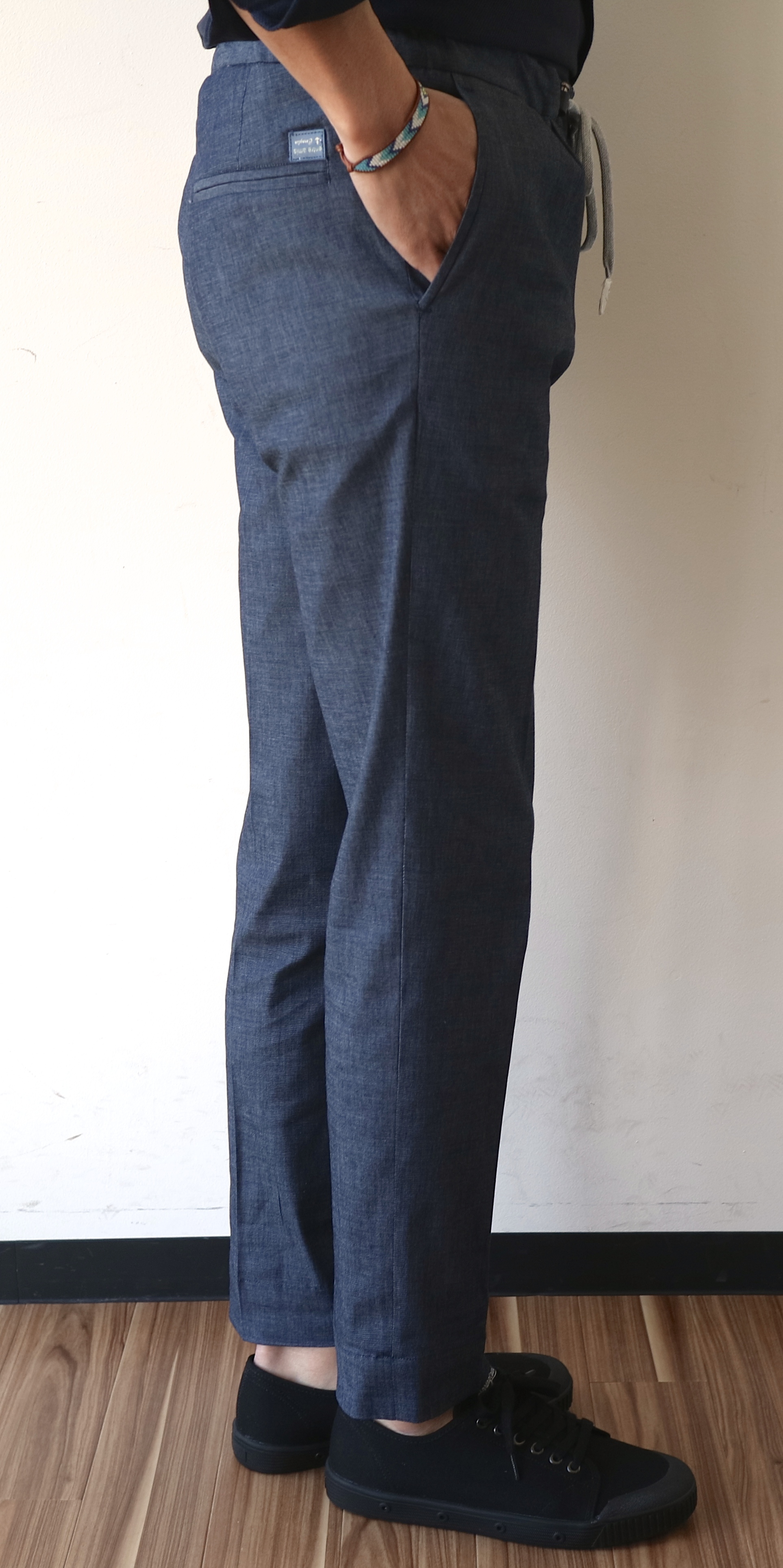 共生地のパンツは、ゴム付きのウエストで、尚かつドローコード付き。シリーズのコンセプト通り、ベルト要らずのリラックスパンツです。