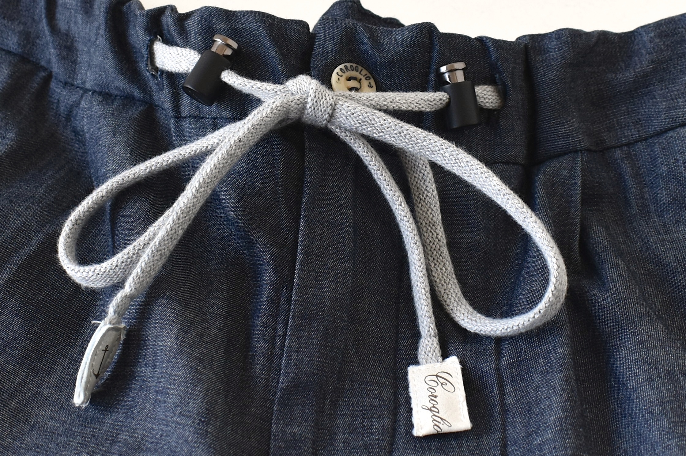 この形、先行でご案内したウールパンツが好評でした。ドローコードにはストッパーが付属しておりまして、紐が出過ぎるのを防いでくれます。