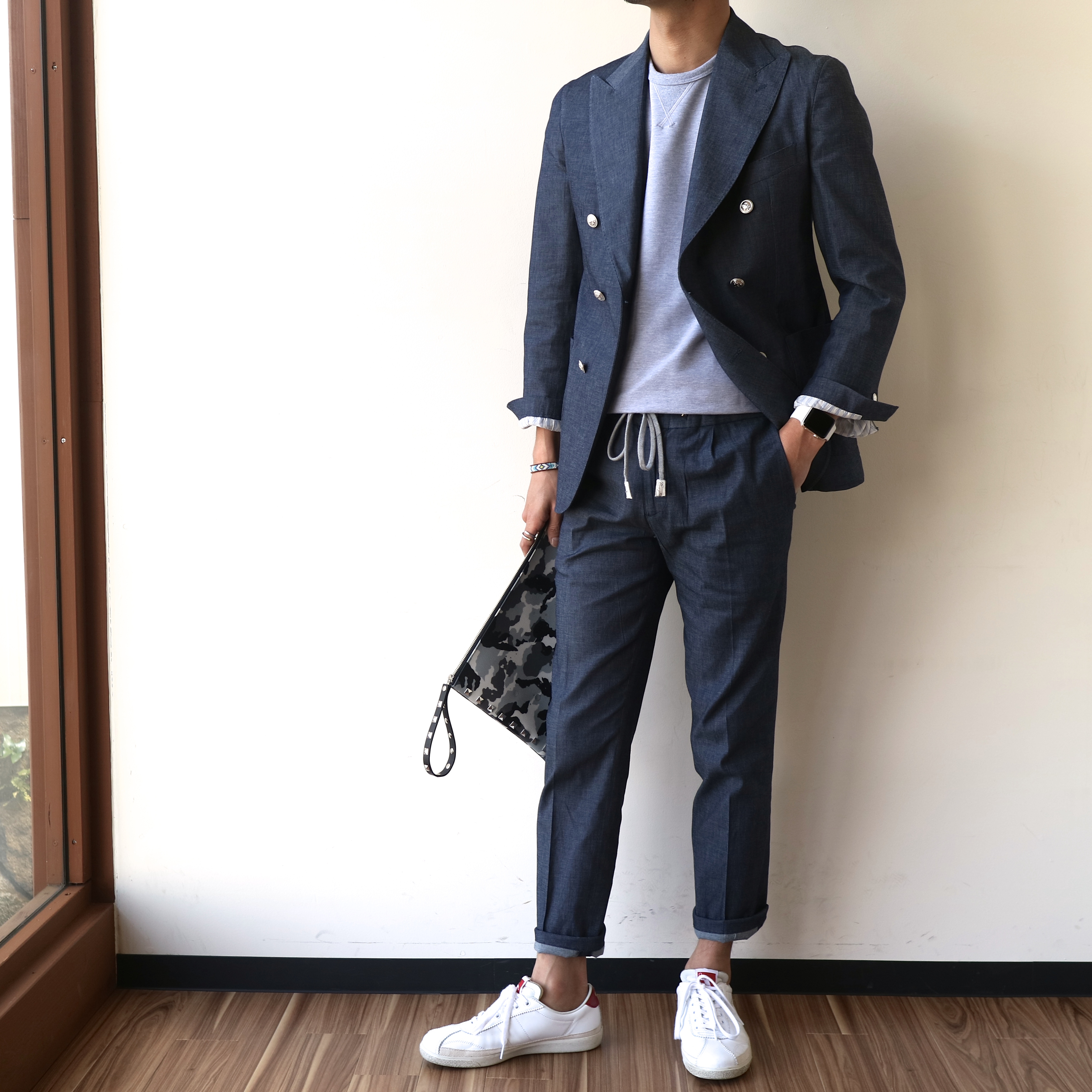 イメージは、昼。出掛け先は...そうですね、海辺なんてどうでしょうか。白Tシャツの上に羽織れる、遊び心のあるセットアップが入荷しました。 インのスウェットシャツーmey story レザースニーカー Pantofola d'Oro クラッチバッグーGENTIL BANDIT ブレスレットーCHAN LUU