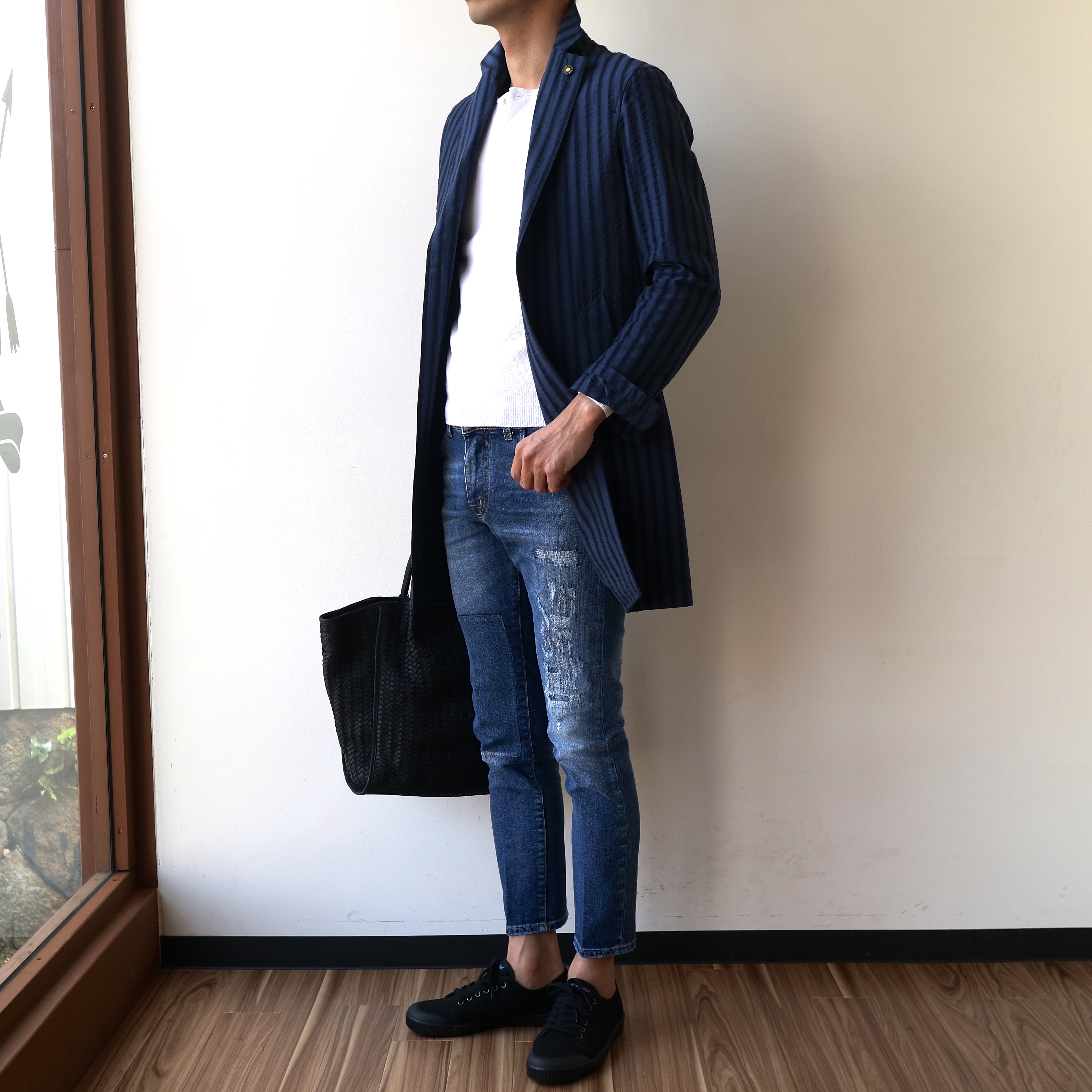 一昨日はGiannettoのサッカー地シャツコートに合わせておりました。モデルは身長183cm・体重67kgで、31インチを着用しております。細いです。タイト目なサイズ感であると申し上げておきます。